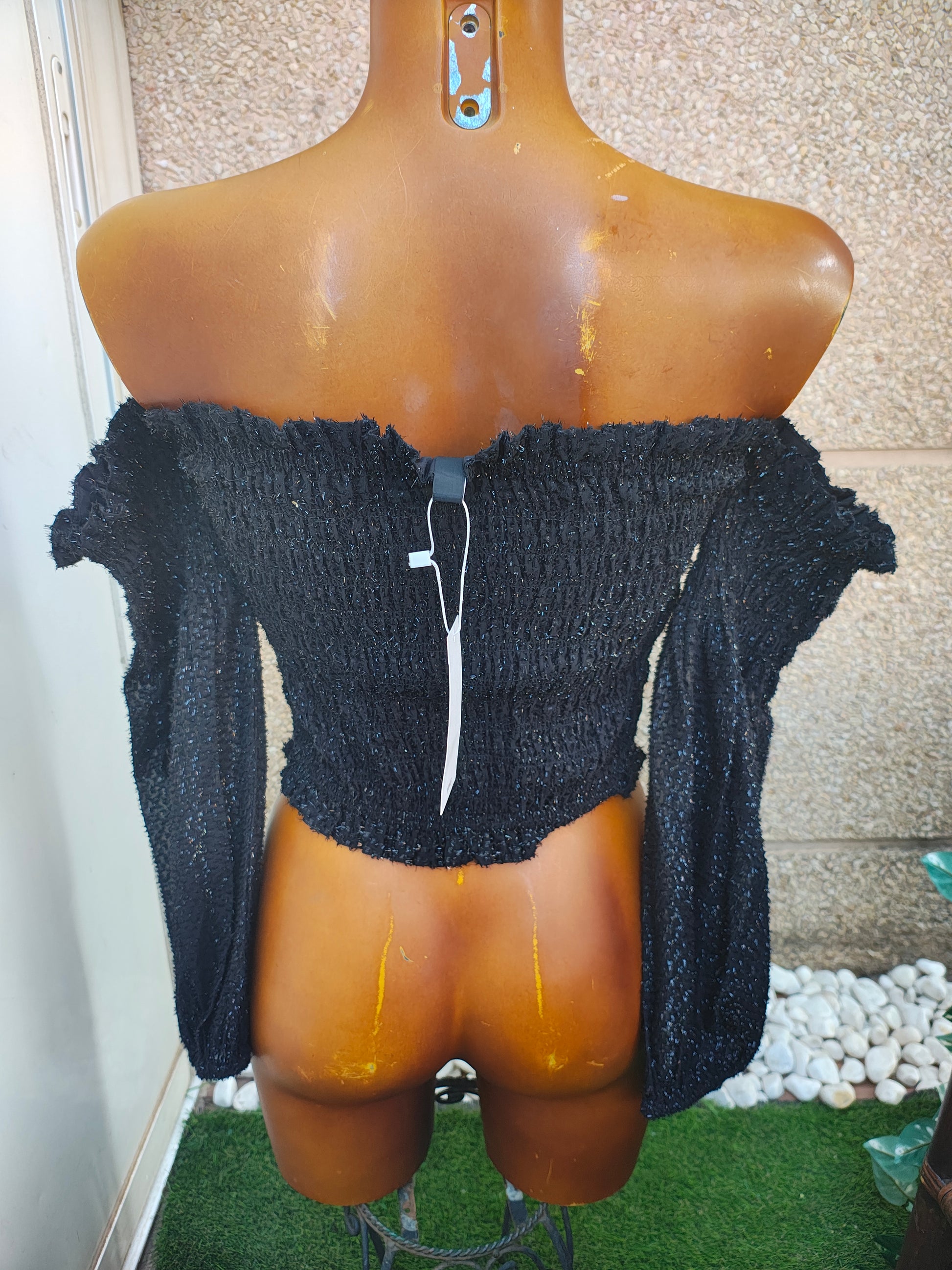 ✨ Blusa corta de mujer con diseño elástico tipo nido de abeja, acabado brillante con hilos sutiles y escote palabra de honor. Incluye mangas largas abullonadas que aportan un aire sofisticado y juvenil. Ideal para combinar en looks de fiesta o salidas de noche con vaqueros, faldas o pantalones de vestir.