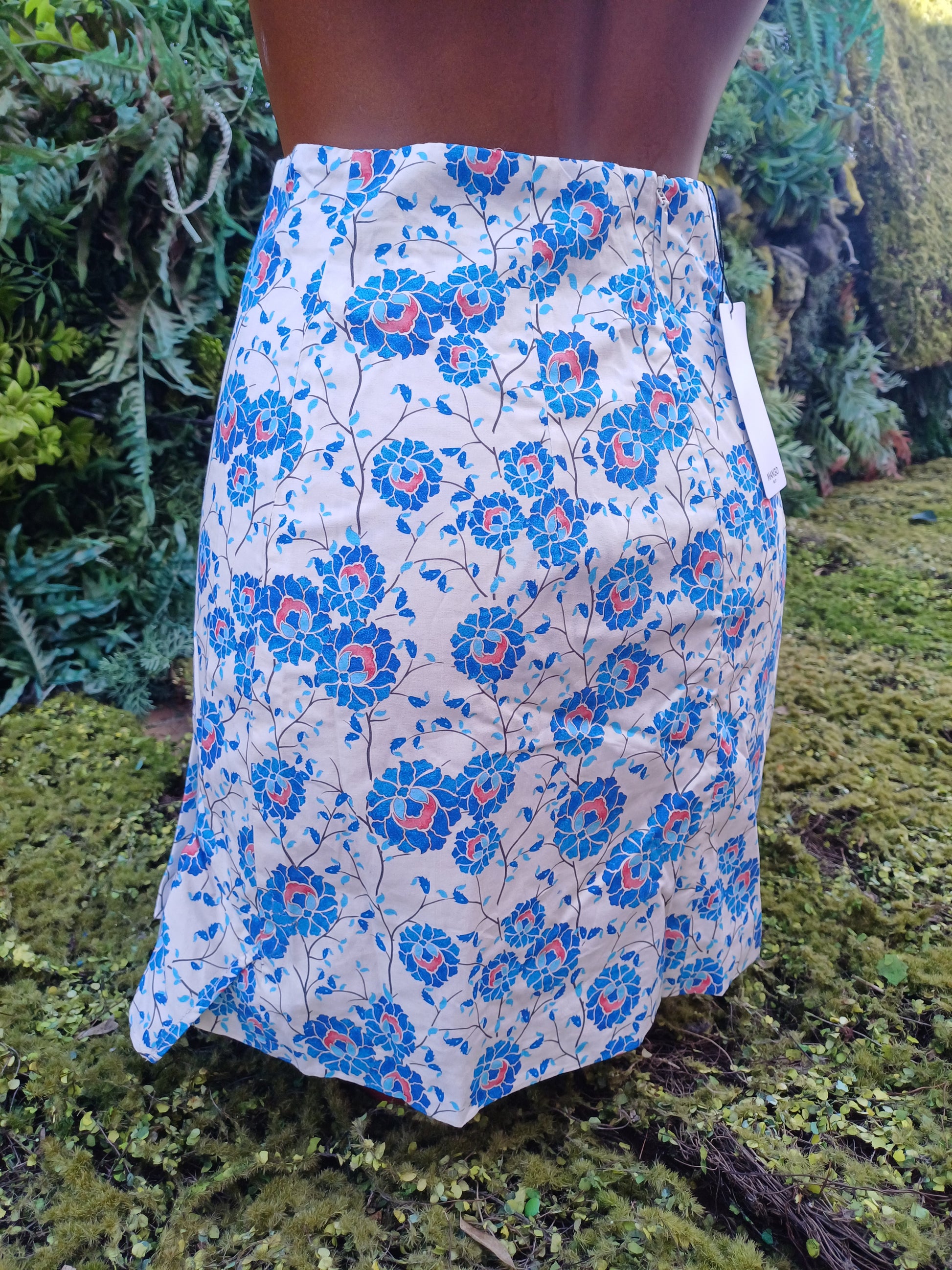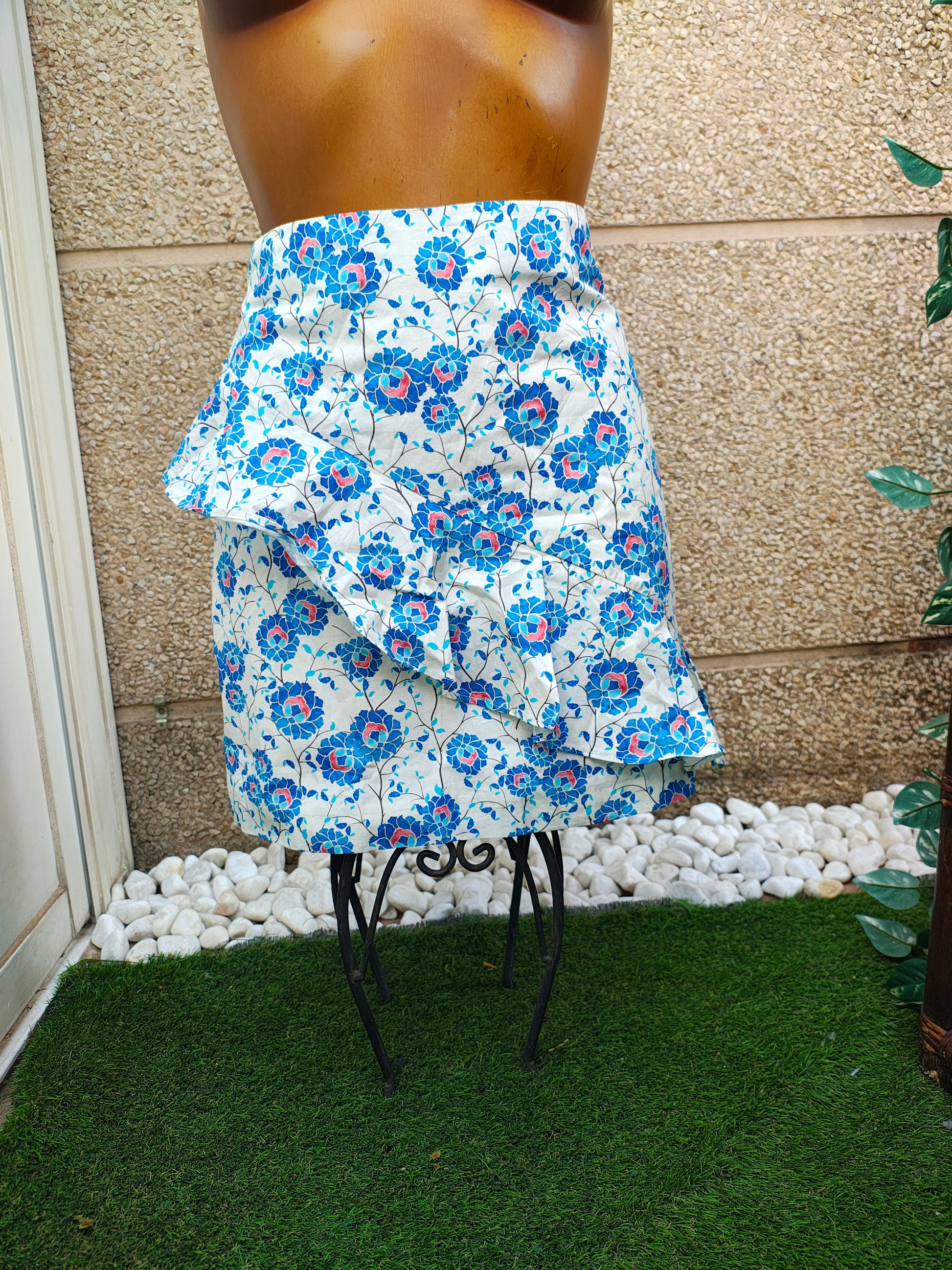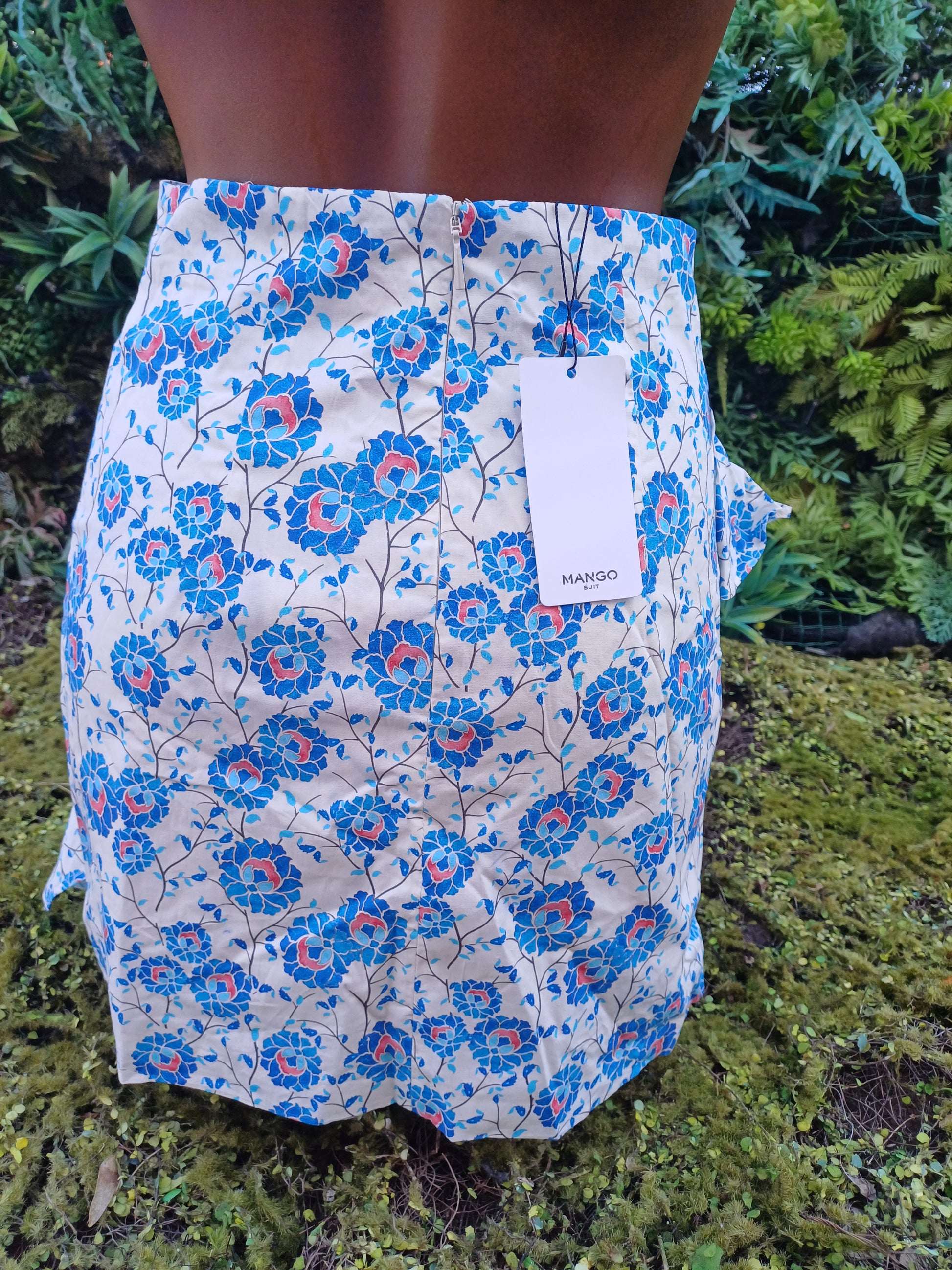 🌸 Falda corta con estampado floral en tonos azules y detalles en rojo sobre fondo blanco. Diseño femenino y alegre, ideal para looks de verano y primavera. Presenta un corte recto con volantes laterales que aportan movimiento y un cierre de cremallera trasera para un ajuste perfecto.