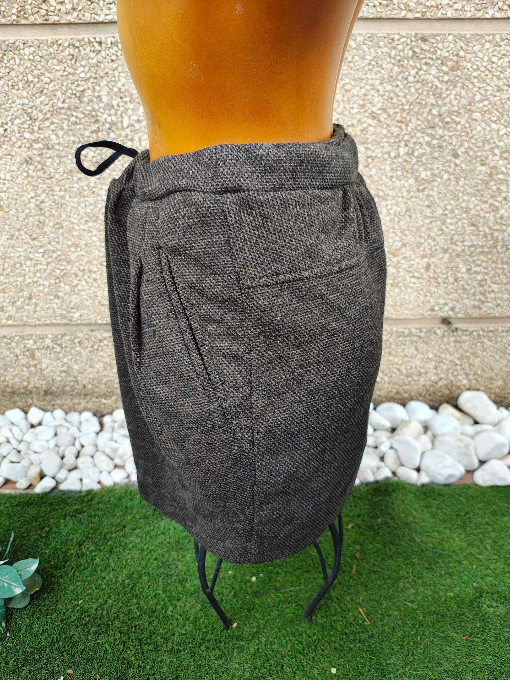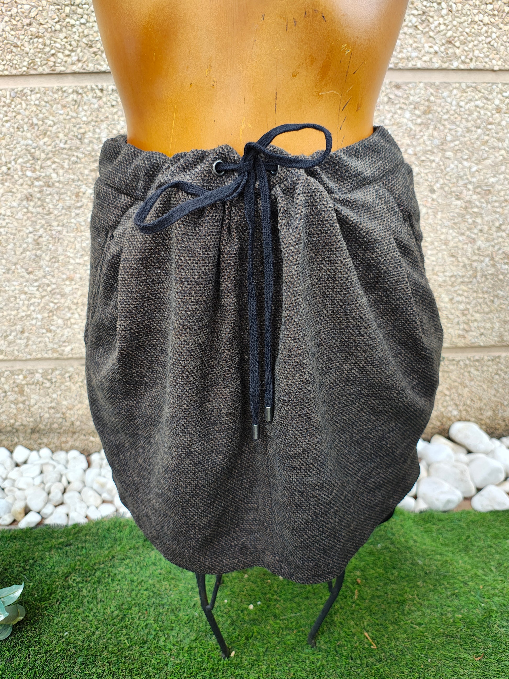 🖤 Falda corta tipo globo en color marrón oscuro con textura tejida. Cintura elástica con cordón ajustable y bajo ligeramente fruncido para crear volumen. Interior forrado para mayor comodidad.
