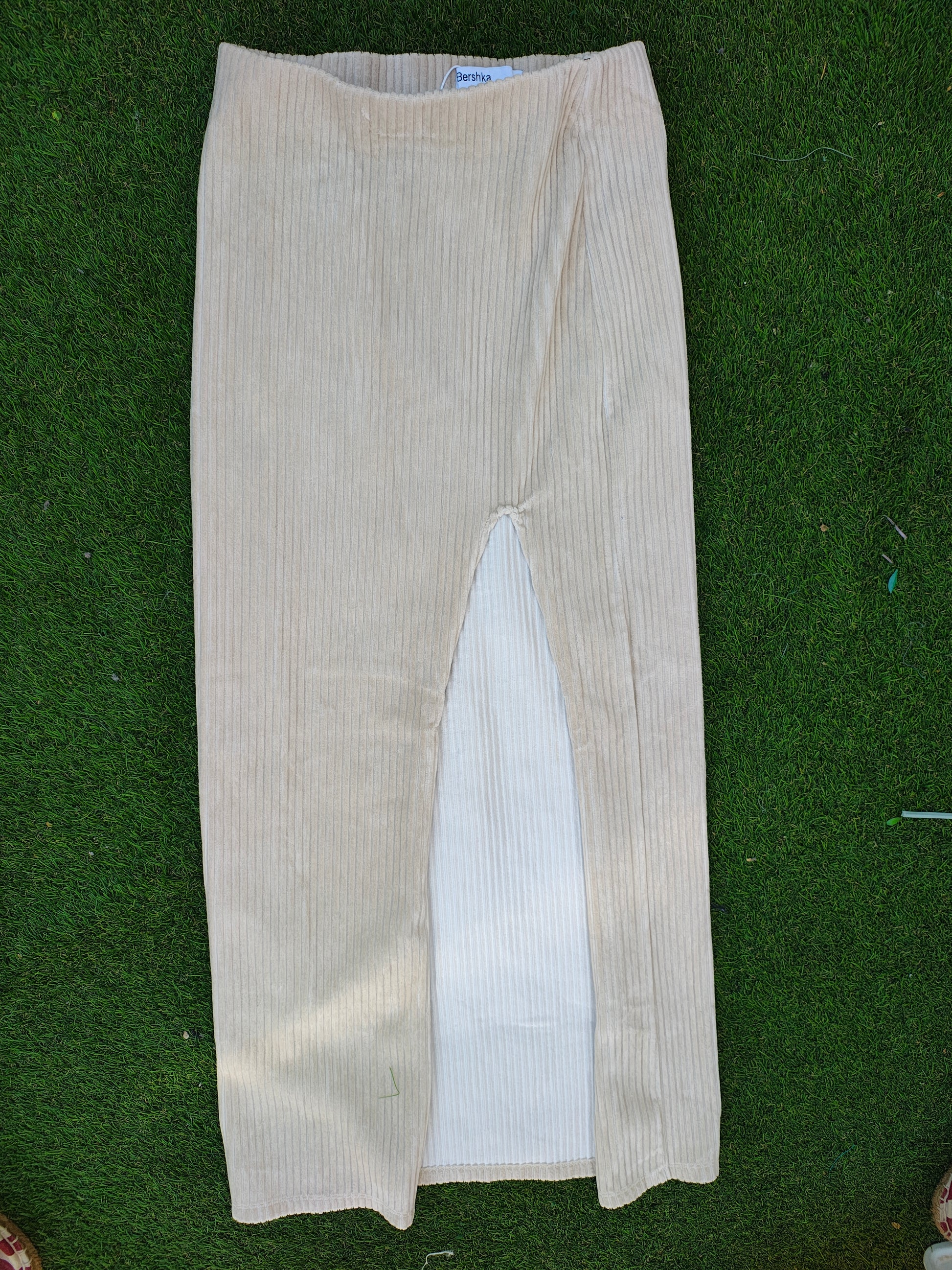 NUEVO – Falda midi beige de canalé con abertura frontal BERSHKA (Talla XS)