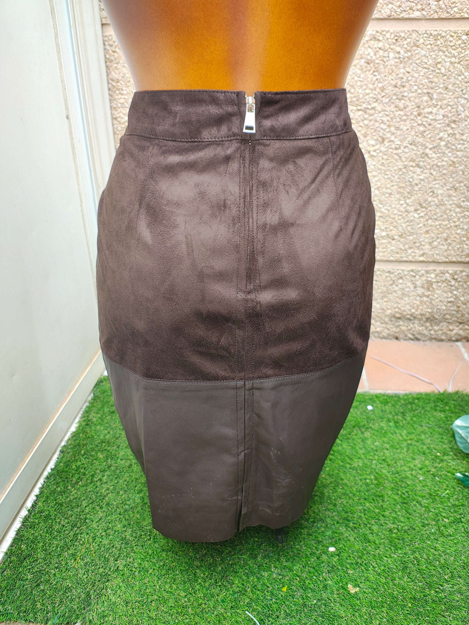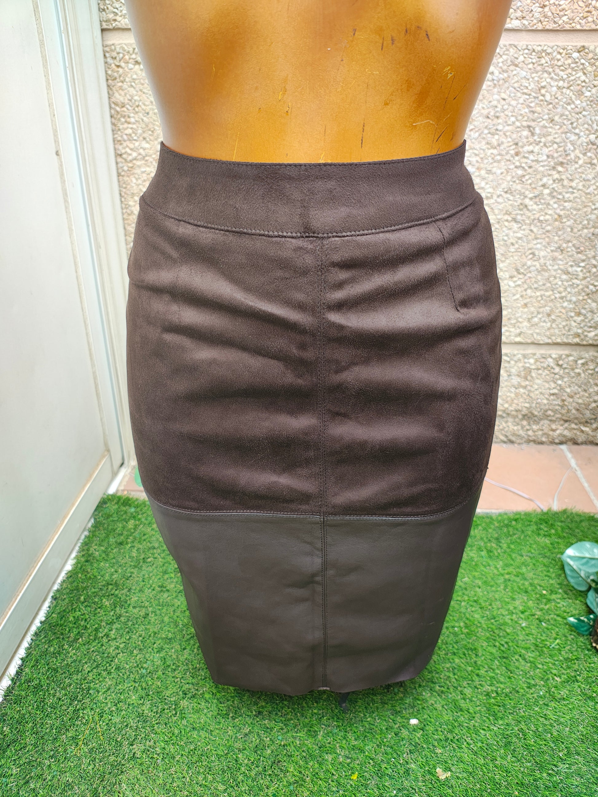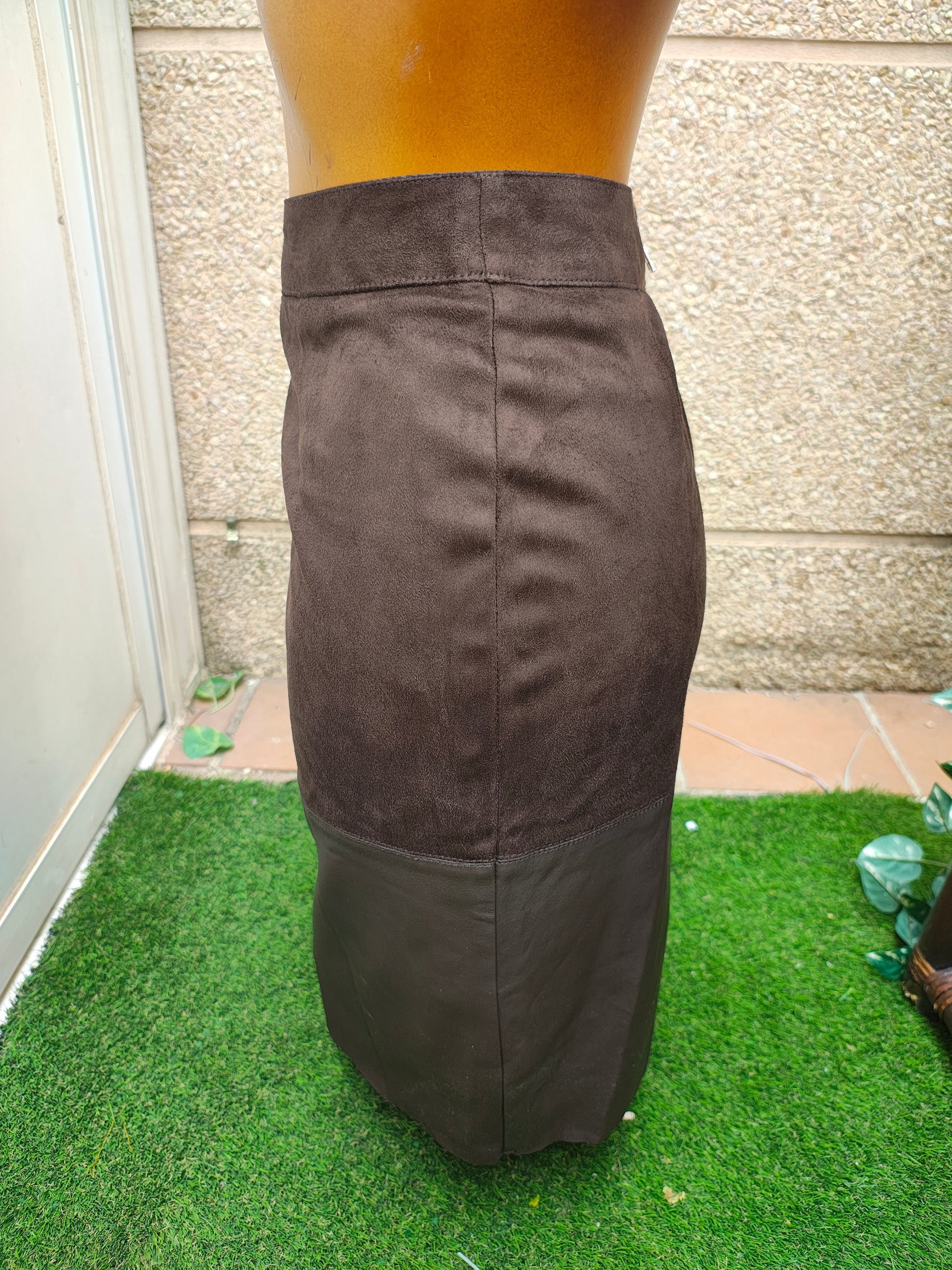 🤎 Falda estilo lápiz de tiro alto en tono marrón chocolate, confeccionada en combinación de tejidos: parte superior de ante sintético y parte inferior con acabado efecto cuero. Diseño sofisticado y elegante que realza la silueta, con costuras verticales que estilizan y abertura trasera para mayor comodidad.