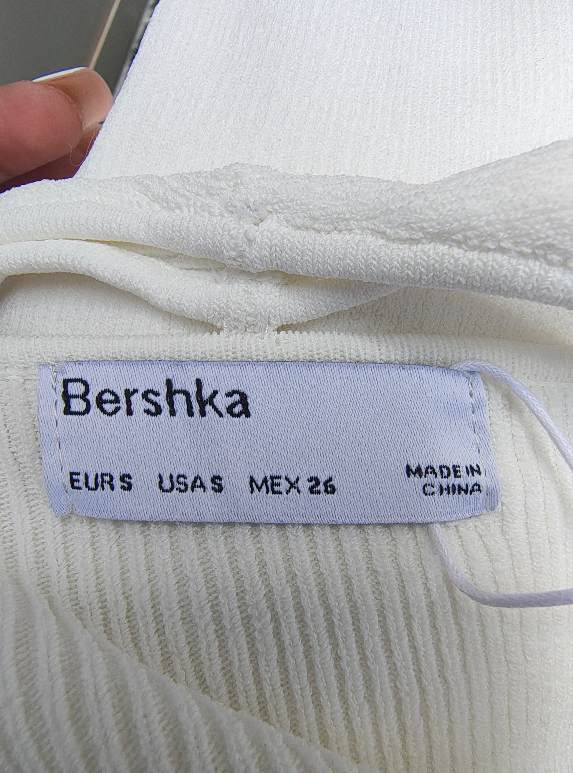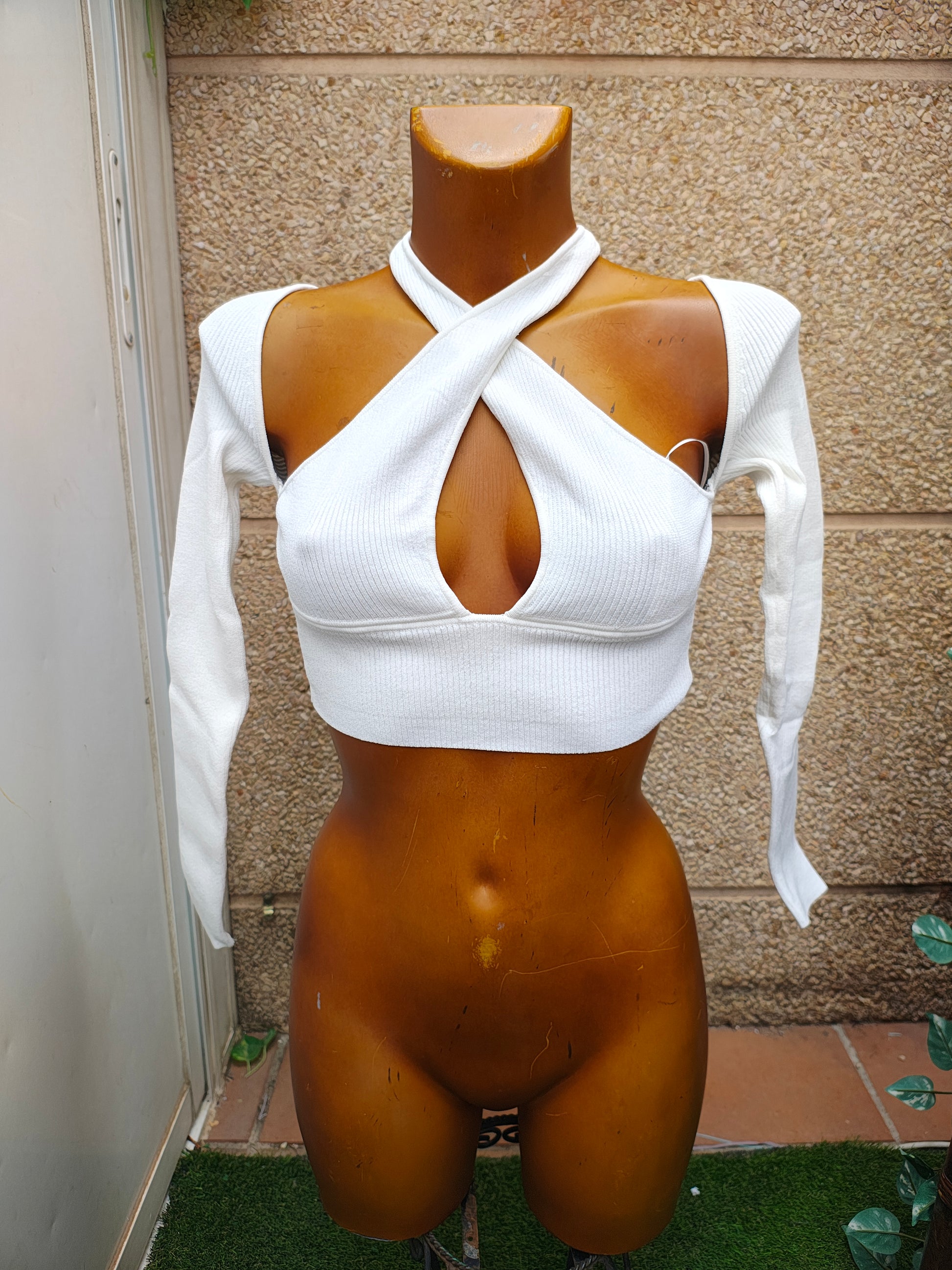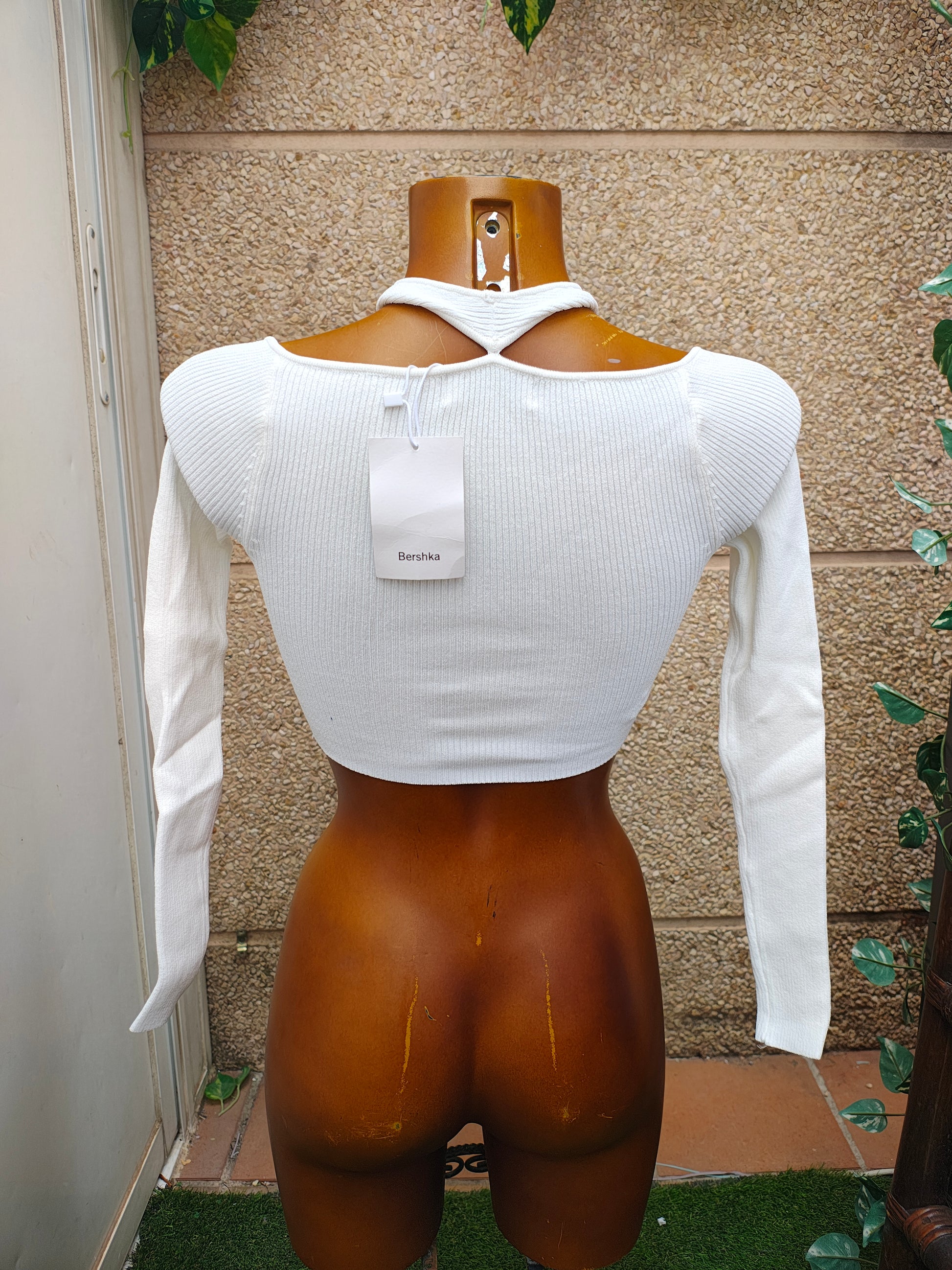 Top blanco de canalé con diseño cruzado en el pecho y escote en pico que estiliza la figura. Manga larga y tejido elástico que se adapta perfectamente al cuerpo. Un básico con mucho estilo que realza el busto y aporta un aire sexy y moderno a cualquier look. Etiqueta original de Bershka incluida.