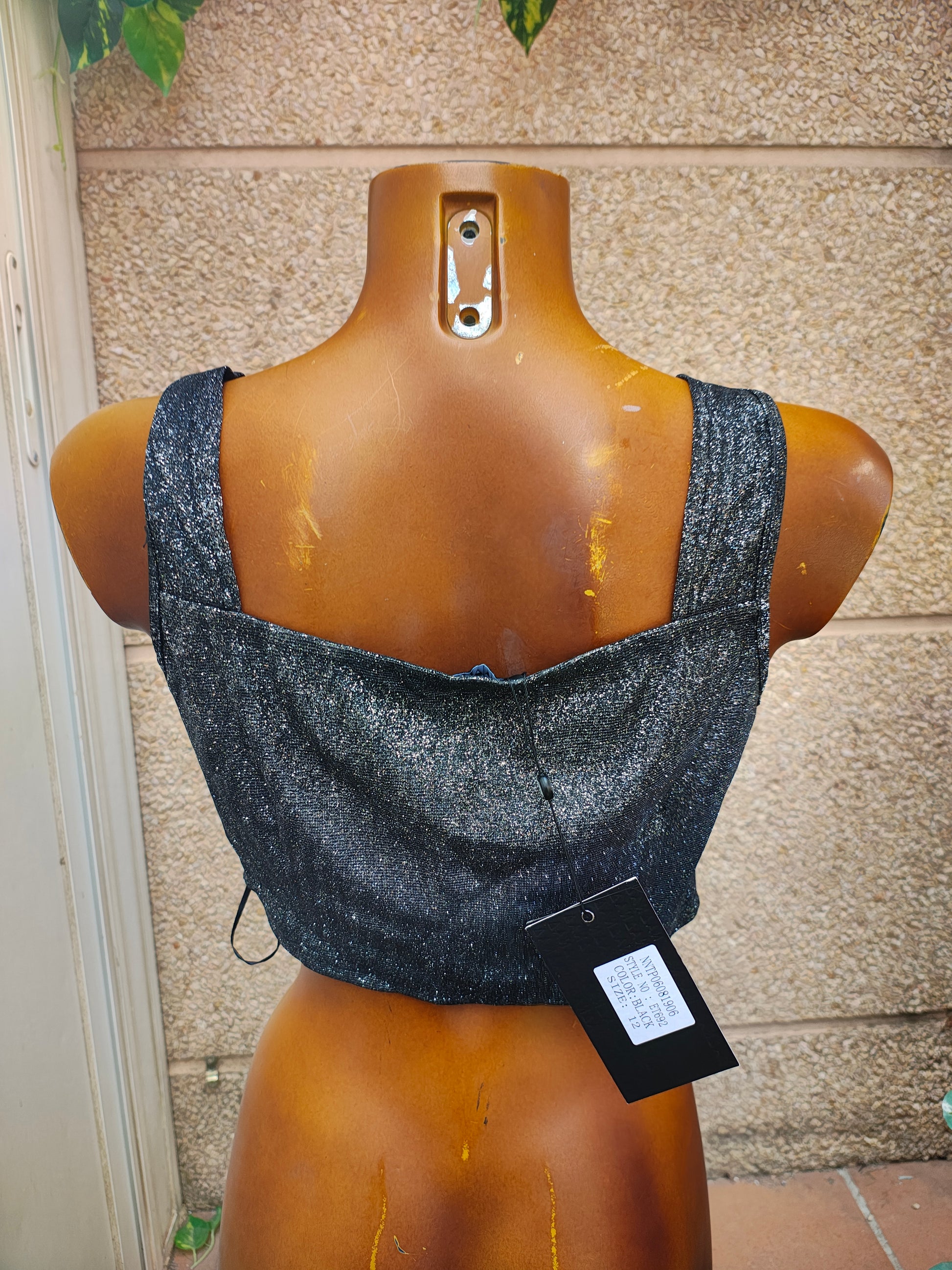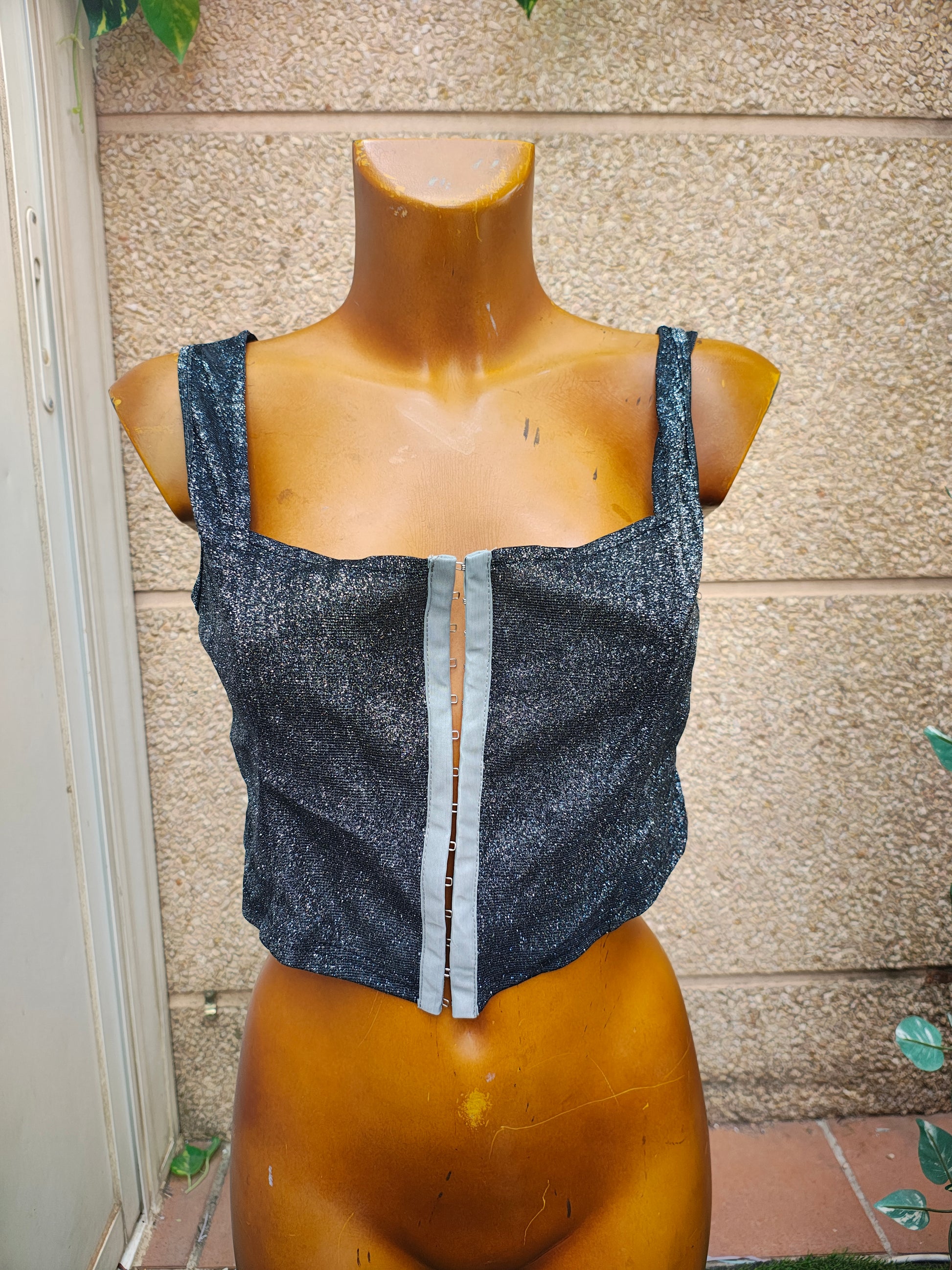 🖤 Top estilo corset corto con tejido brillante en tono negro, ideal para fiestas, noches especiales o looks atrevidos. Presenta escote recto con tirantes anchos y una textura ligeramente elástica que se adapta al cuerpo realzando la figura.