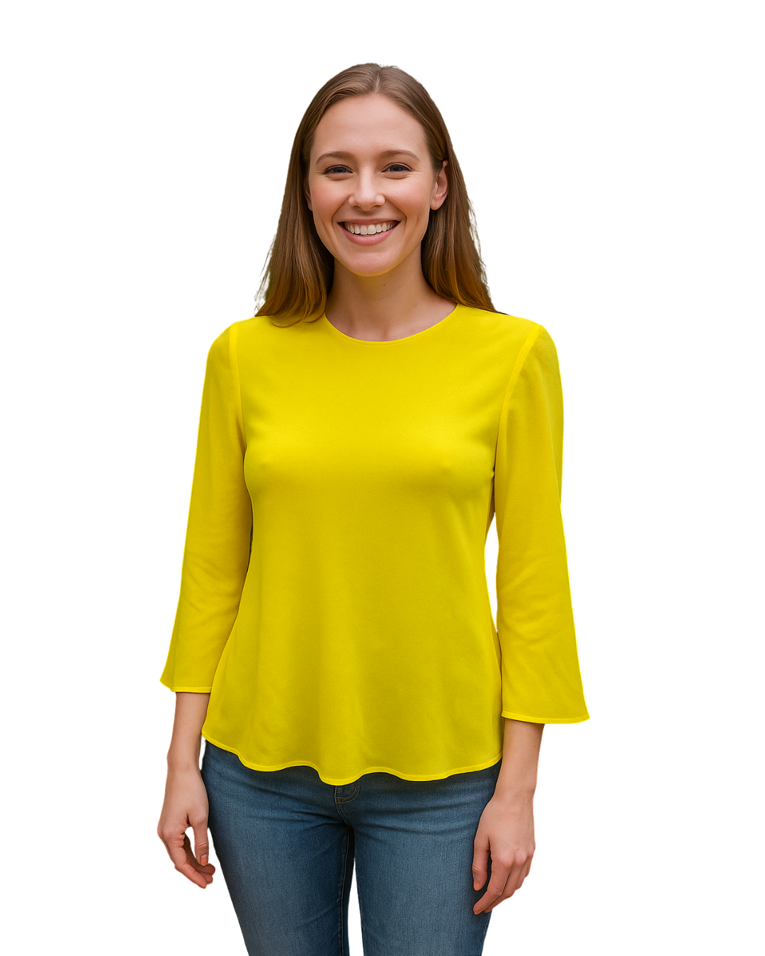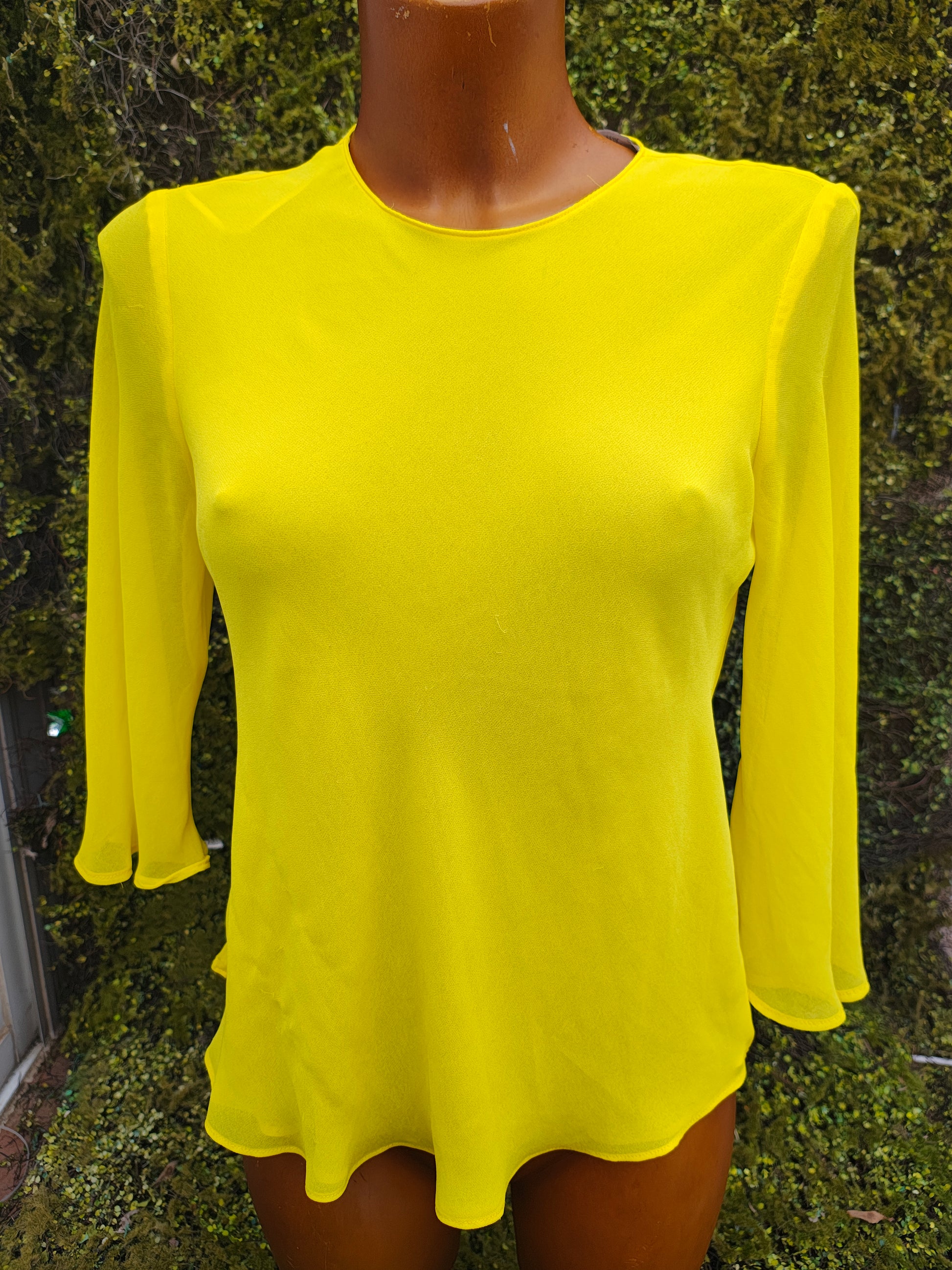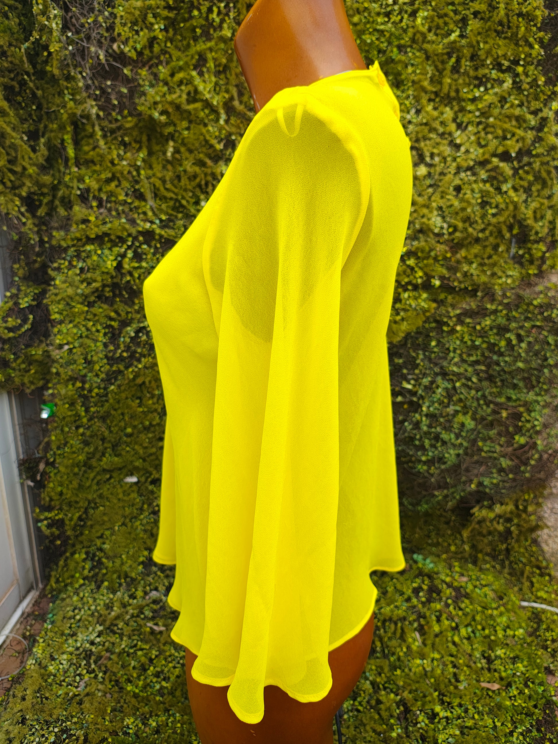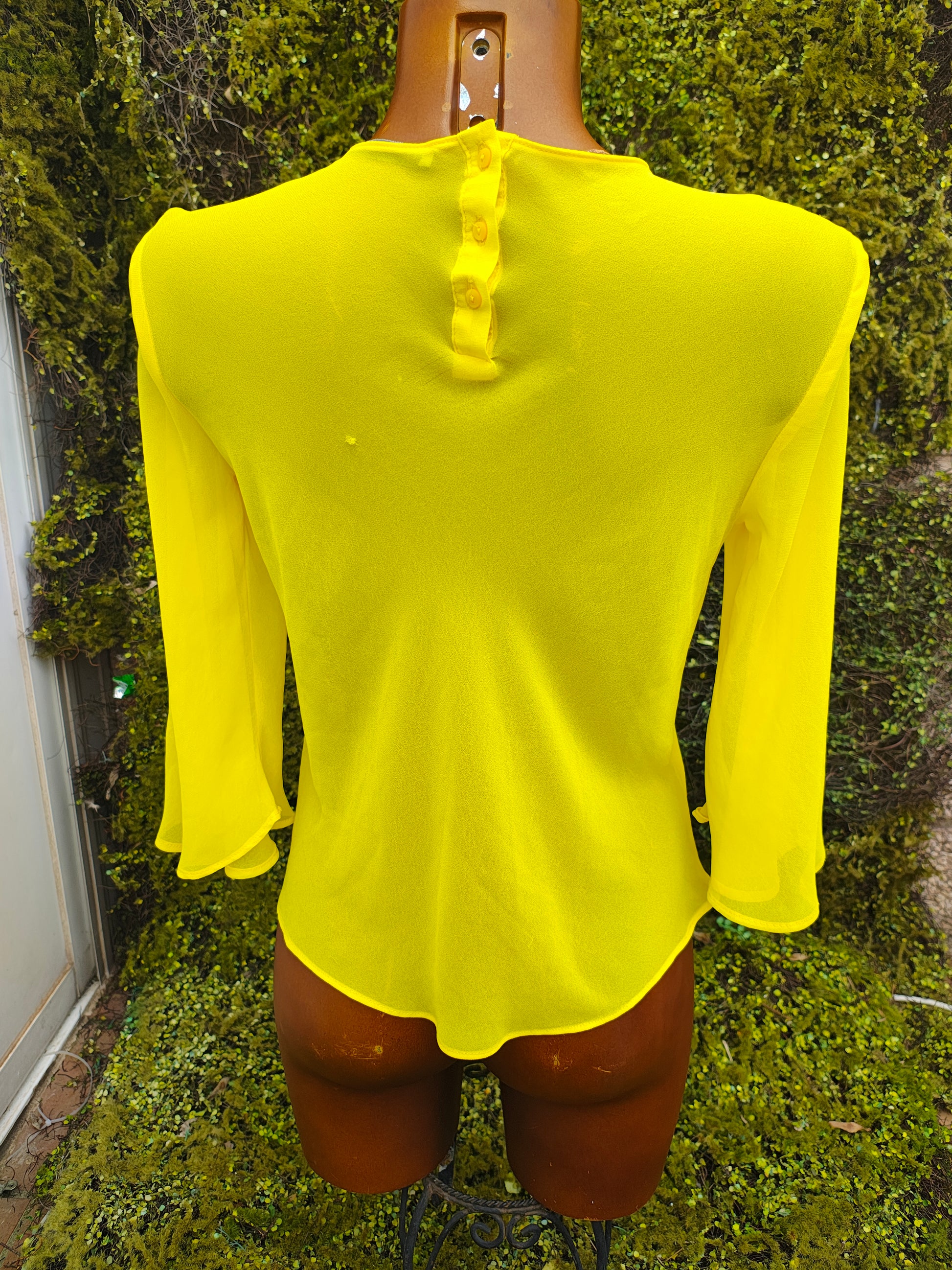 💛 Chemisier en mousseline de soie d'un jaune vif, confectionné dans un tissu léger et semi-transparent au tombé fluide. Il présente des manches longues évasées et des boutons à l'arrière du cou pour une fermeture facile. Sa coupe légèrement évasée ajoute du mouvement.