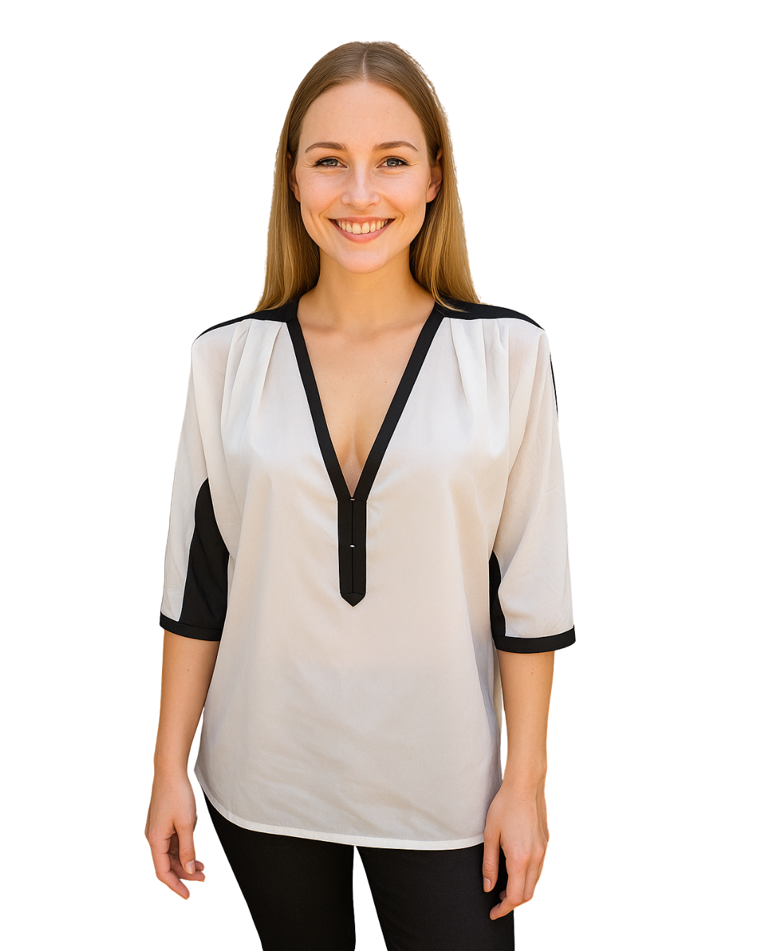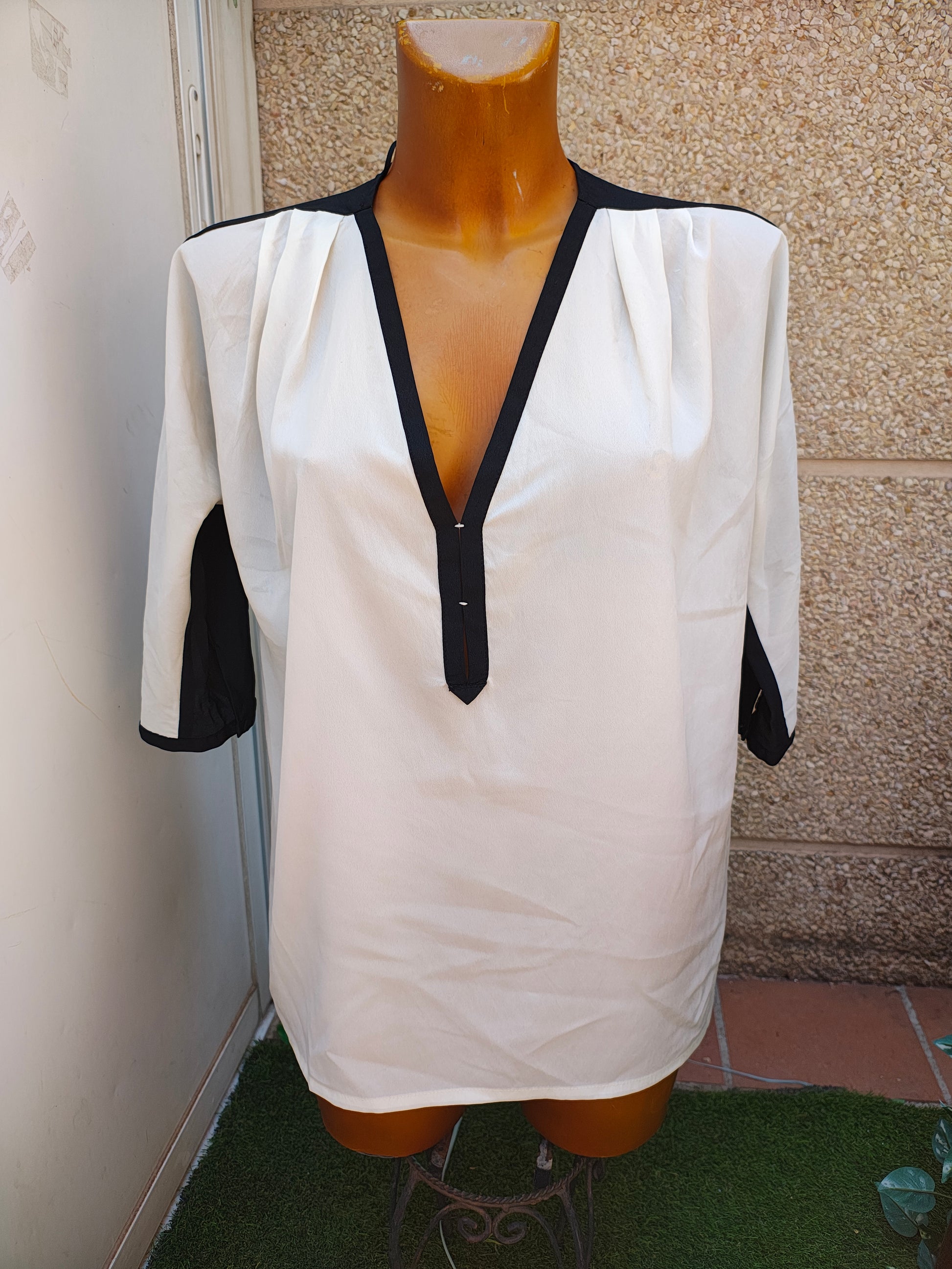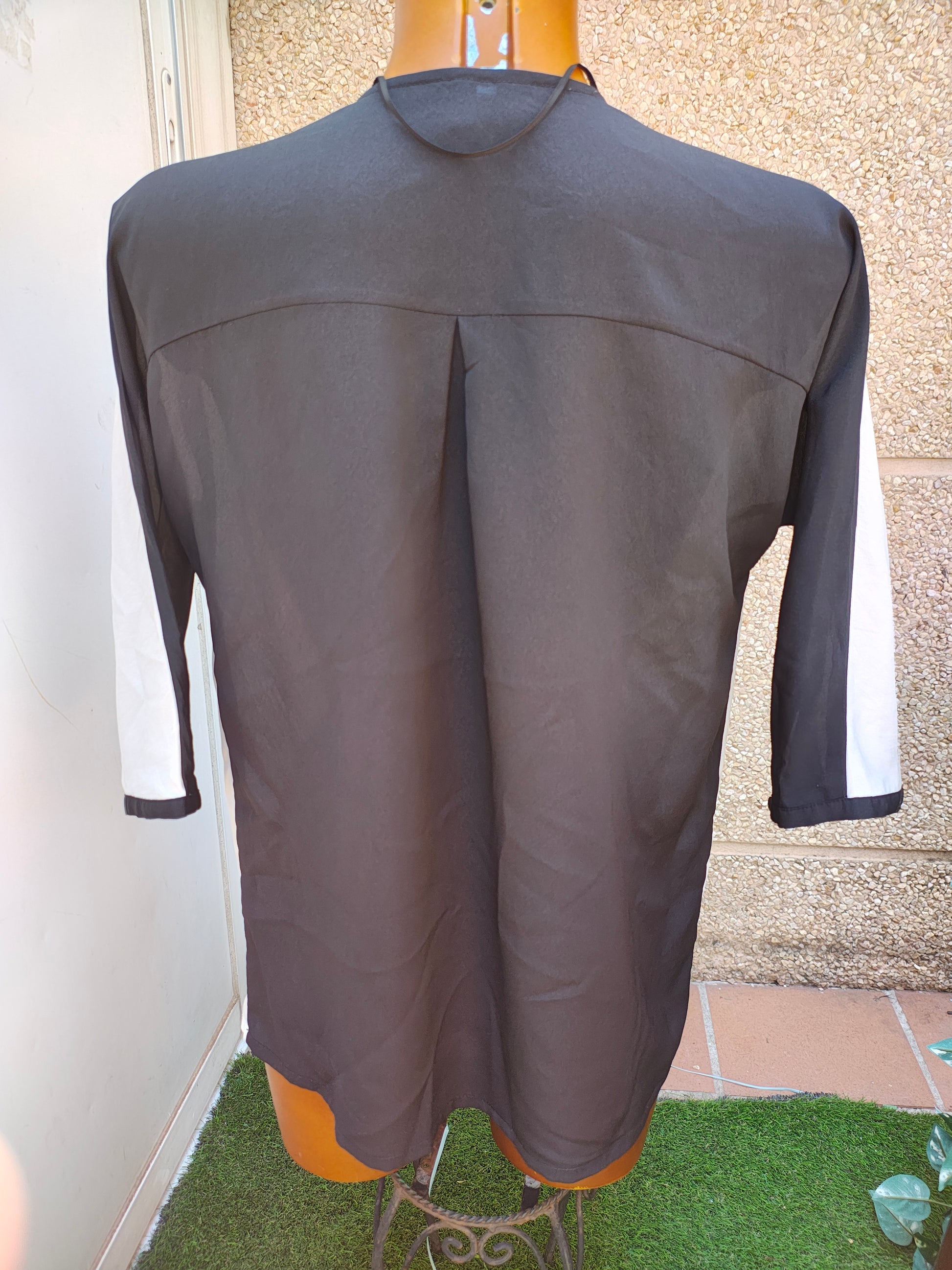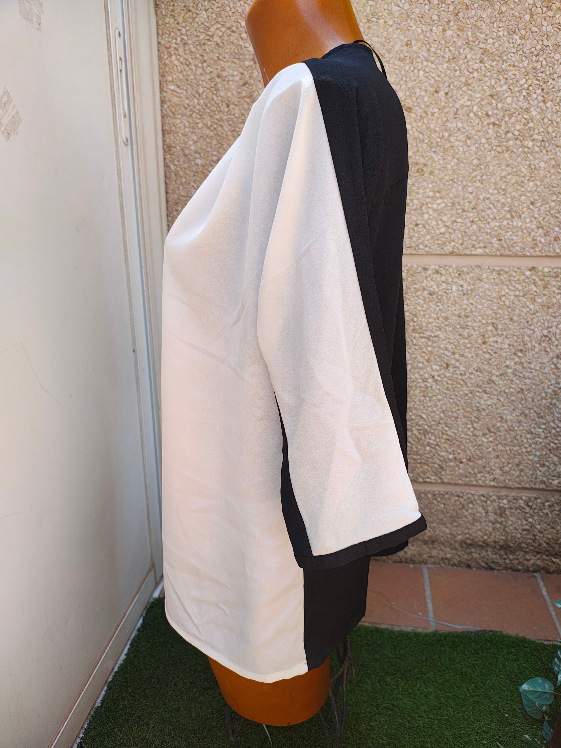 Élégant chemisier coupe droite, décliné dans un mélange de noir et de blanc. Modèle structuré avec un profond col en V et des manches 3/4 légèrement évasées. Le devant blanc contraste avec le noir des manches et du dos, créant une allure sophistiquée. Idéal pour le bureau, les événements formels ou un look chic et minimaliste.