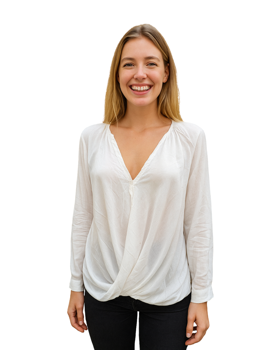 ✨ Blusa blanca de manga larga con diseño cruzado en la parte delantera y escote en pico profundo. Confeccionada en tejido ligero y fluido, ideal para aportar frescura y comodidad en looks casuales o elegantes. Su diseño envolvente estiliza la figura y ofrece un toque sofisticado y versátil.
