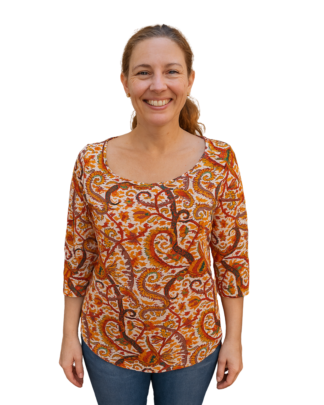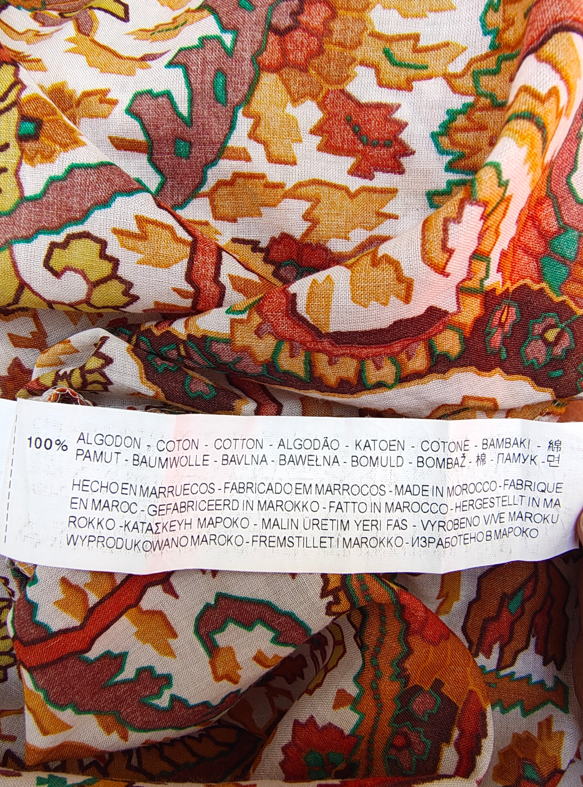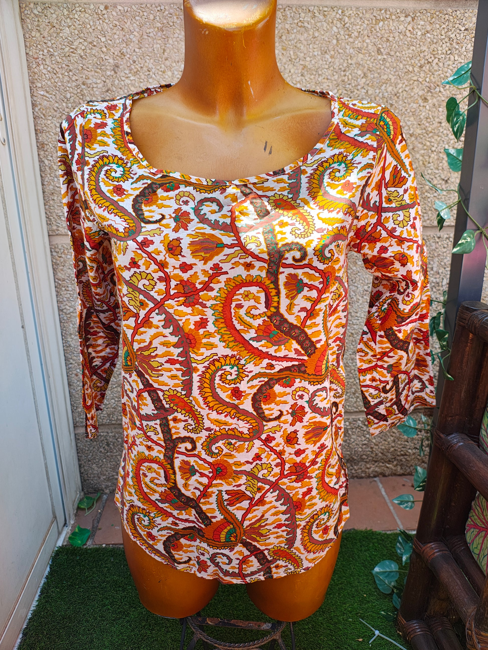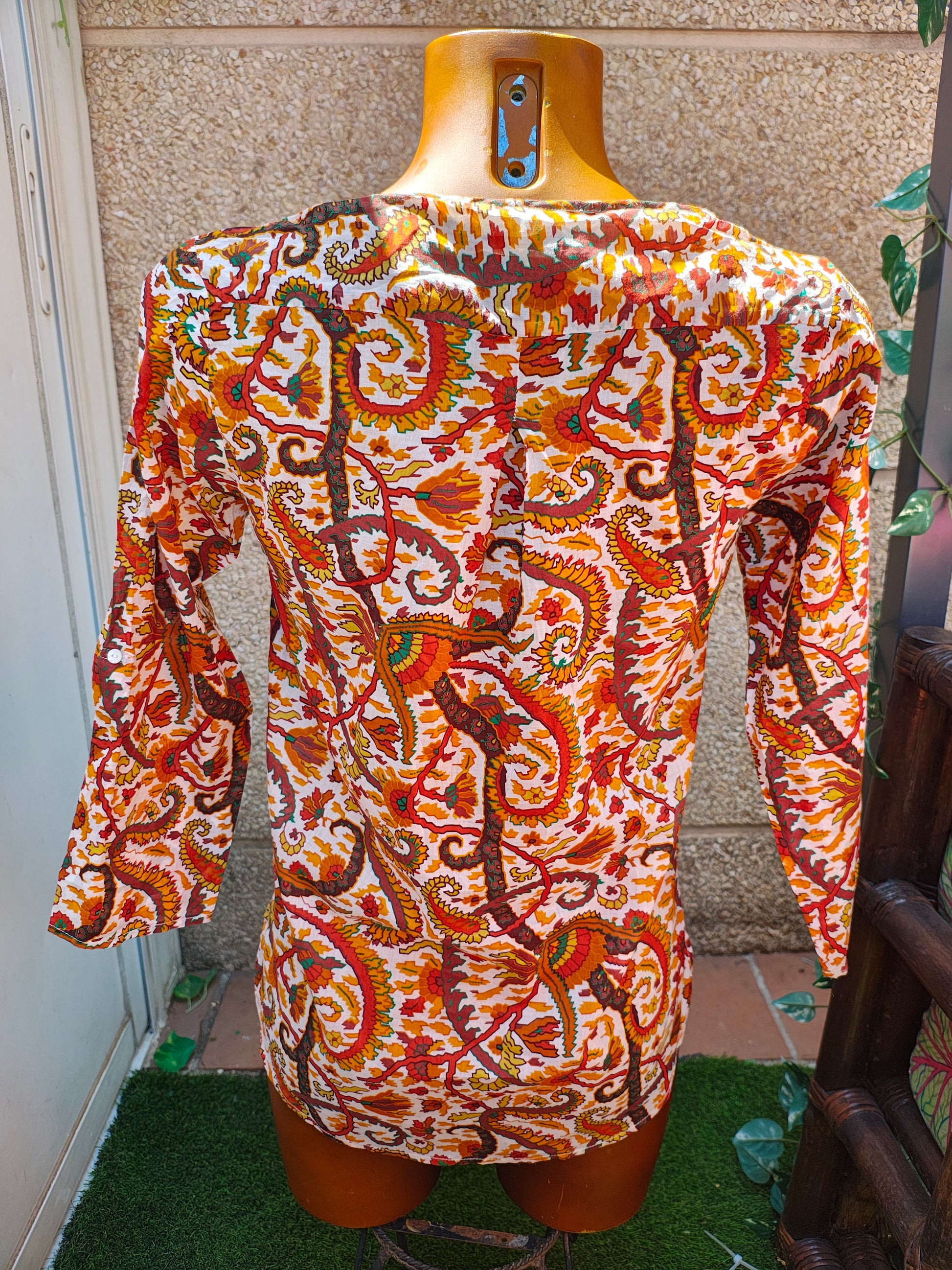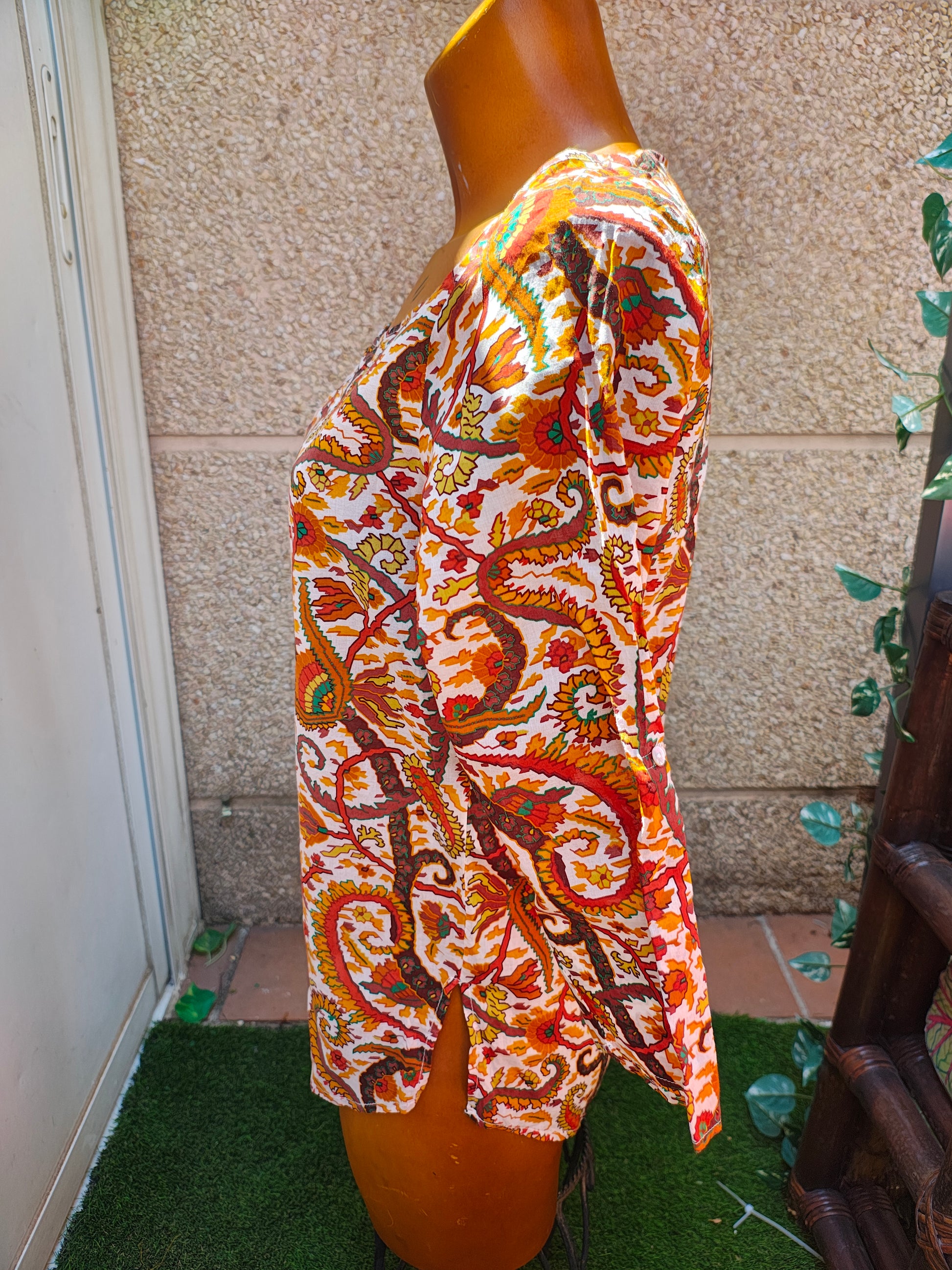 🌿 Chemisier léger à manches 3/4, orné d'un imprimé cachemire aux tons terreux : rouge, orange, moutarde et vert sur fond blanc. Coupe droite et col rond. Style bohème idéal pour des looks transitionnels ou décontractés avec une touche vintage.