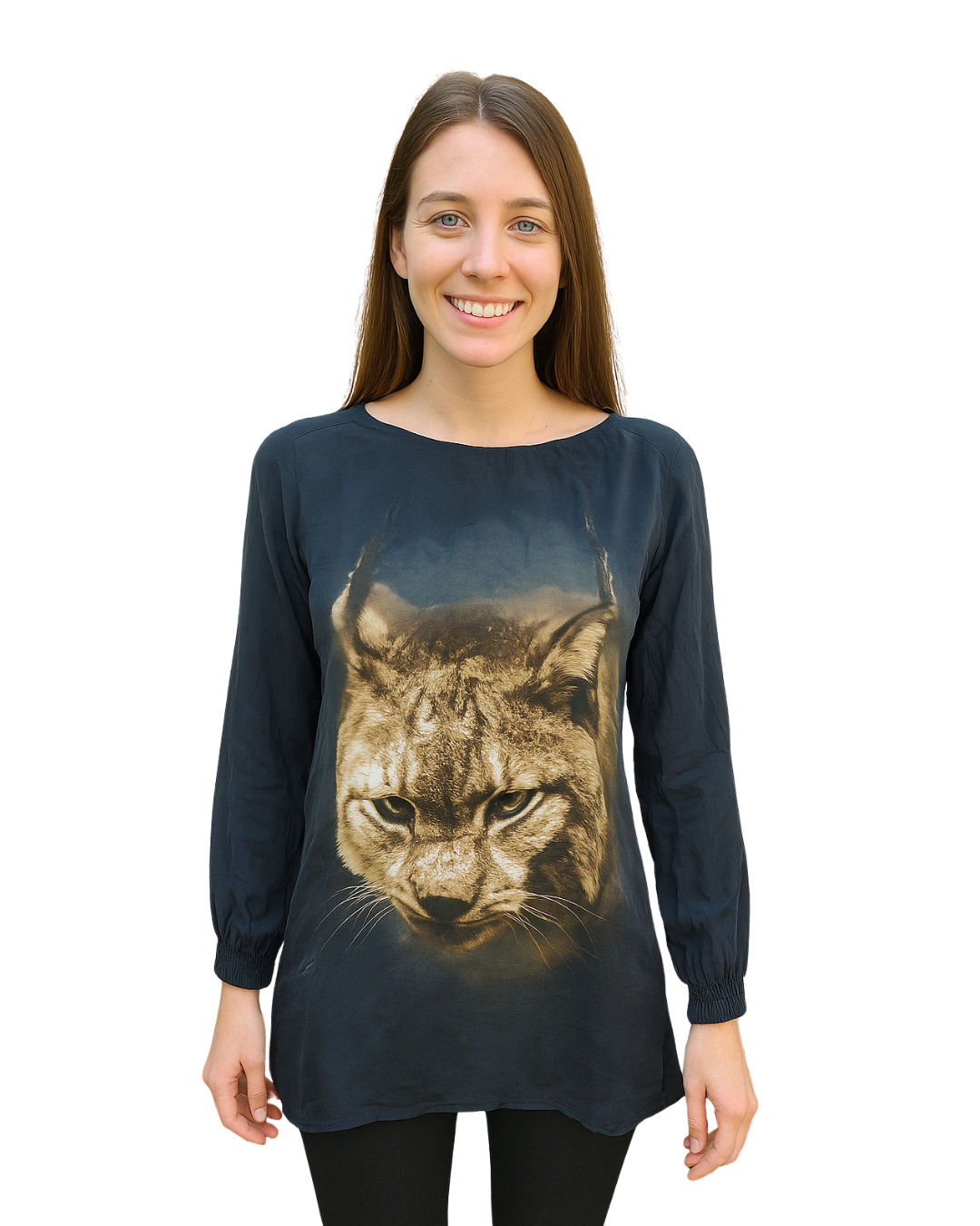 🐾 Chemisier à manches longues en 100 % soie de mûrier naturelle, orné d'un spectaculaire imprimé lynx aux tons brun doré sur fond noir. Un modèle à la fois sophistiqué et sauvage, avec une texture fluide et légère. Doté d'un col rond, de poignets élastiques et de poches latérales zippées, il est parfait pour ajouter une touche d'audace à n'importe quelle tenue.