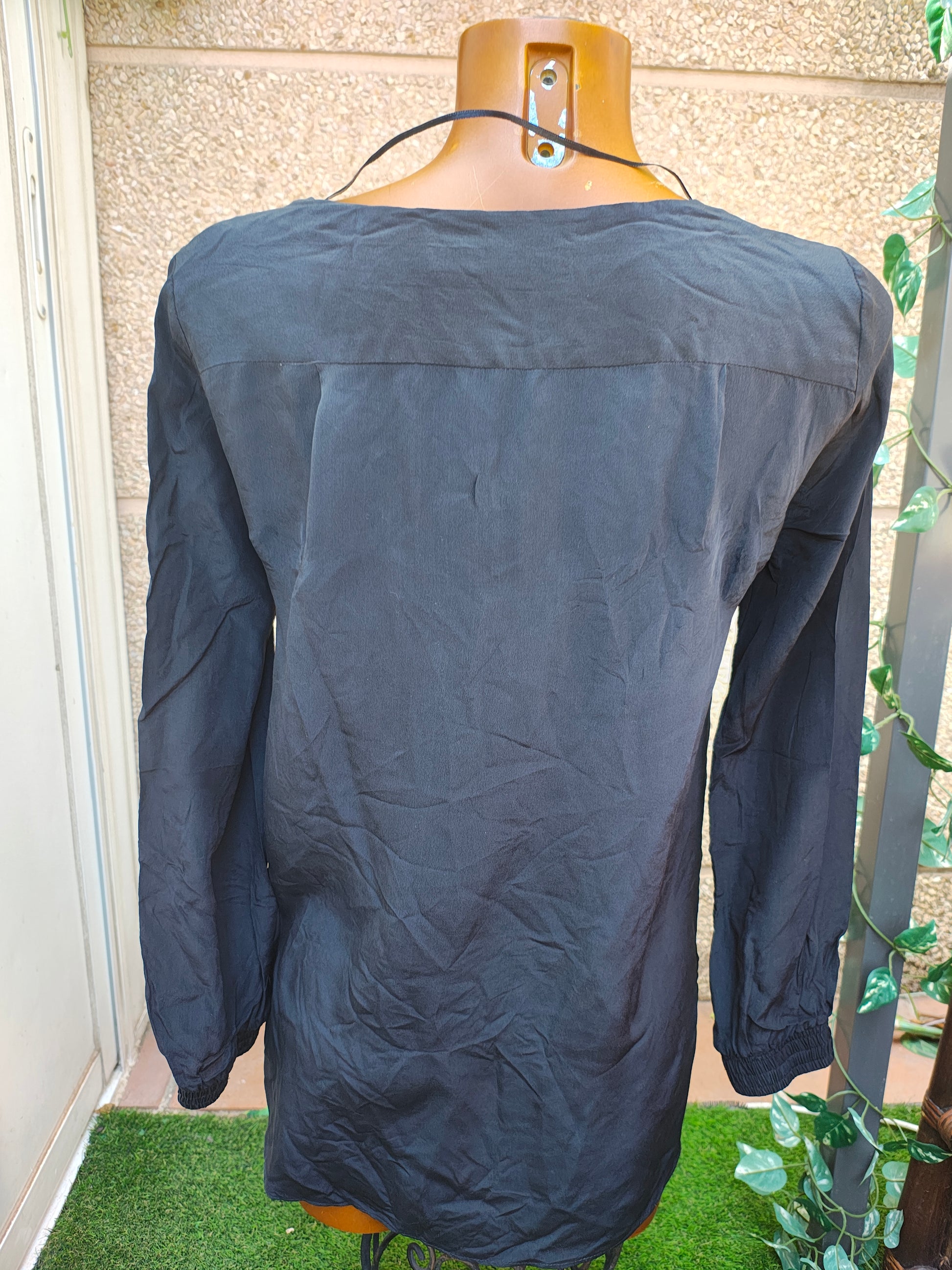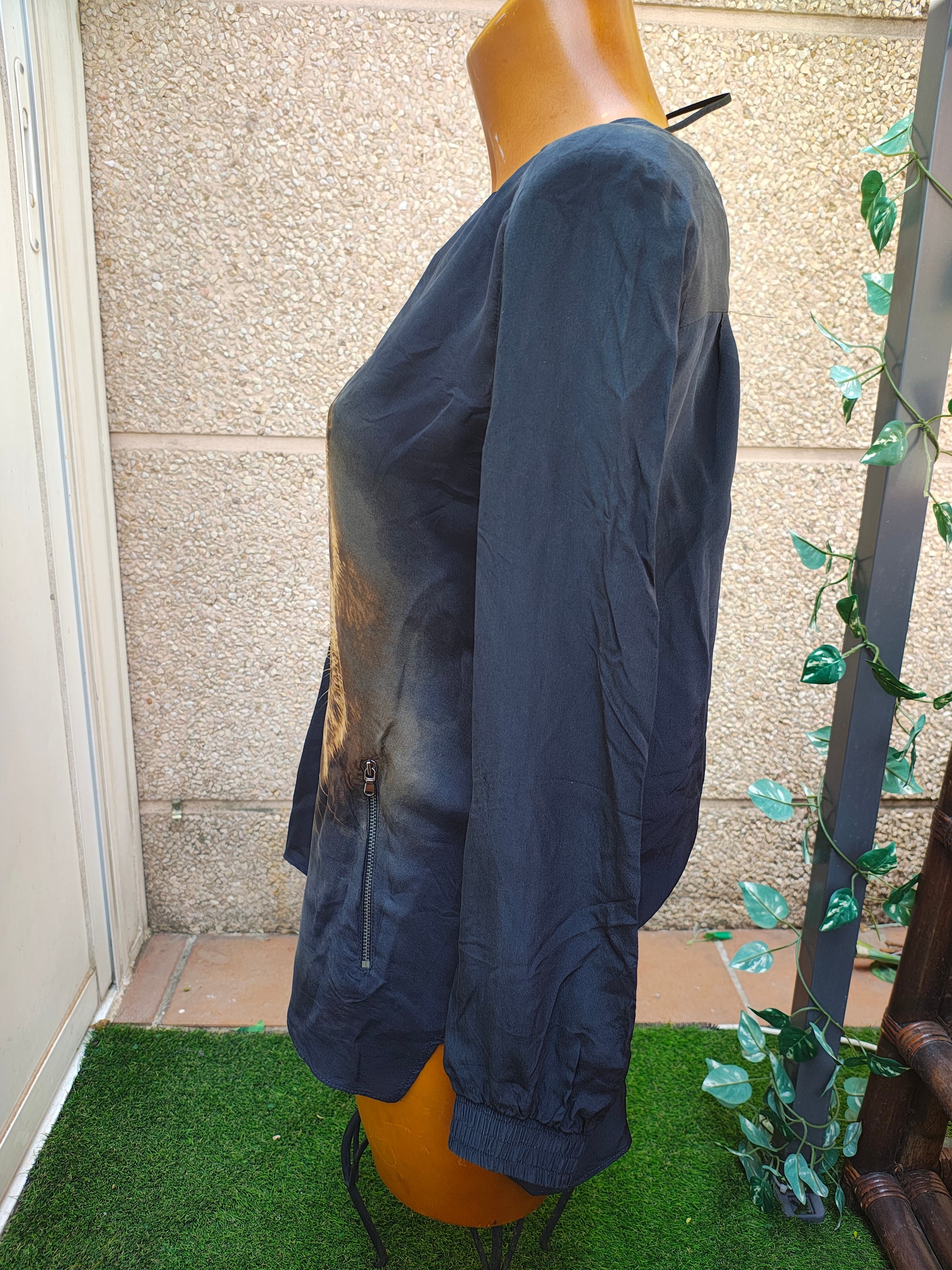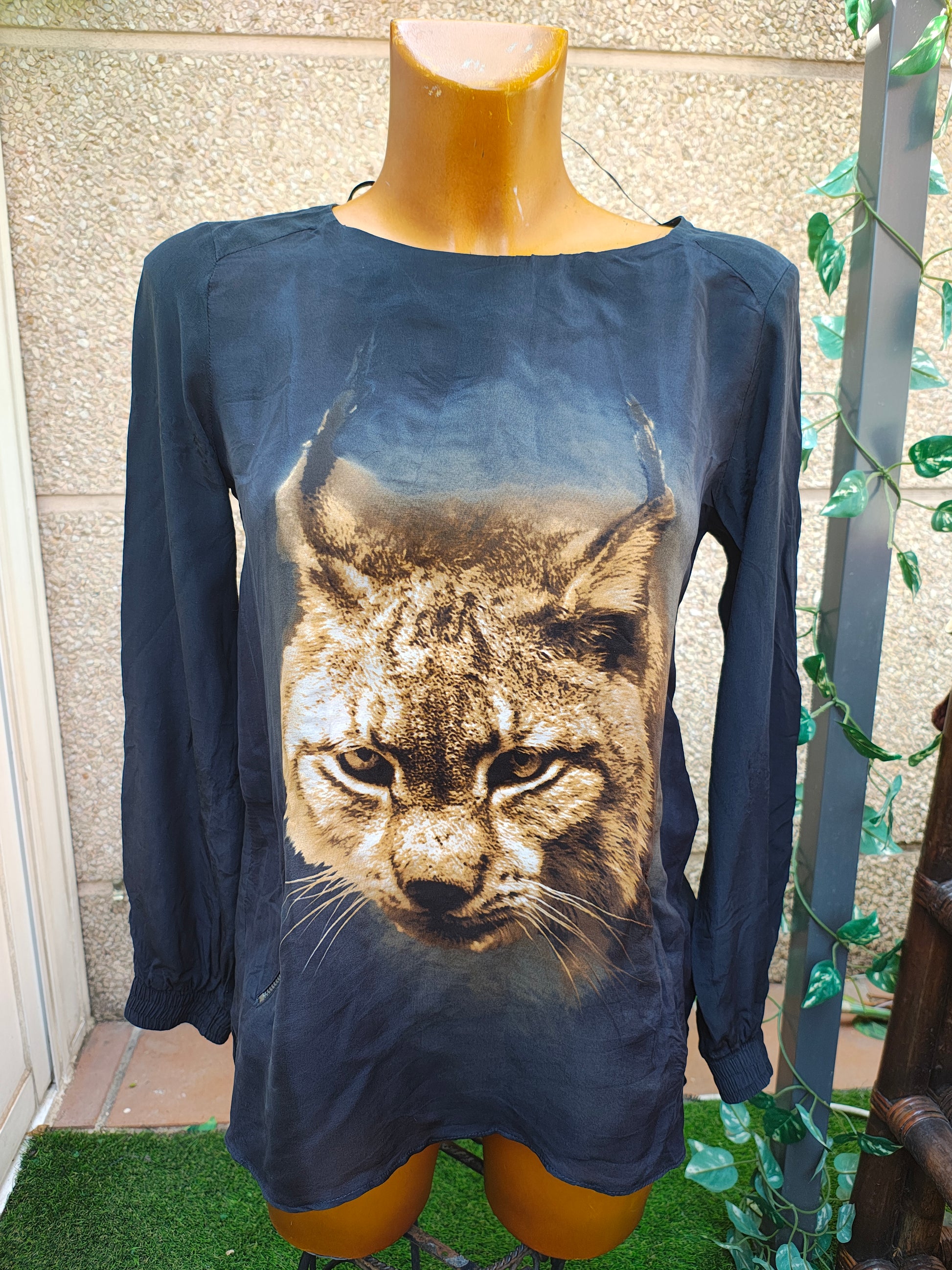 D'OCCASION – Chemisier noir 100% soie naturelle imprimé lynx ZARA FEMME (Taille S)