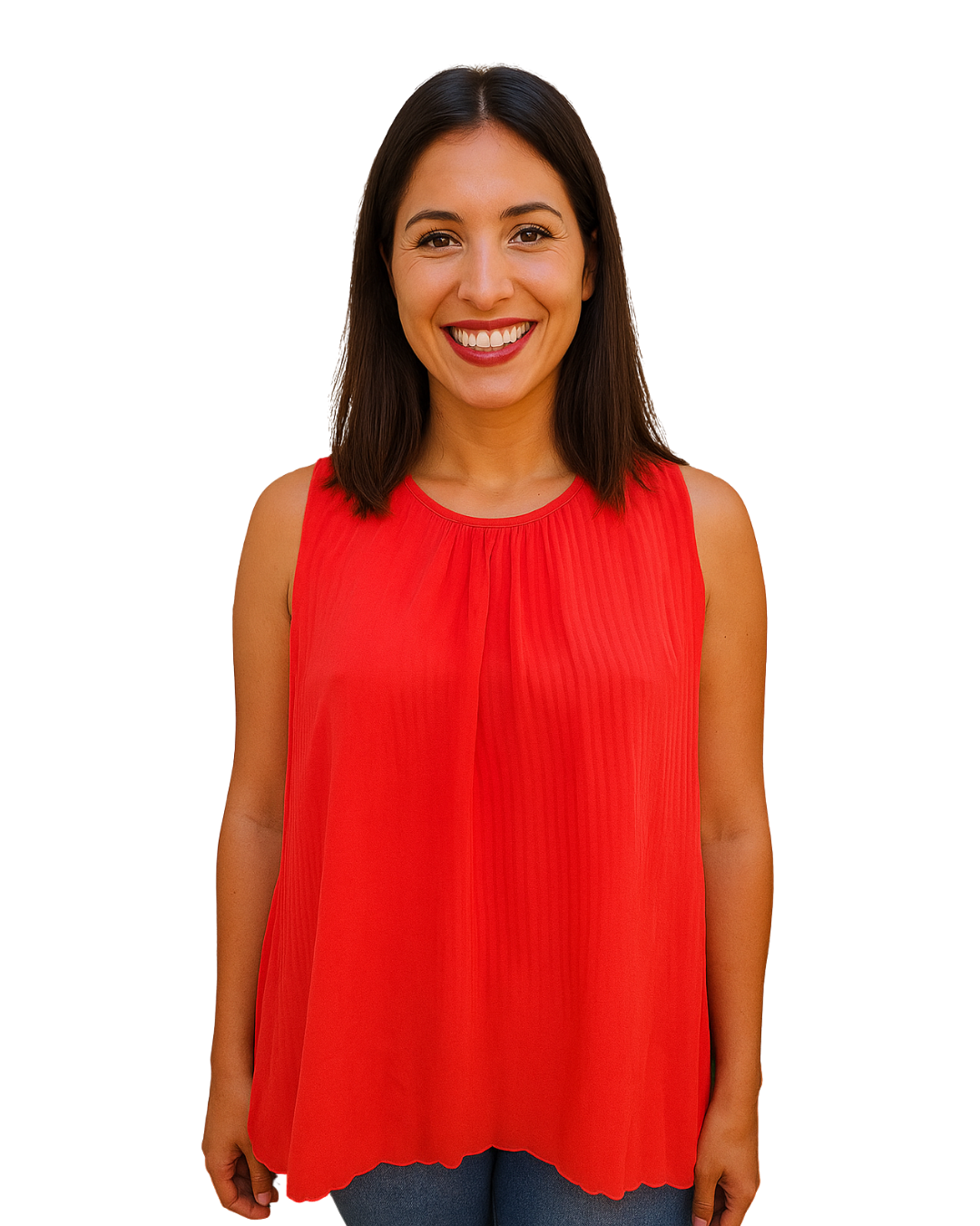 👚 Diseño sin mangas con escote redondo y caída suelta tipo A, ideal para estilizar la silueta. Cierre trasero con abertura en forma de lágrima y botón. Bajo ondulado tipo festón que añade un toque femenino.