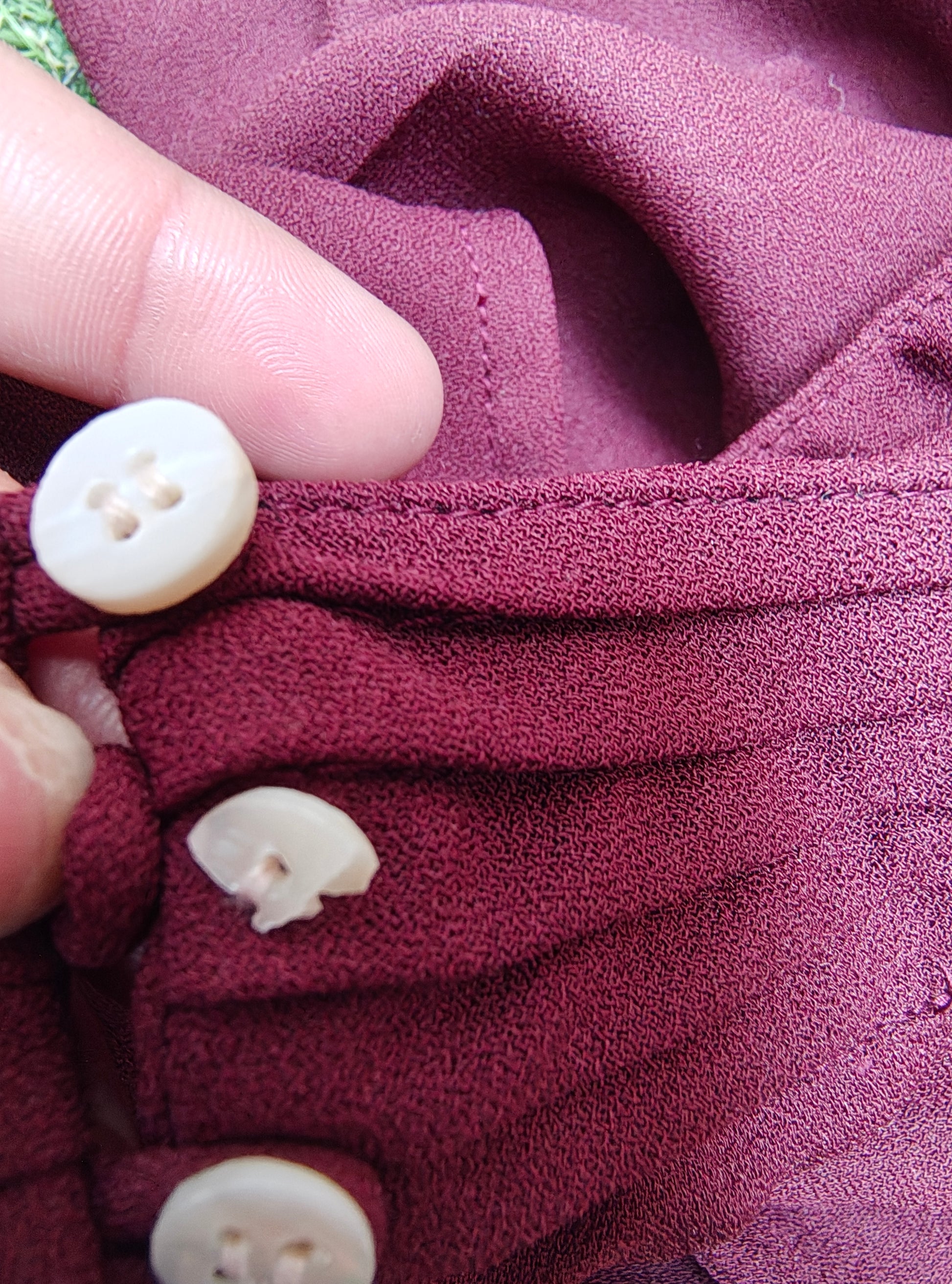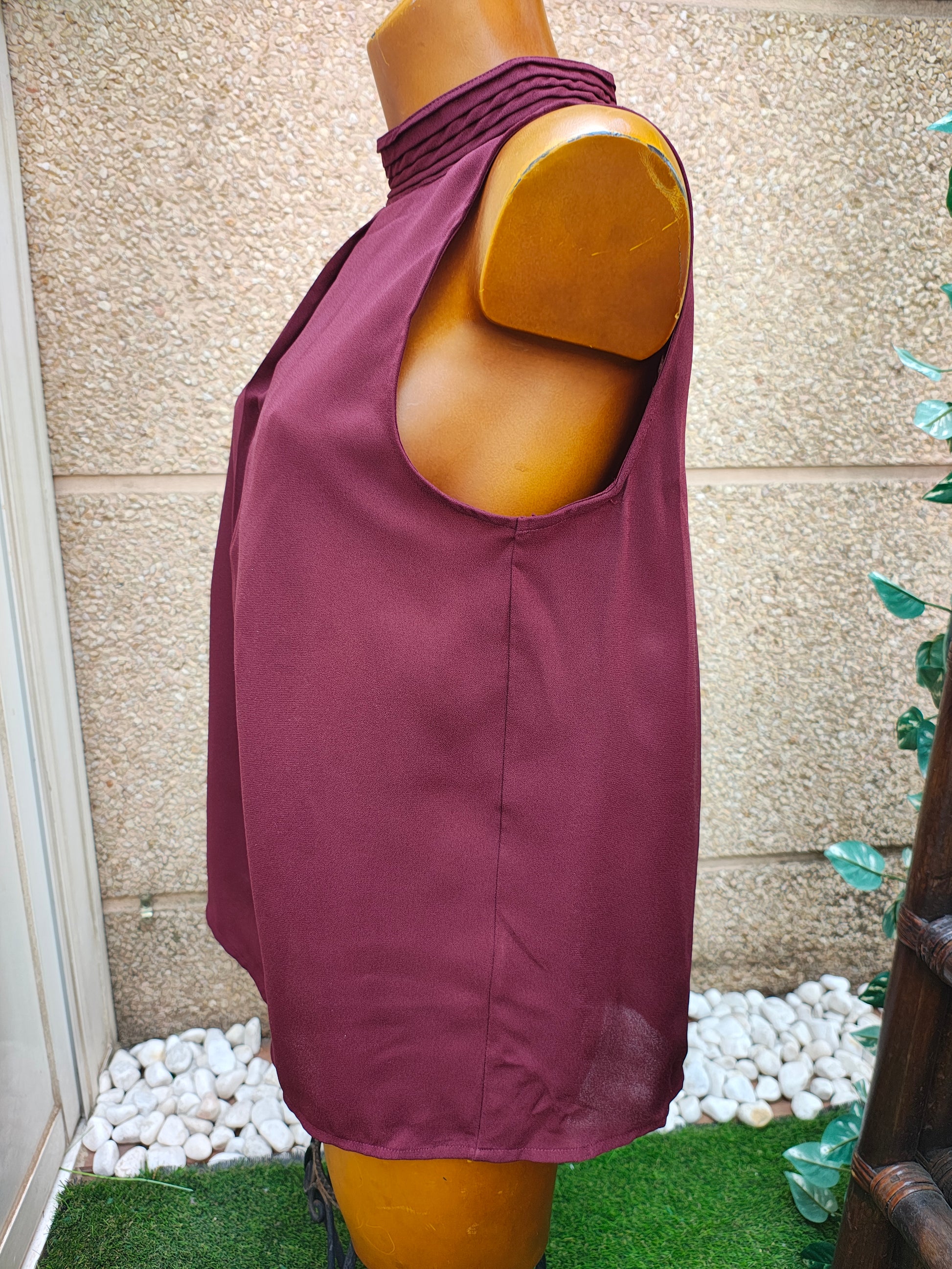 ✨ Elegante blusa en color burdeos con cuello alto plisado y detalle de pliegues frontales que aportan caída y movimiento. Diseño sin mangas, con cierre de botones en la parte trasera del cuello. Su tejido ligero y fluido la convierte en una prenda cómoda y versátil.