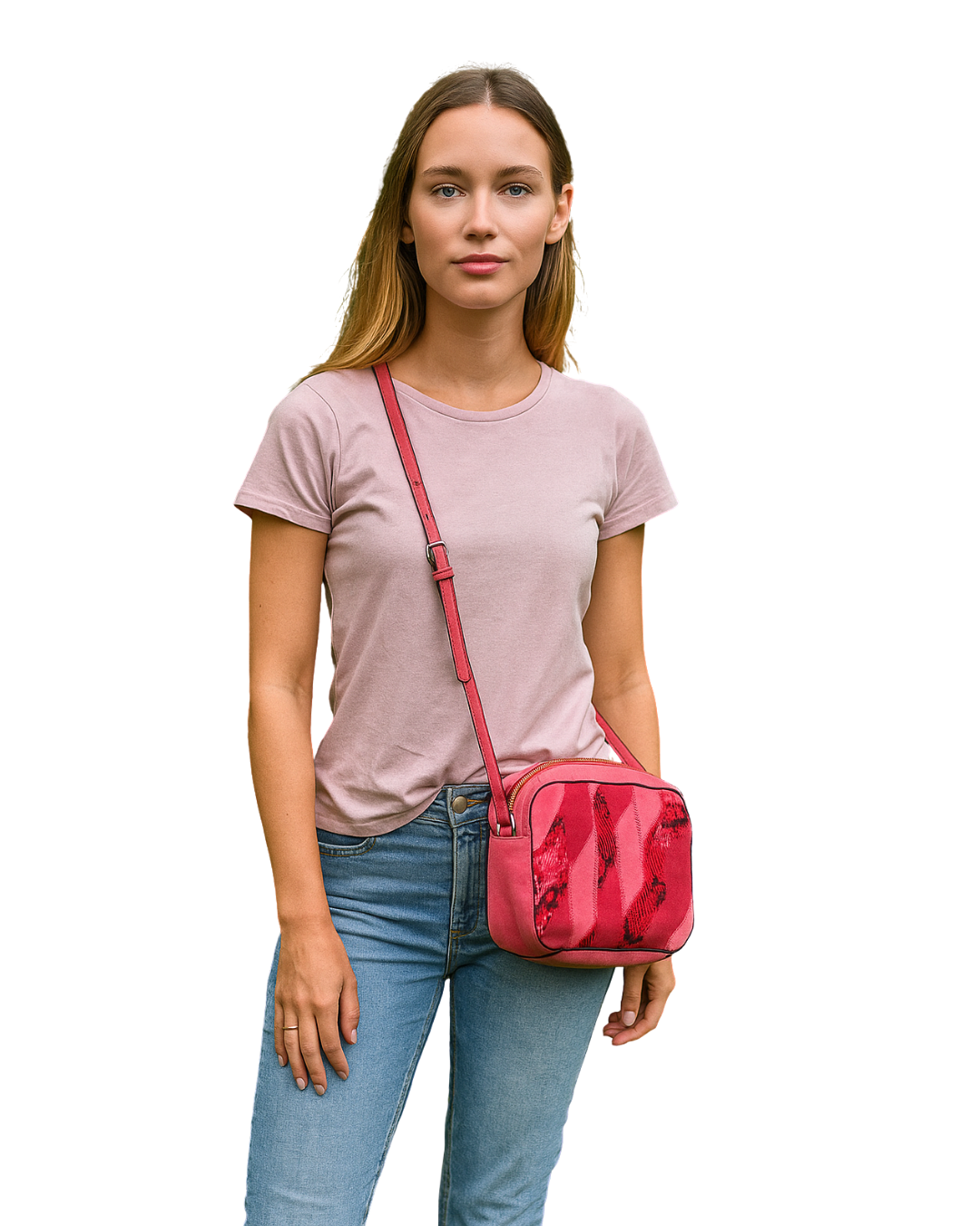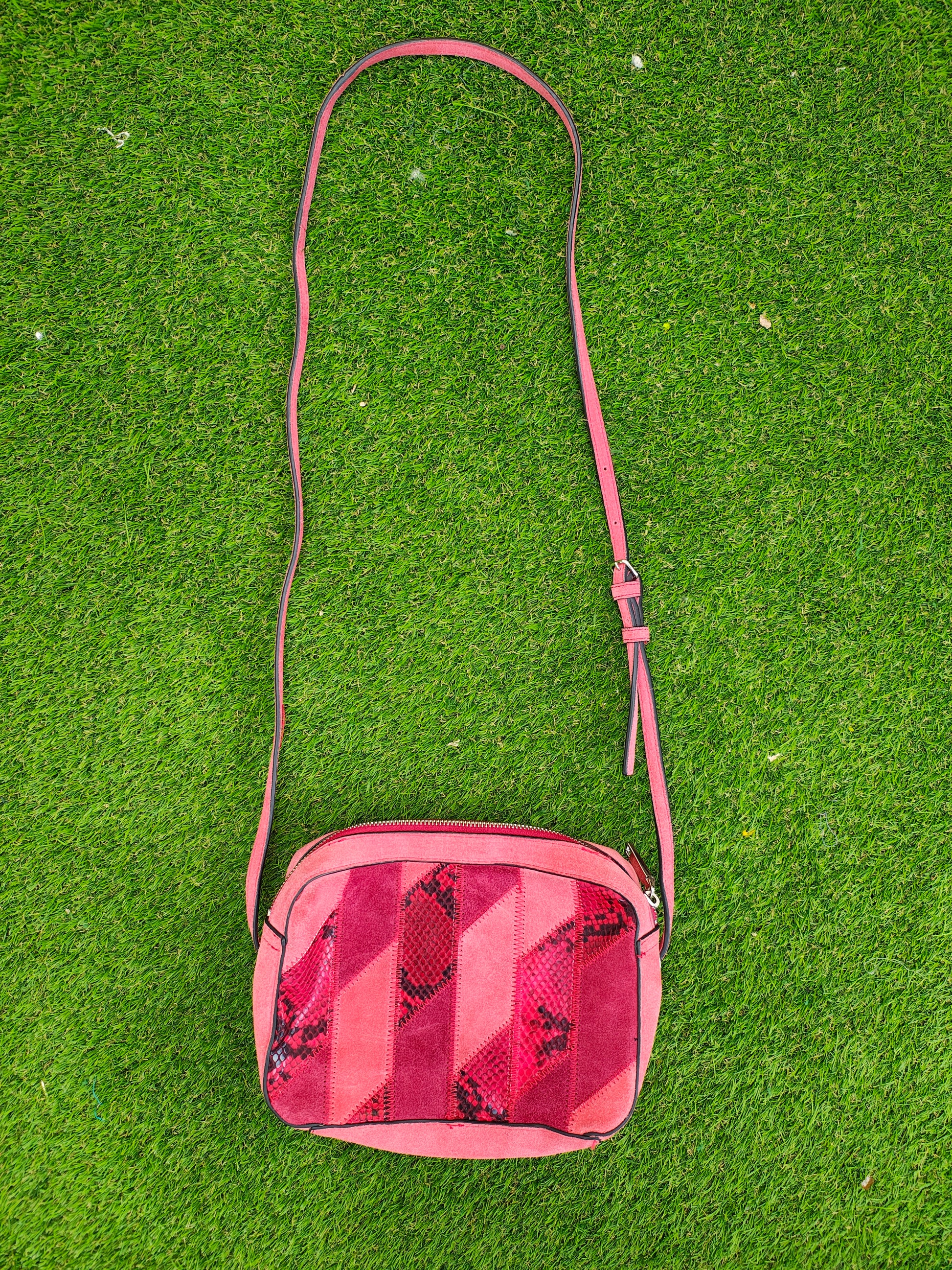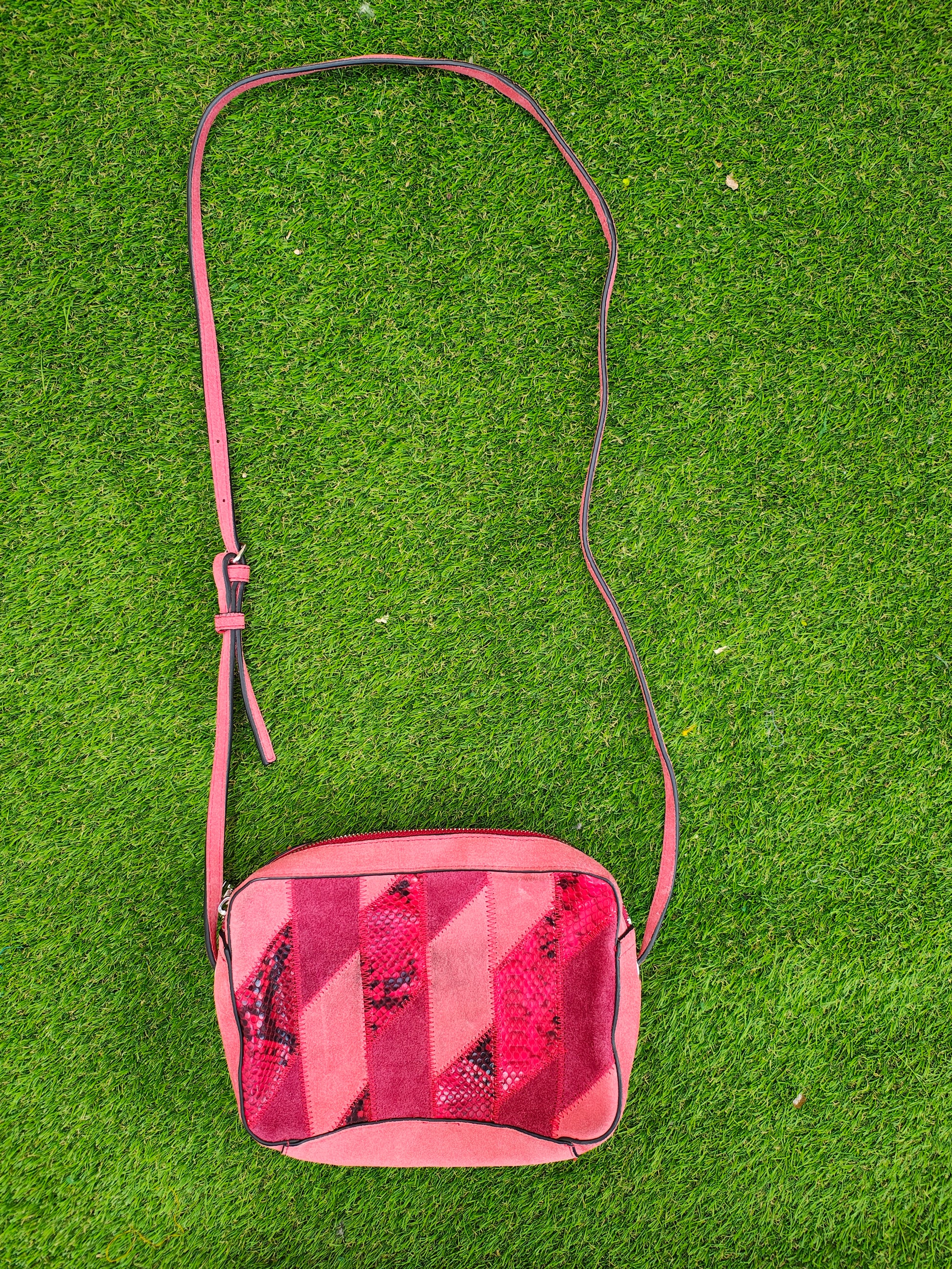 👜 Petit sac bandoulière au design patchwork dans les tons rose et fuchsia, combinant des imprimés unis, suède et effet peau de serpent. Anse réglable et fermeture zippée. Intérieur doublé avec une poche zippée. Un design jeune, accrocheur et polyvalent pour égayer toutes vos tenues décontractées ou de soirée.