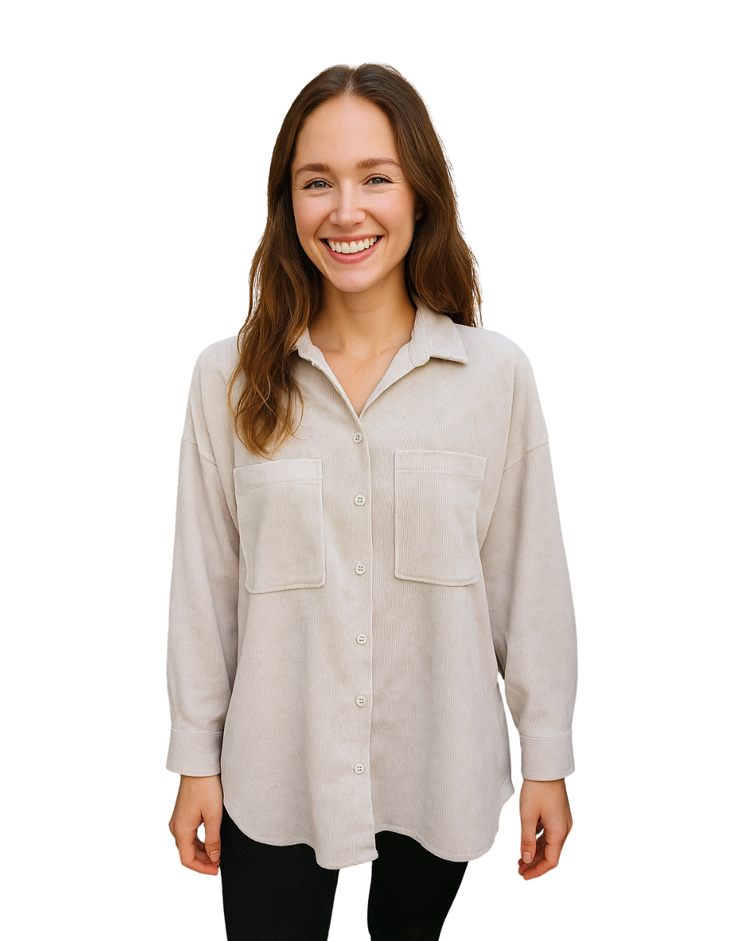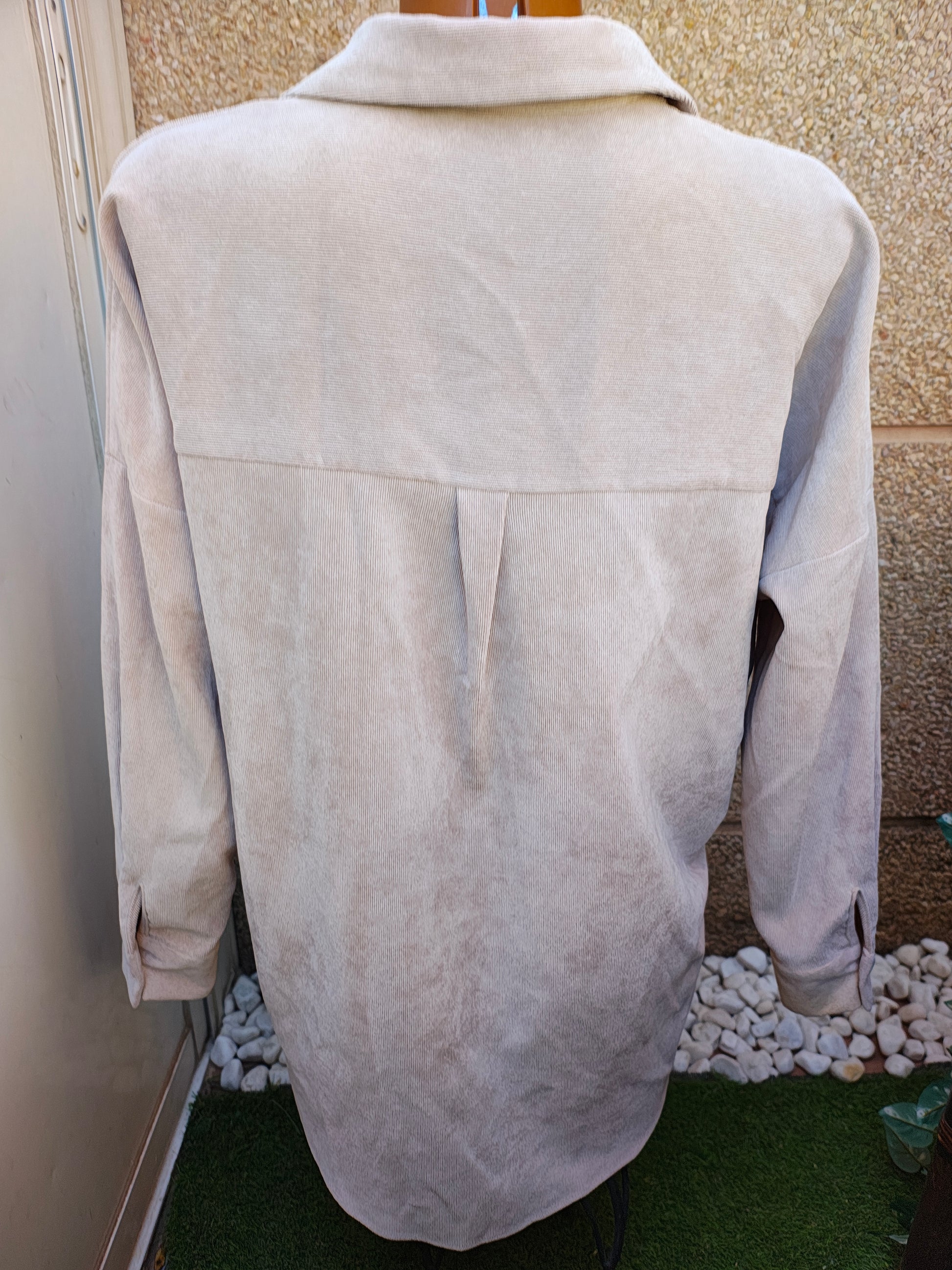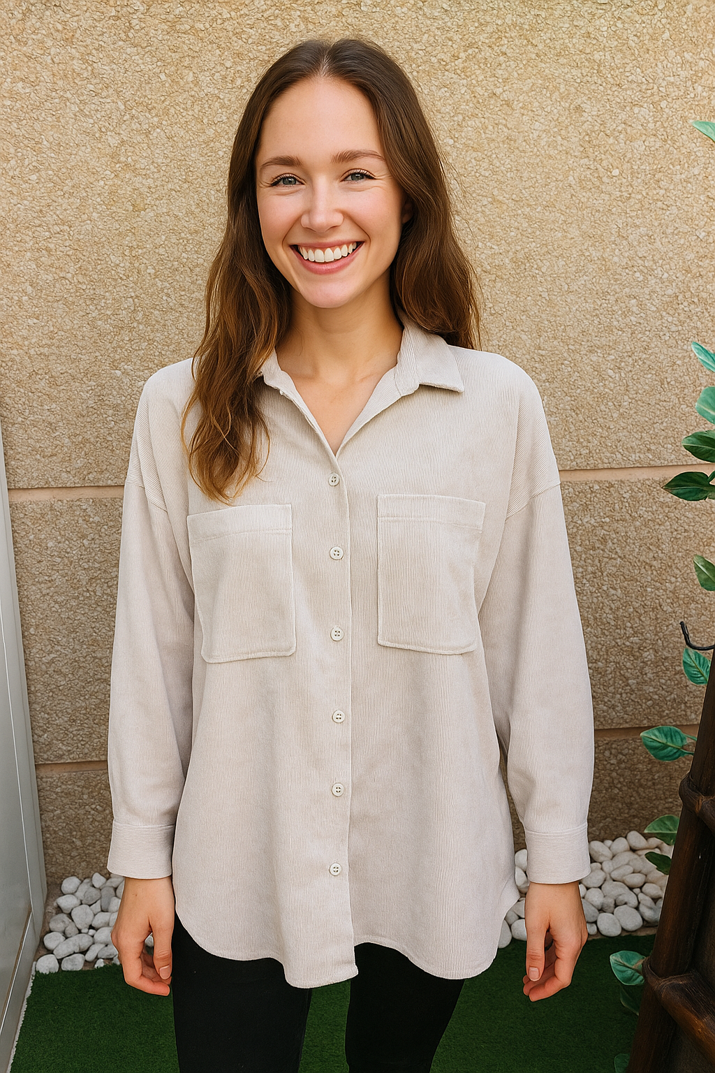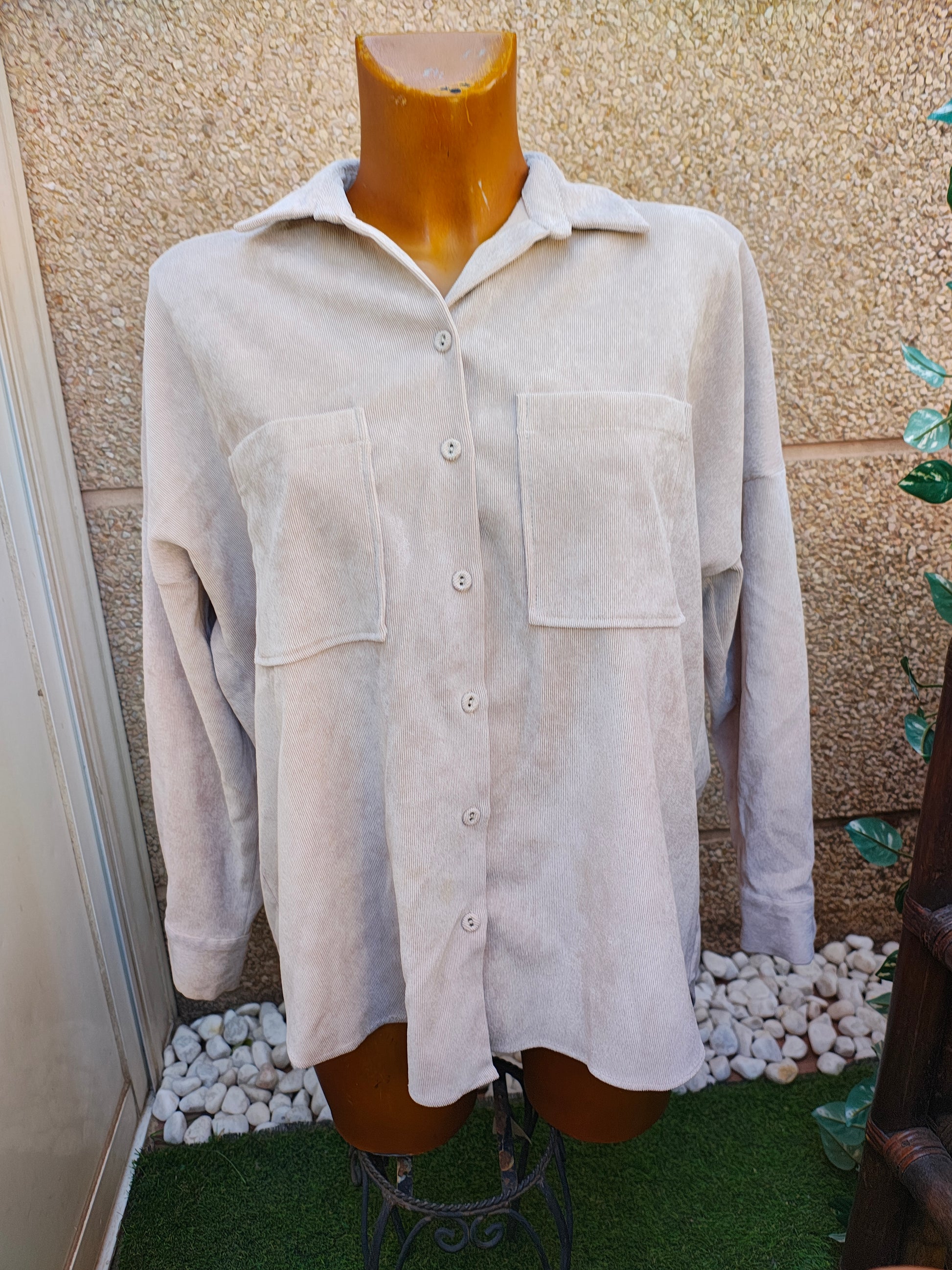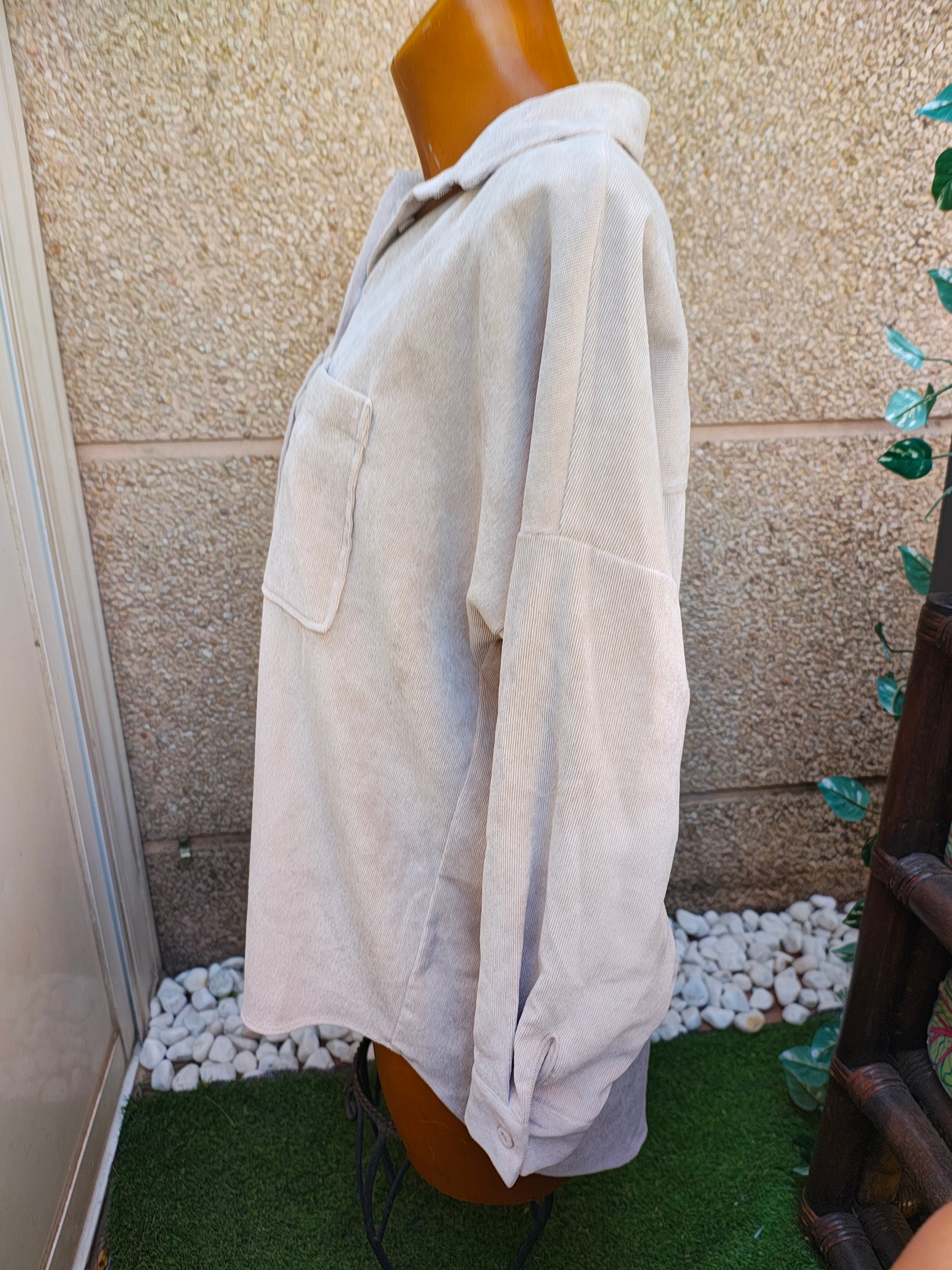 ✨ Camisa de estilo casual en color beige, confeccionada en pana fina de tacto suave. Diseño oversize con cuello clásico, cierre frontal de botones y dos bolsillos de parche en el pecho. De manga larga con puños abotonados y corte recto, perfecta para llevar como sobrecamisa ligera o combinada con jeans, pantalones de pinza o faldas para un look urbano y versátil.