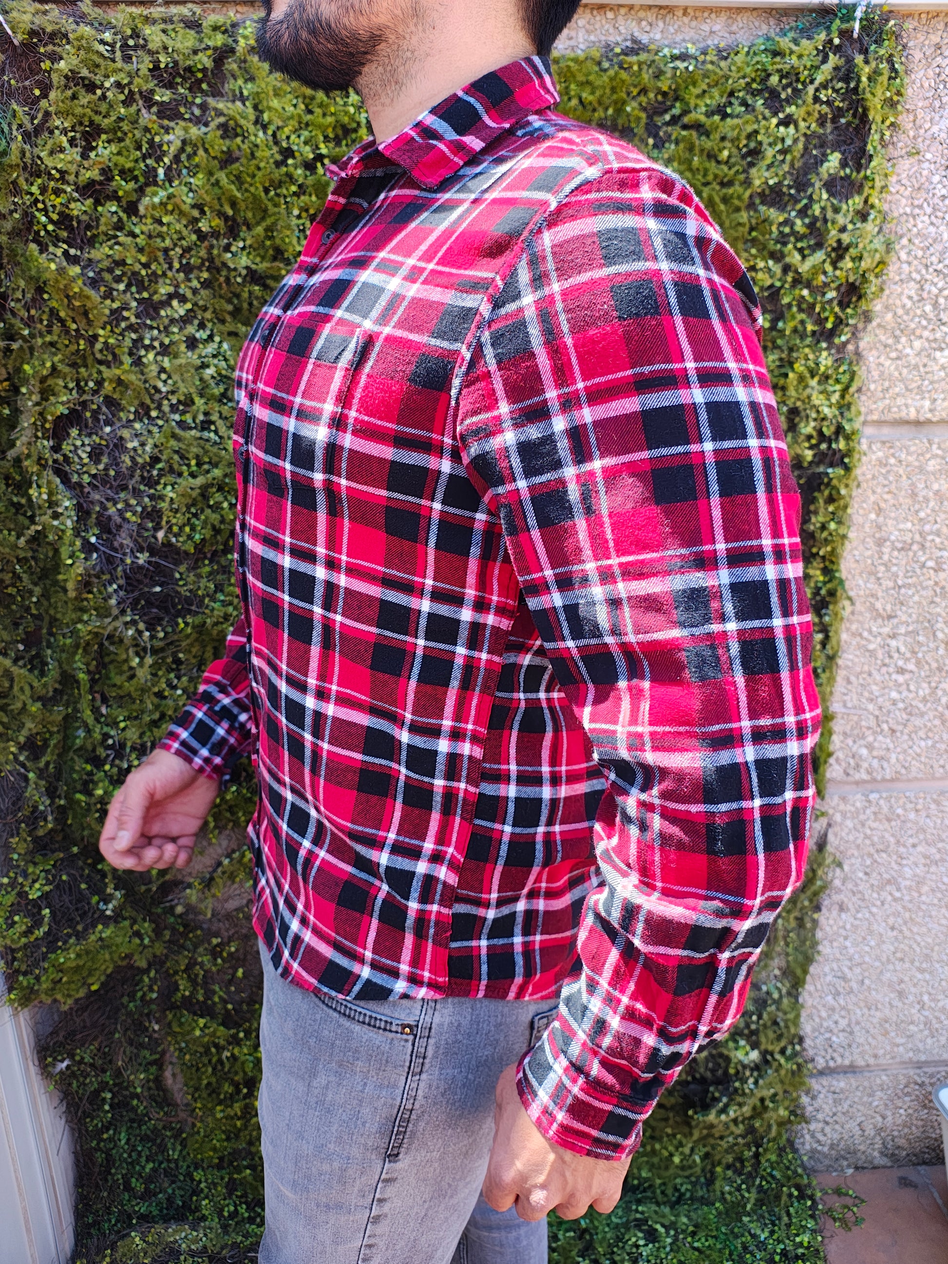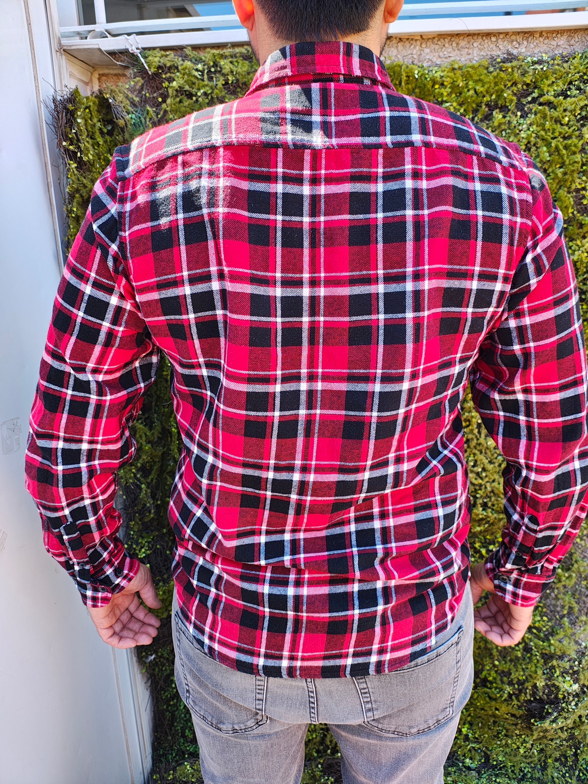 Chemise à carreaux style bûcheron aux tons rouge, noir et blanc. Coupe classique avec col classique et boutons sur le devant.