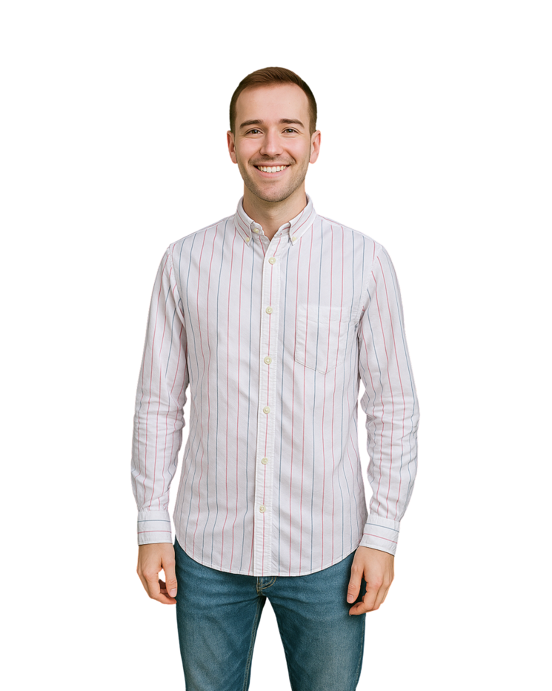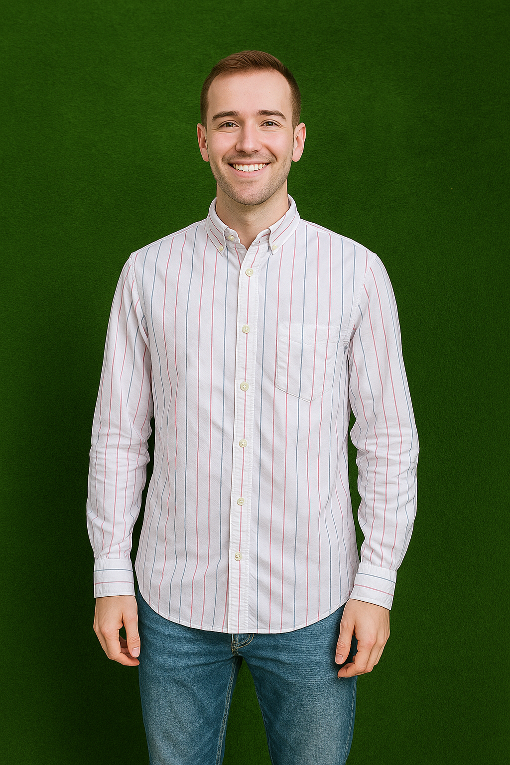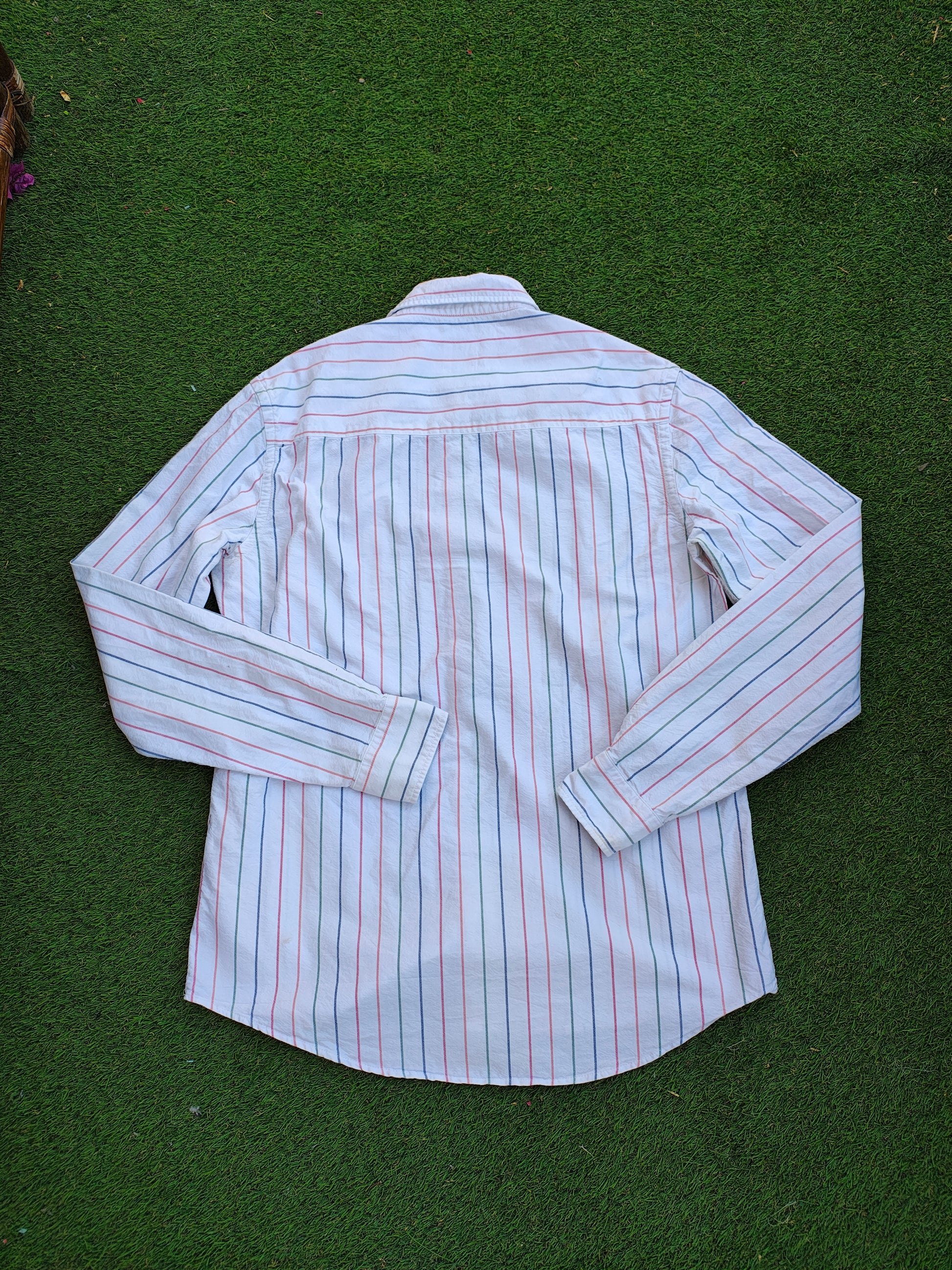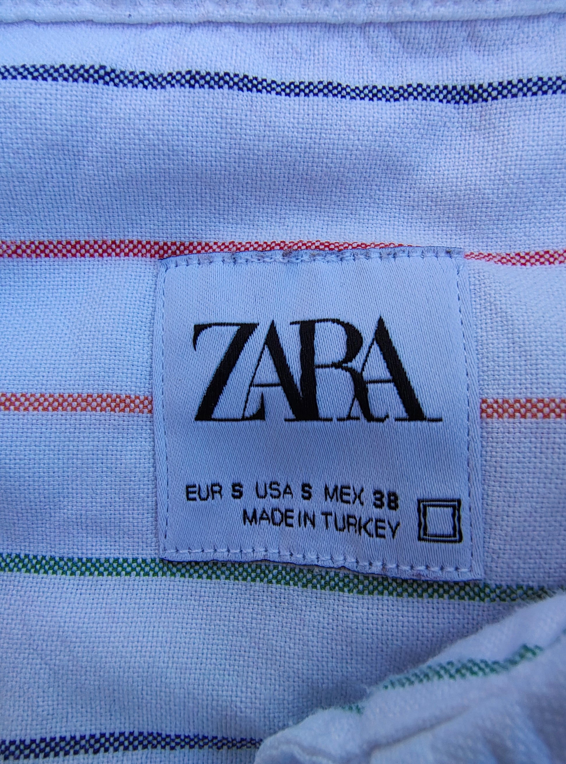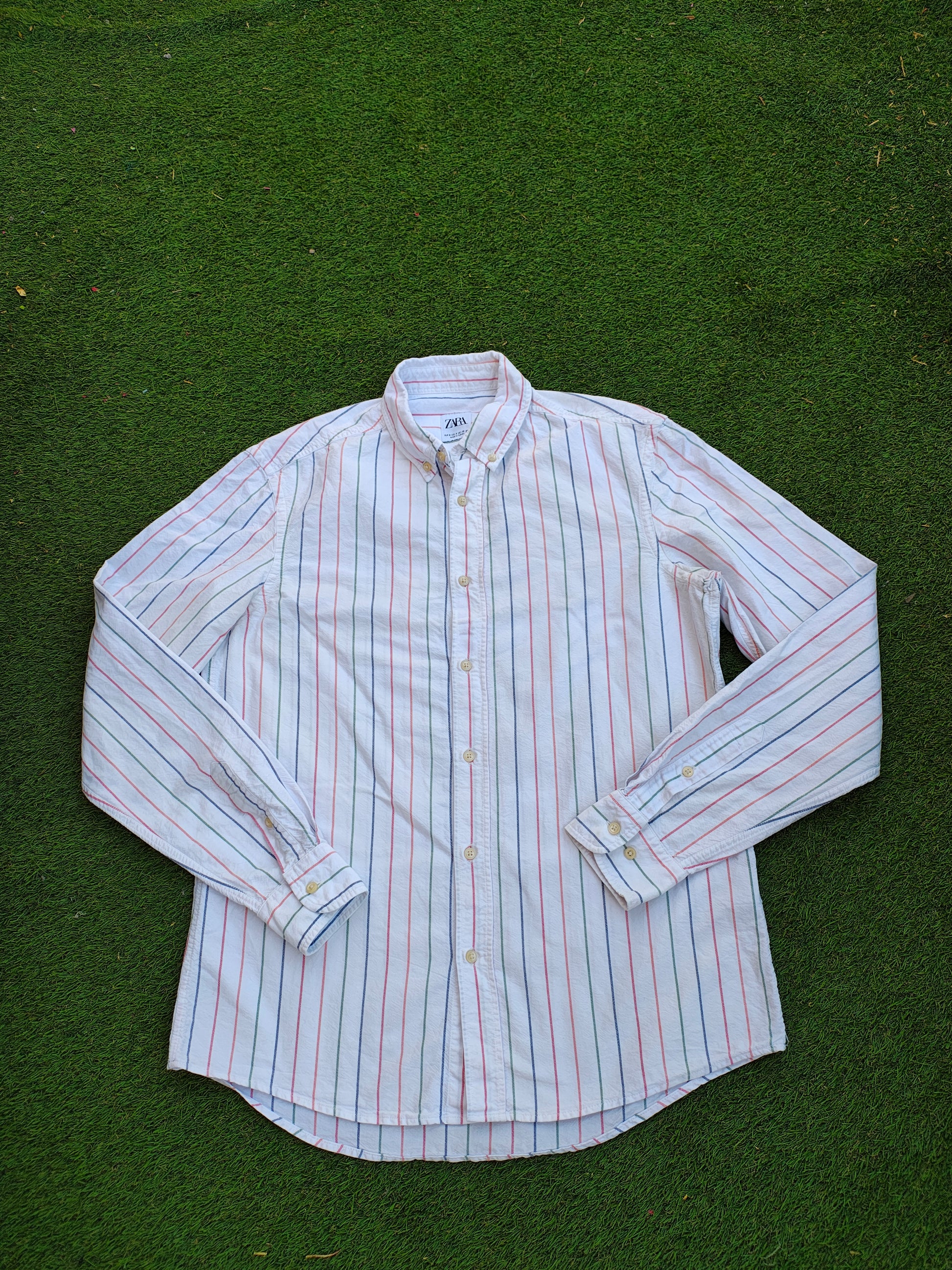 👔 Camisa de manga larga en algodón 100% de ZARA, con diseño de rayas verticales en tonos rojo, azul y verde sobre fondo blanco. Corte clásico con cuello abotonado y cierre frontal de botones, ideal para un estilo casual o semi-formal. Tejido ligero y cómodo, perfecto para primavera y verano.
