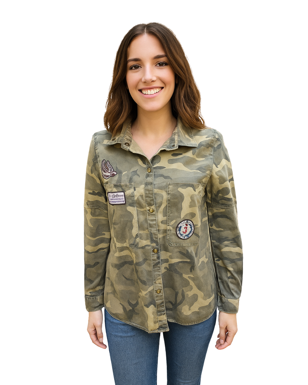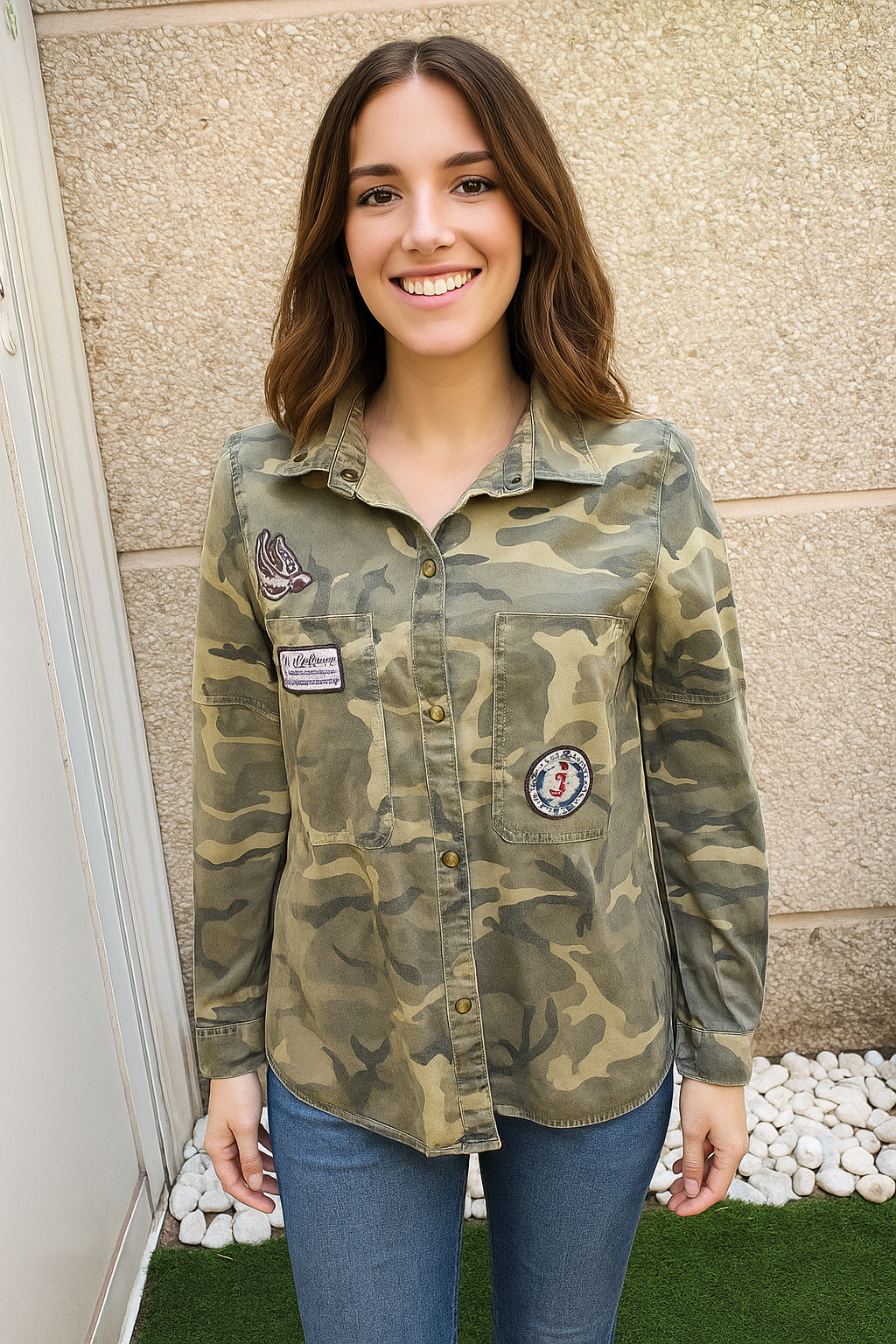 🧵 Camisa estilo militar en tejido 100% algodón con estampado camuflaje en tonos verde y beige. Presenta cuello camisero clásico, cierre de botones metálicos al frente y bolsillos funcionales en el pecho. Destaca por sus parches bordados decorativos en la parte delantera: ave, emblema y etiqueta outdoor, que aportan un estilo urbano y juvenil. Manga larga con puño abotonado y corte recto cómodo. Ideal como sobrecamisa o chaqueta ligera para looks casuales y de inspiración army.