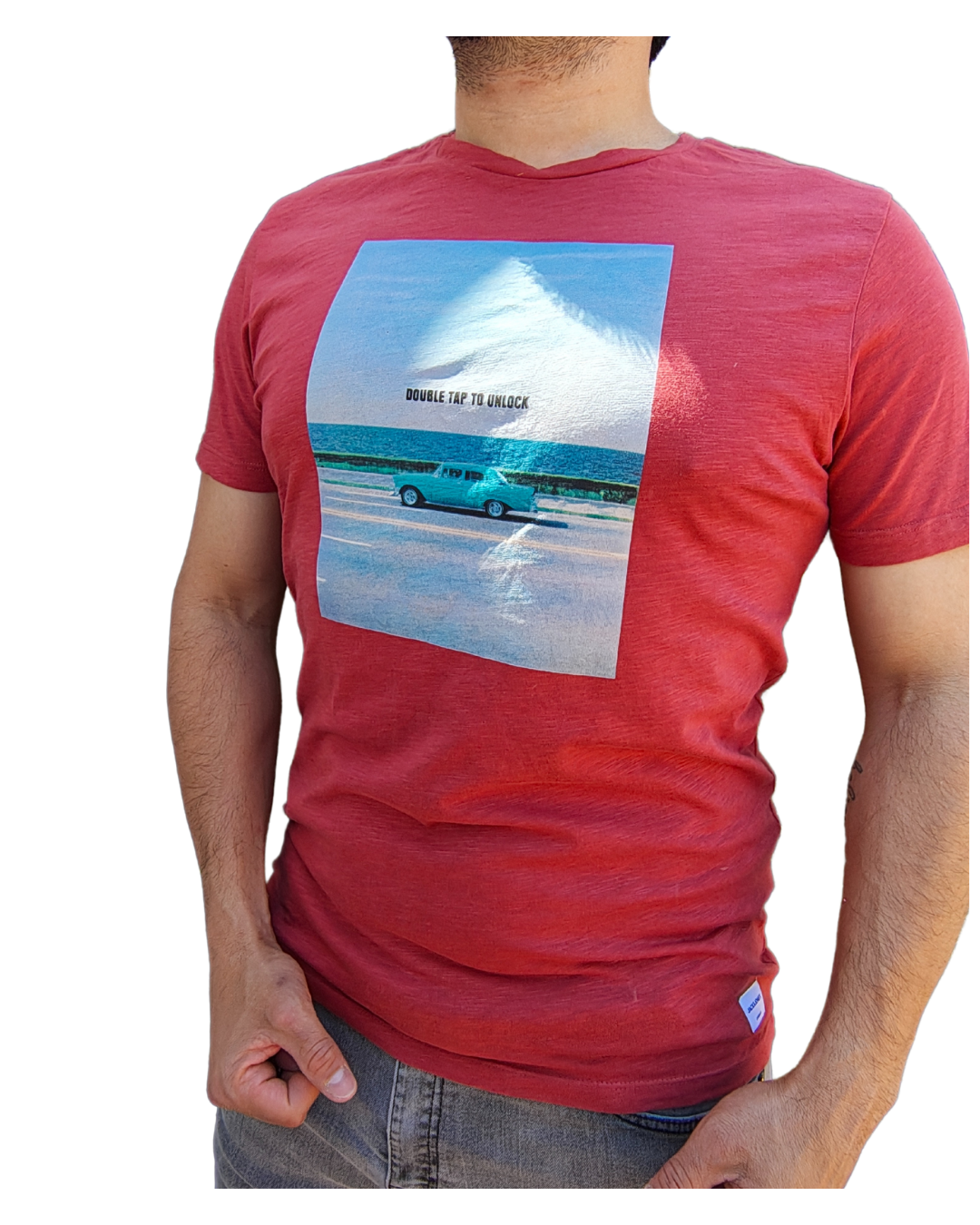 👕 T-shirt en coton rouge avec un imprimé sur le devant d'une voiture classique et la phrase « Double Tap to Unlock ».