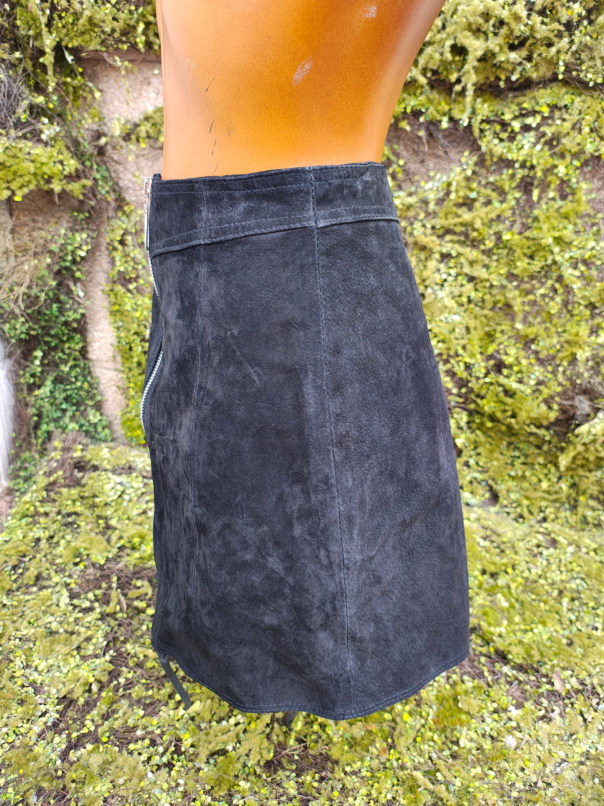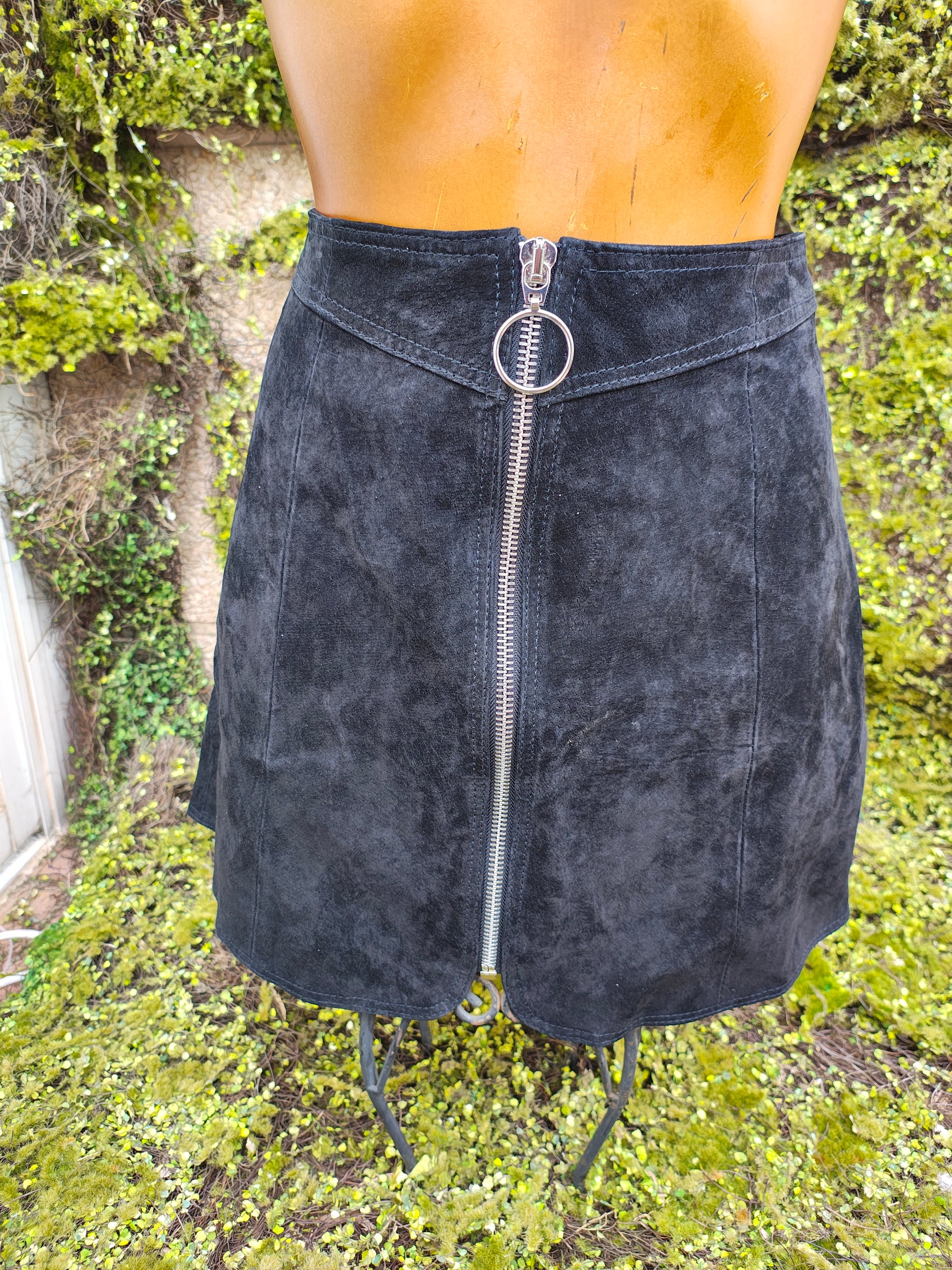 Jupe courte effet daim noir, au design minimaliste avec fermeture éclair métallique sur le devant et tirette à anneau. Coupe droite ajustée qui sublime la silhouette.