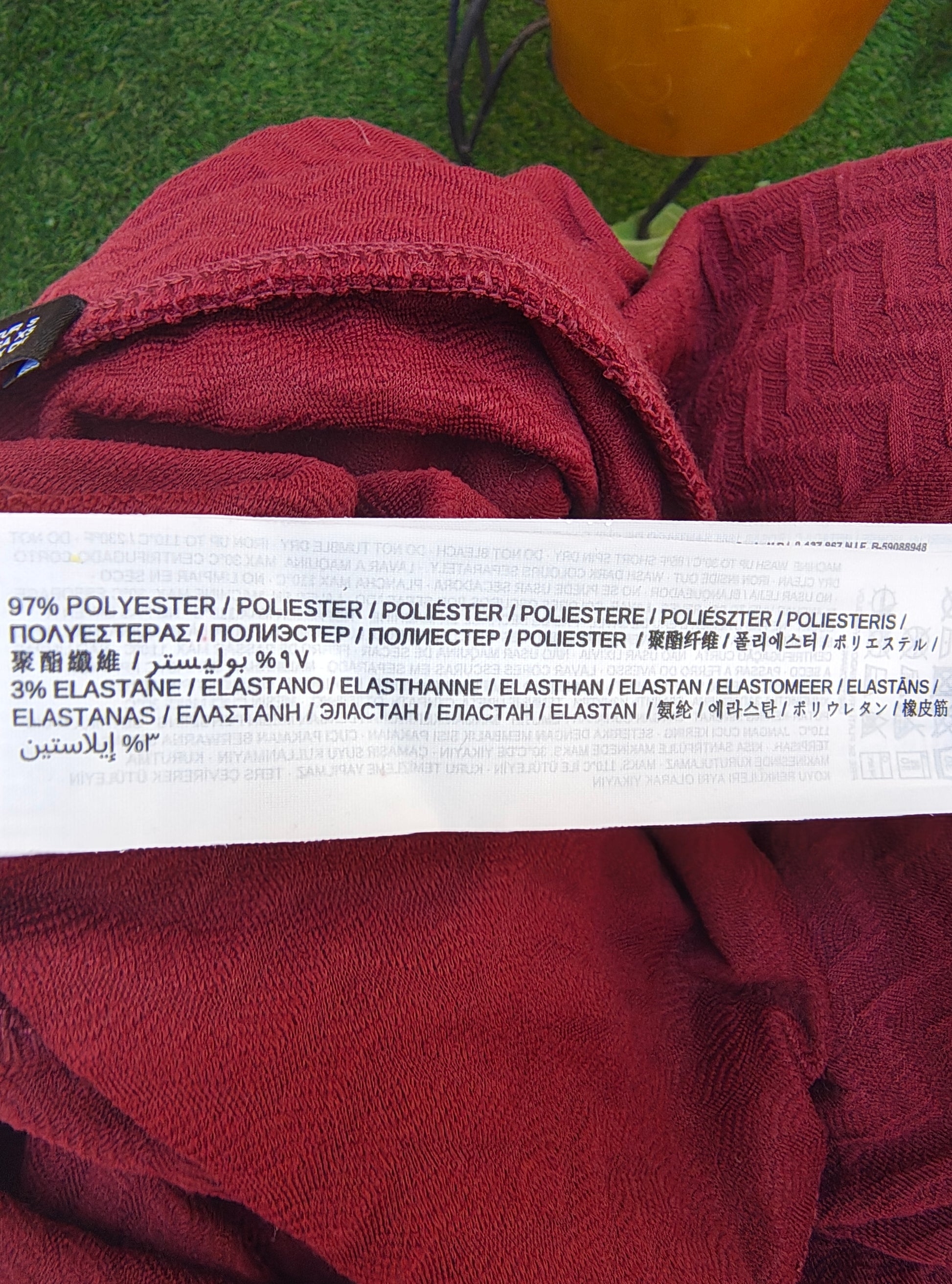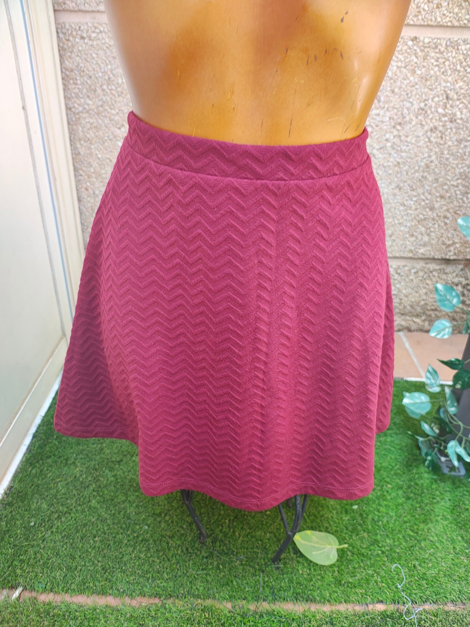 🍷 Jupe courte coupe trapèze bordeaux. Elle présente un motif zigzag en relief et une taille élastique plate. Son tissu doux et fluide est parfait pour mettre en valeur votre silhouette.