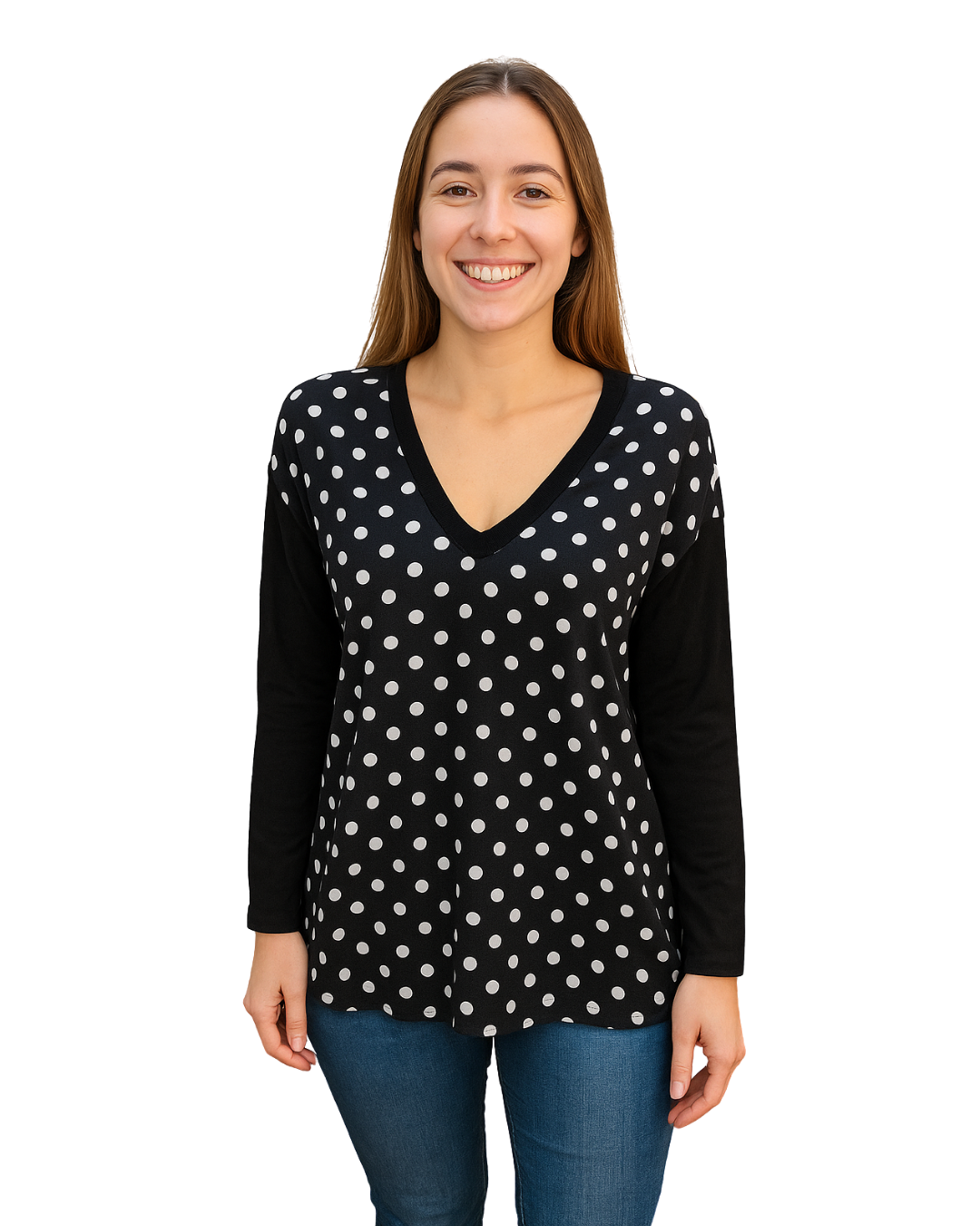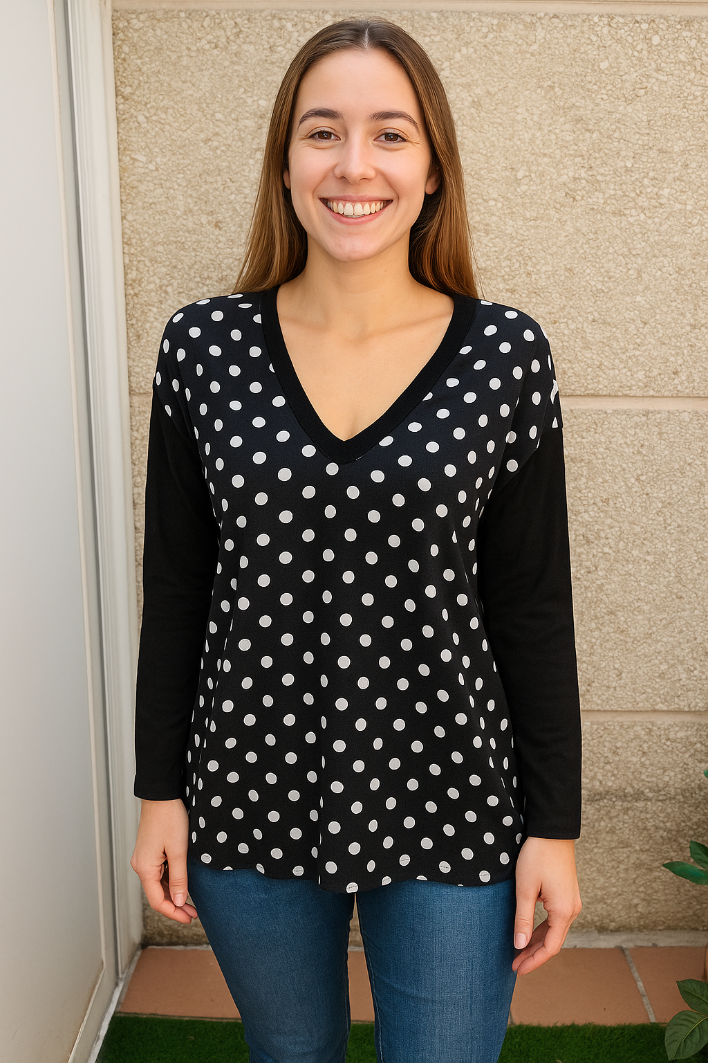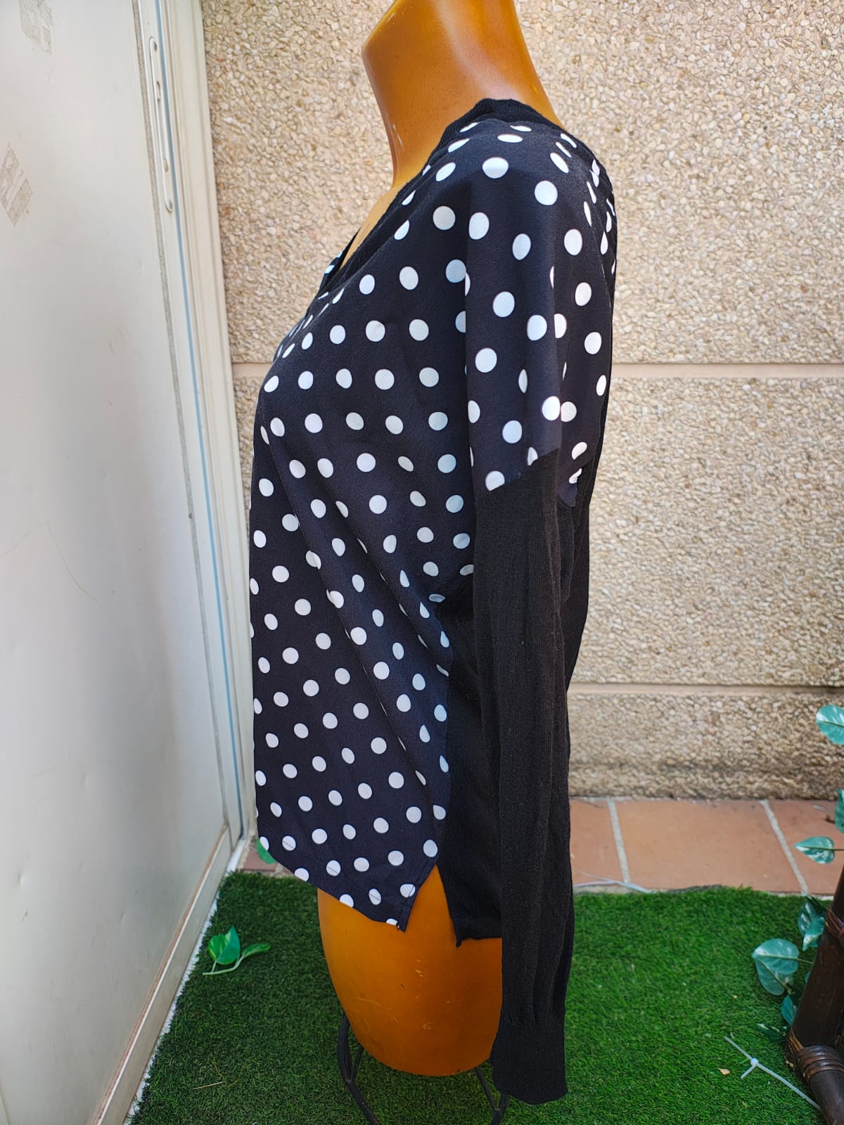 ⚫⚪blusa fina de punto en color negro con diseño de lunares blancos en la parte frontal. Cuello en pico, manga larga lisa en tejido negro y espalda del mismo tono. Corte recto y holgado, ideal para entretiempo. El diseño combina el estilo clásico de los lunares con un toque moderno y cómodo.