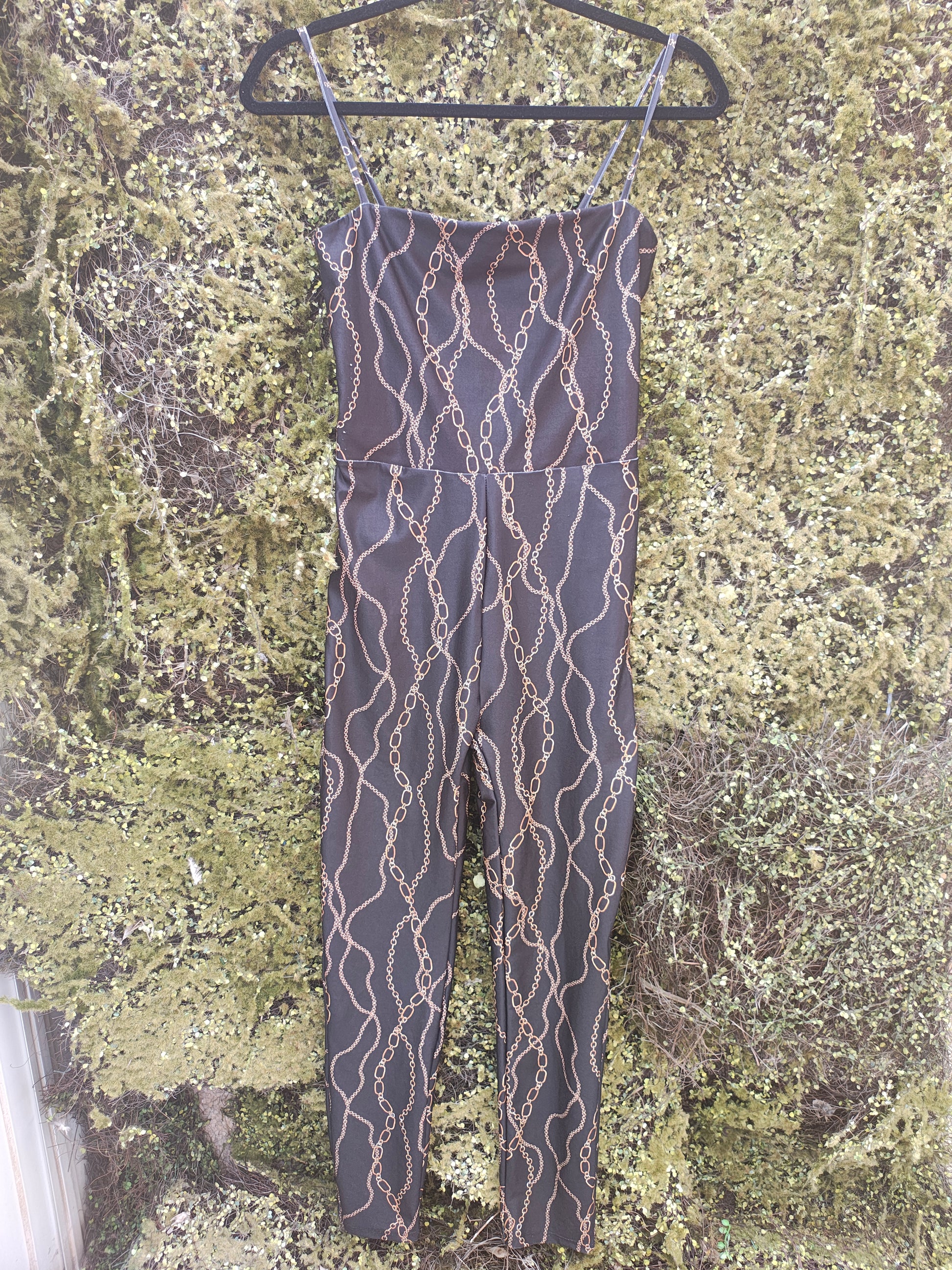 ✨ Combinaison longue et ajustée à fines bretelles et élégant imprimé chaîne dorée sur fond noir. Son décolleté droit et sa taille ajustée flattent la silhouette. Le bas skinny lui confère un look moderne et sophistiqué.
