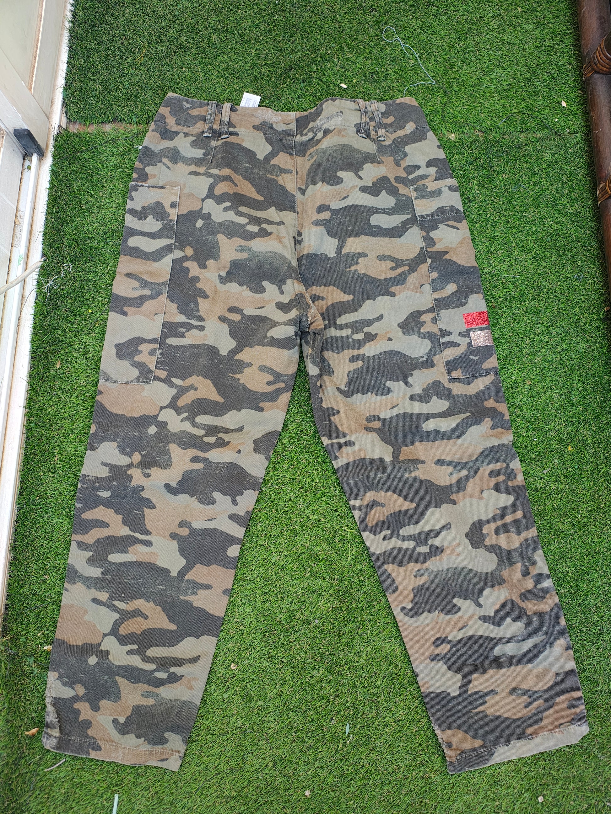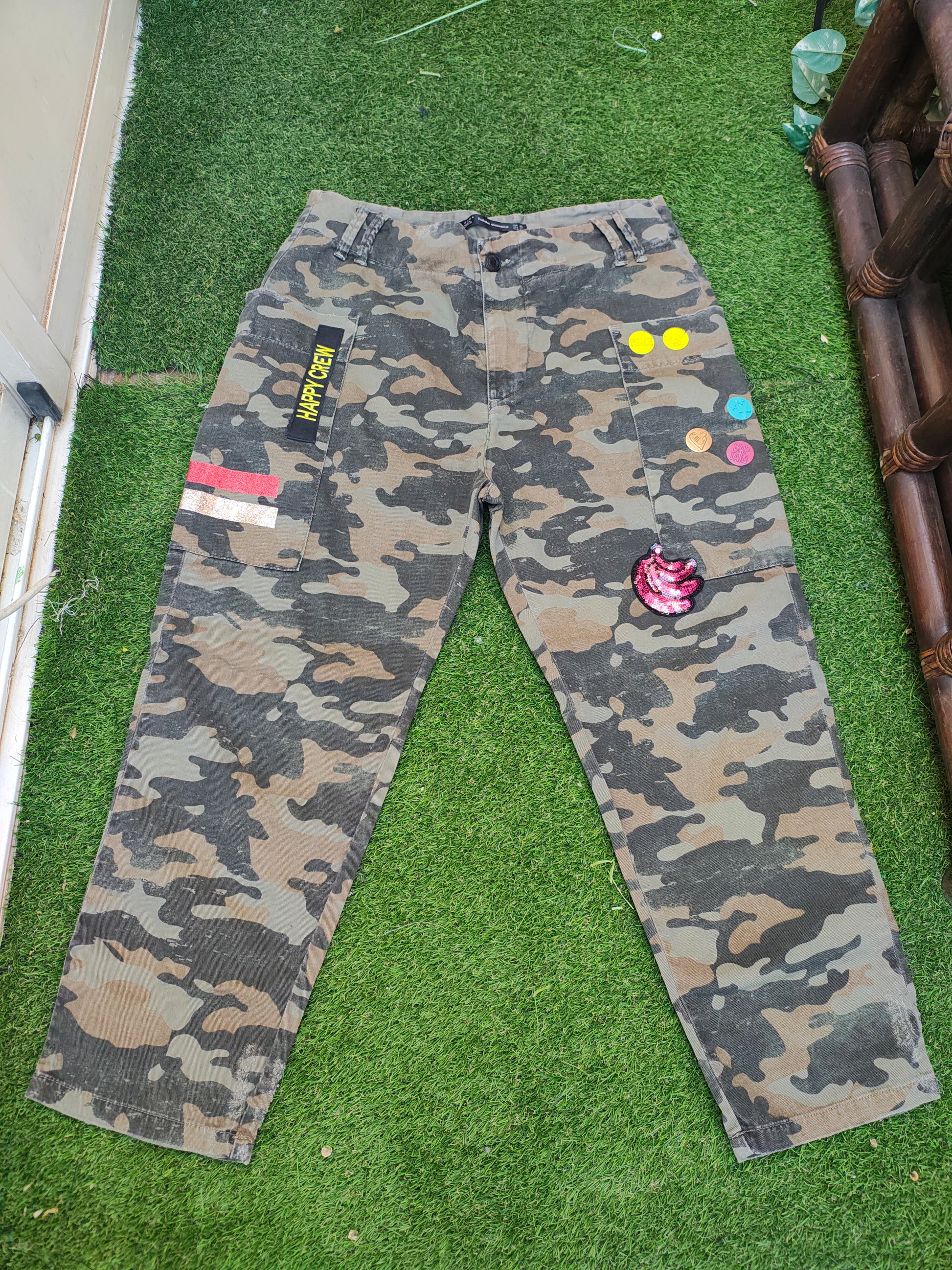 Pantalones de estilo militar con estampado camuflaje en tonos tierra, customizados con parches bordados, lentejuelas y chapas decorativas. Corte recto, tiro medio y bolsillos laterales tipo cargo. Un diseño único con espíritu urbano y rebelde.