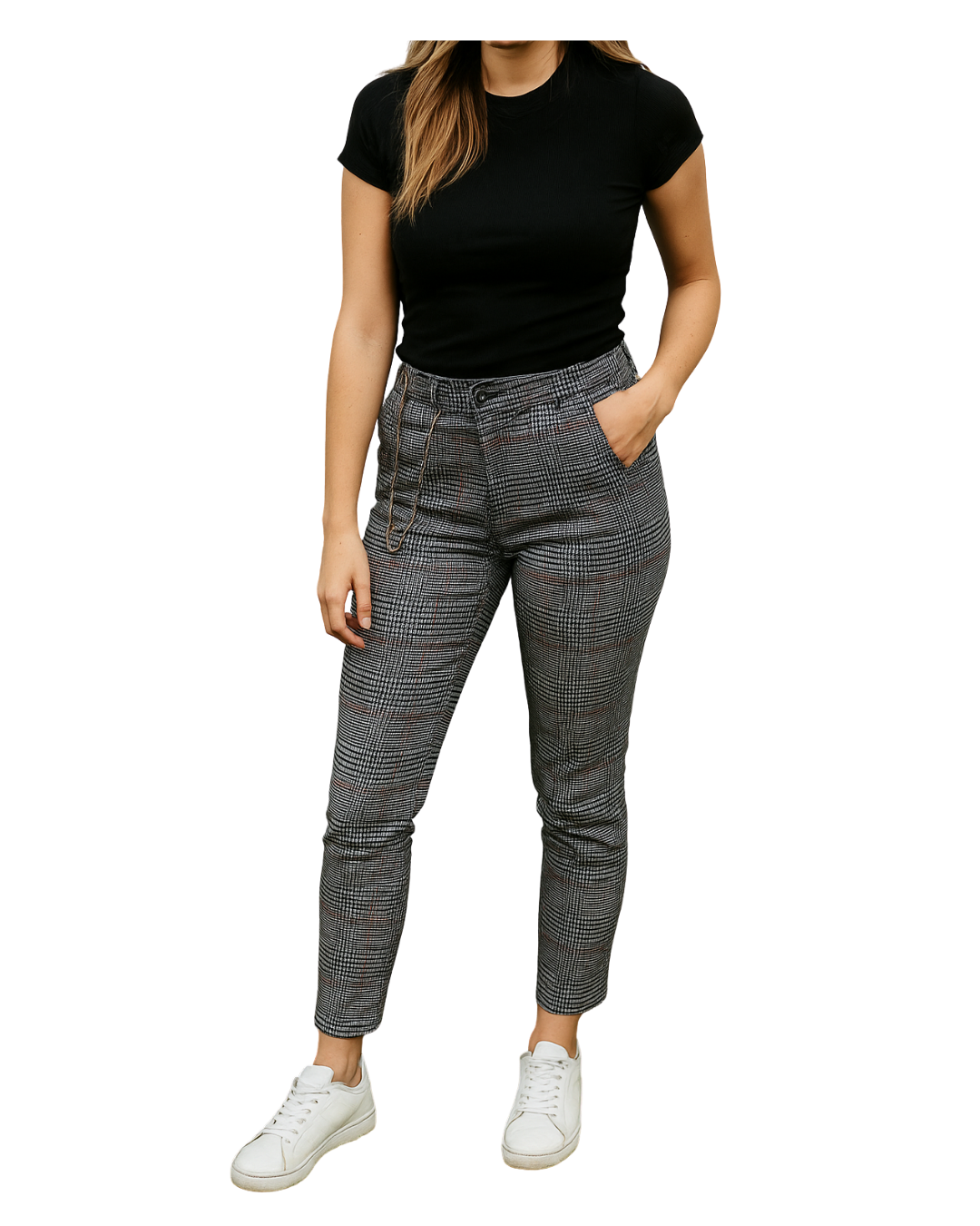 👖 Pantalón de estilo masculino en tejido de cuadros Príncipe de Gales en blanco, negro y finas líneas rojas. Corte entallado tipo pitillo, con bolsillos laterales, cremallera frontal y cinturilla con trabillas. Incluye cadena metálica decorativa desmontable en un lateral.