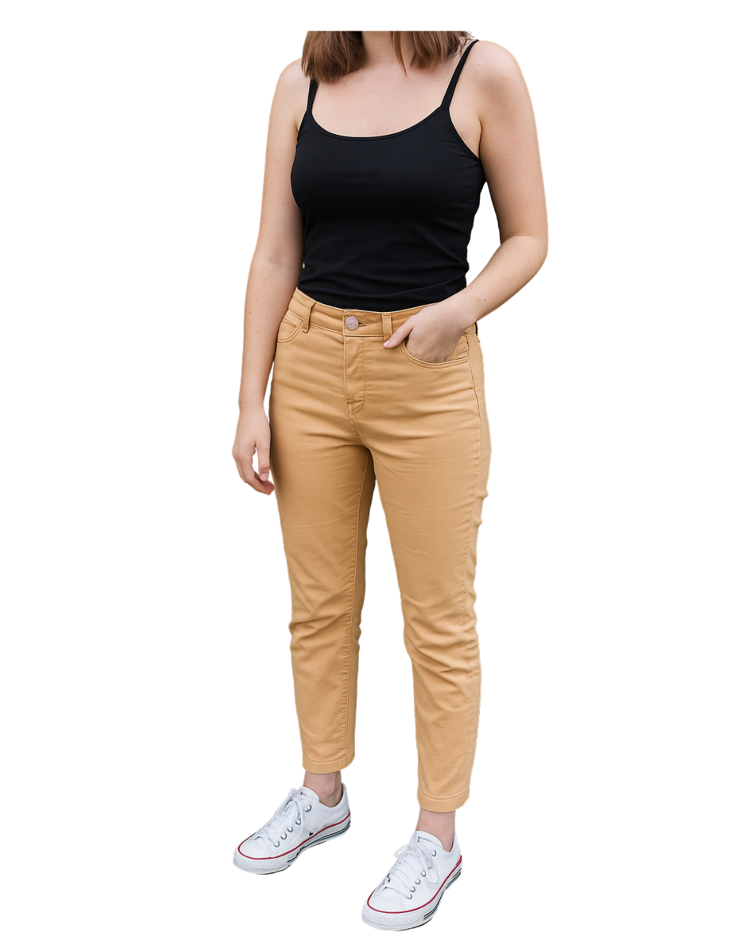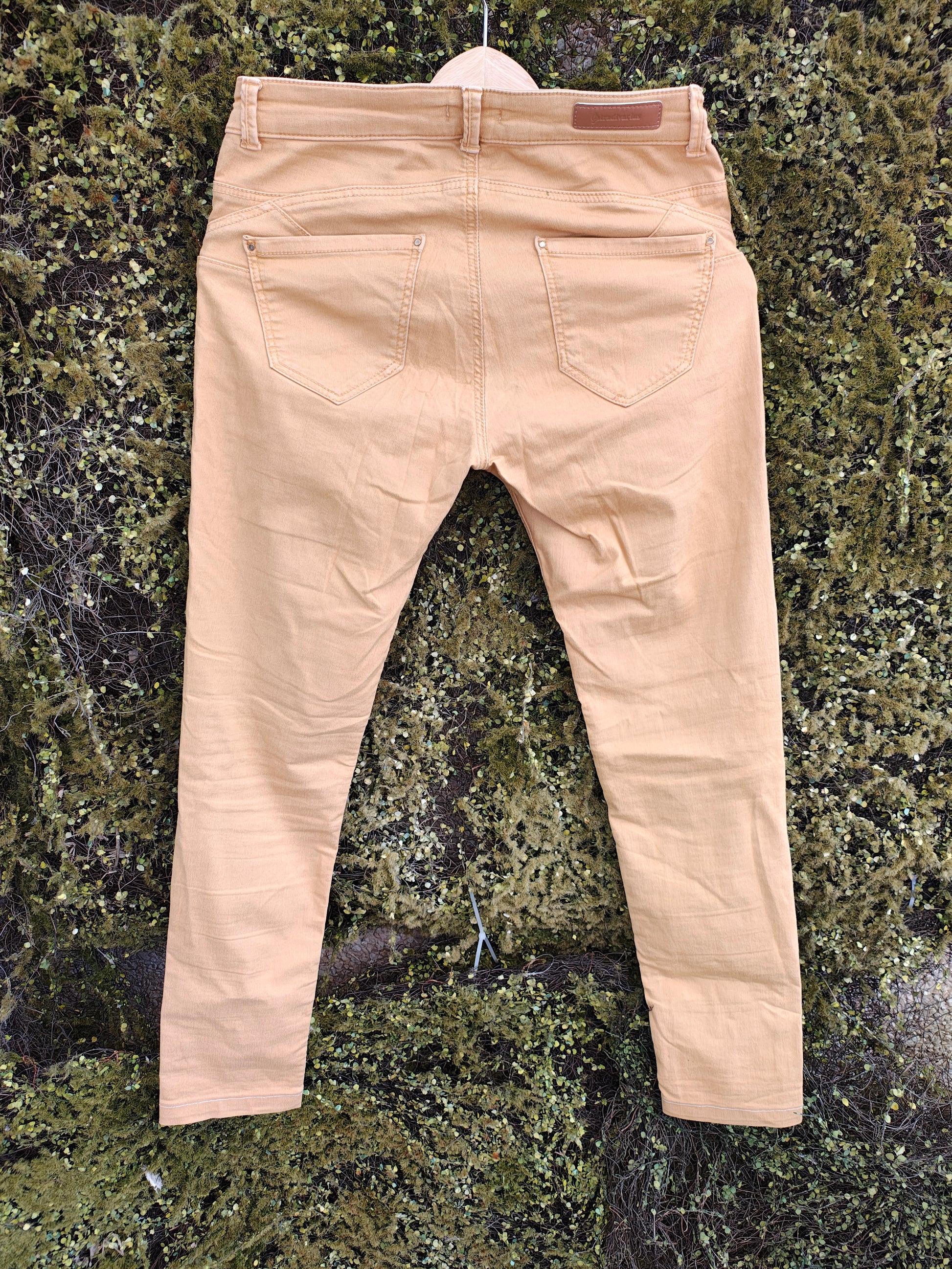 👖 Pantalon long skinny couleur moutarde, idéal pour ajouter une touche de couleur à vos tenues du quotidien. Coupe slim, taille mi-haute, cinq poches, fermeture zippée et bouton métallique. Son design classique et polyvalent en fait une pièce parfaite aussi bien pour les tenues de bureau que pour des tenues plus décontractées, avec des baskets ou des chemisiers amples.