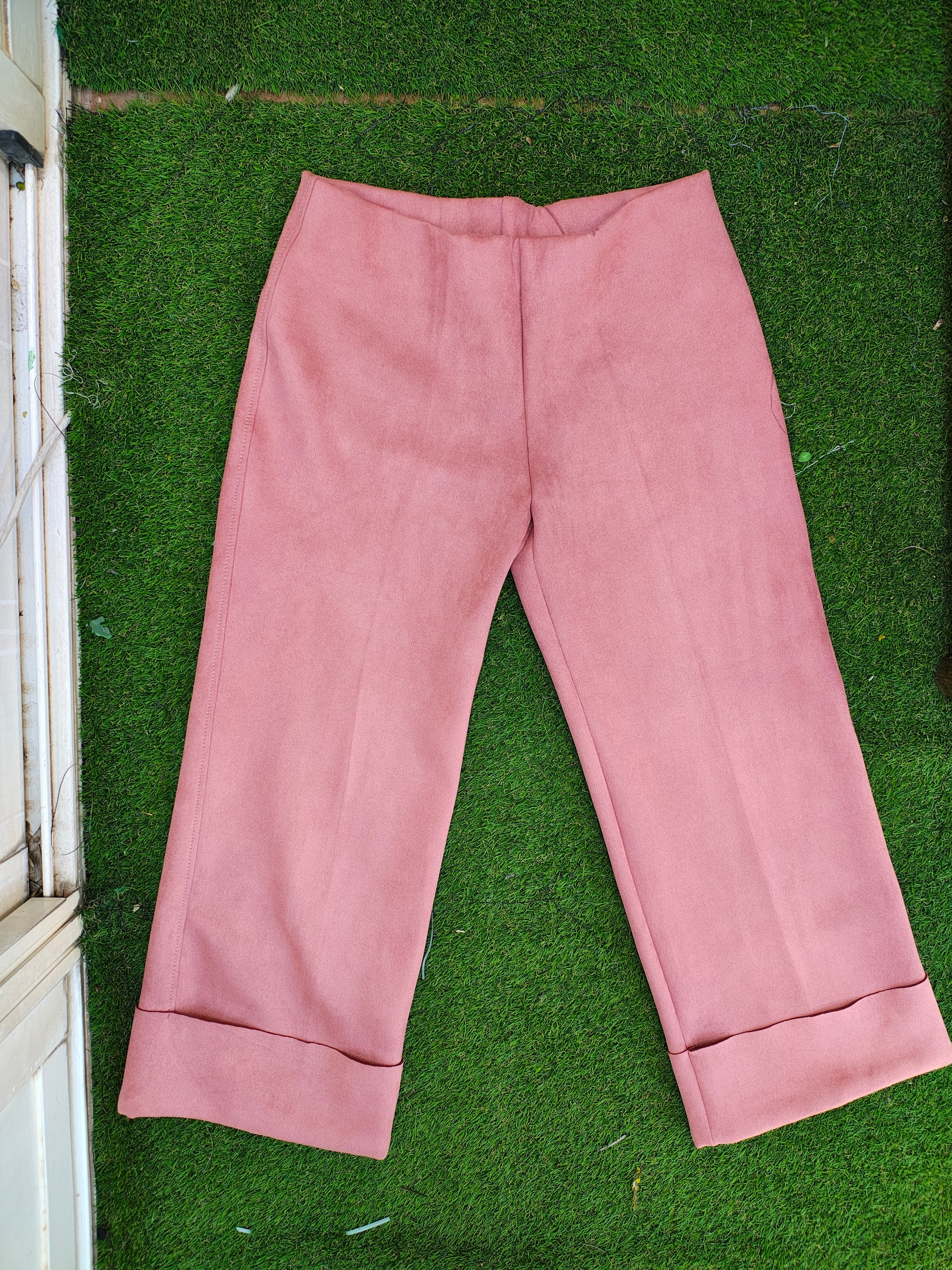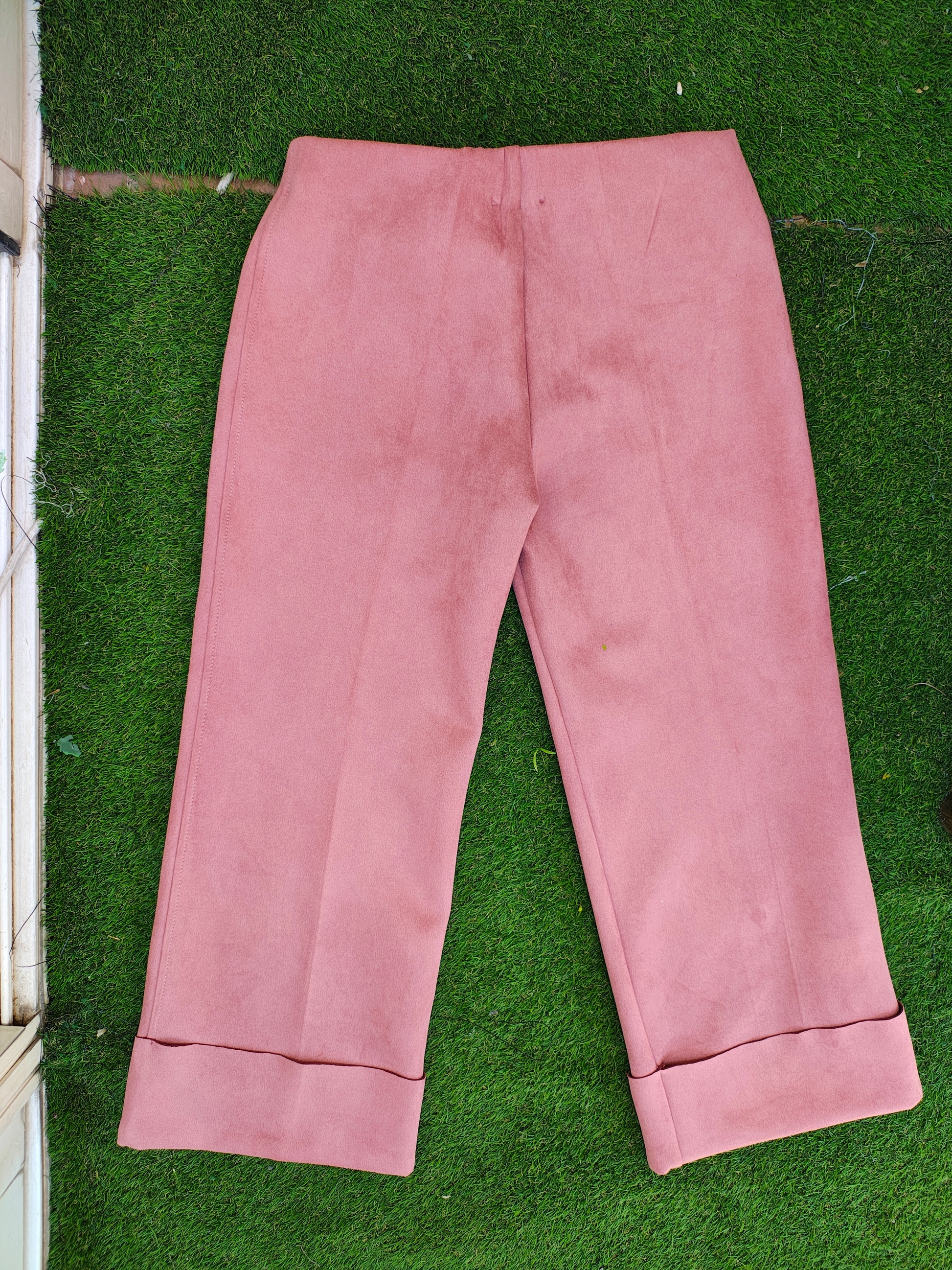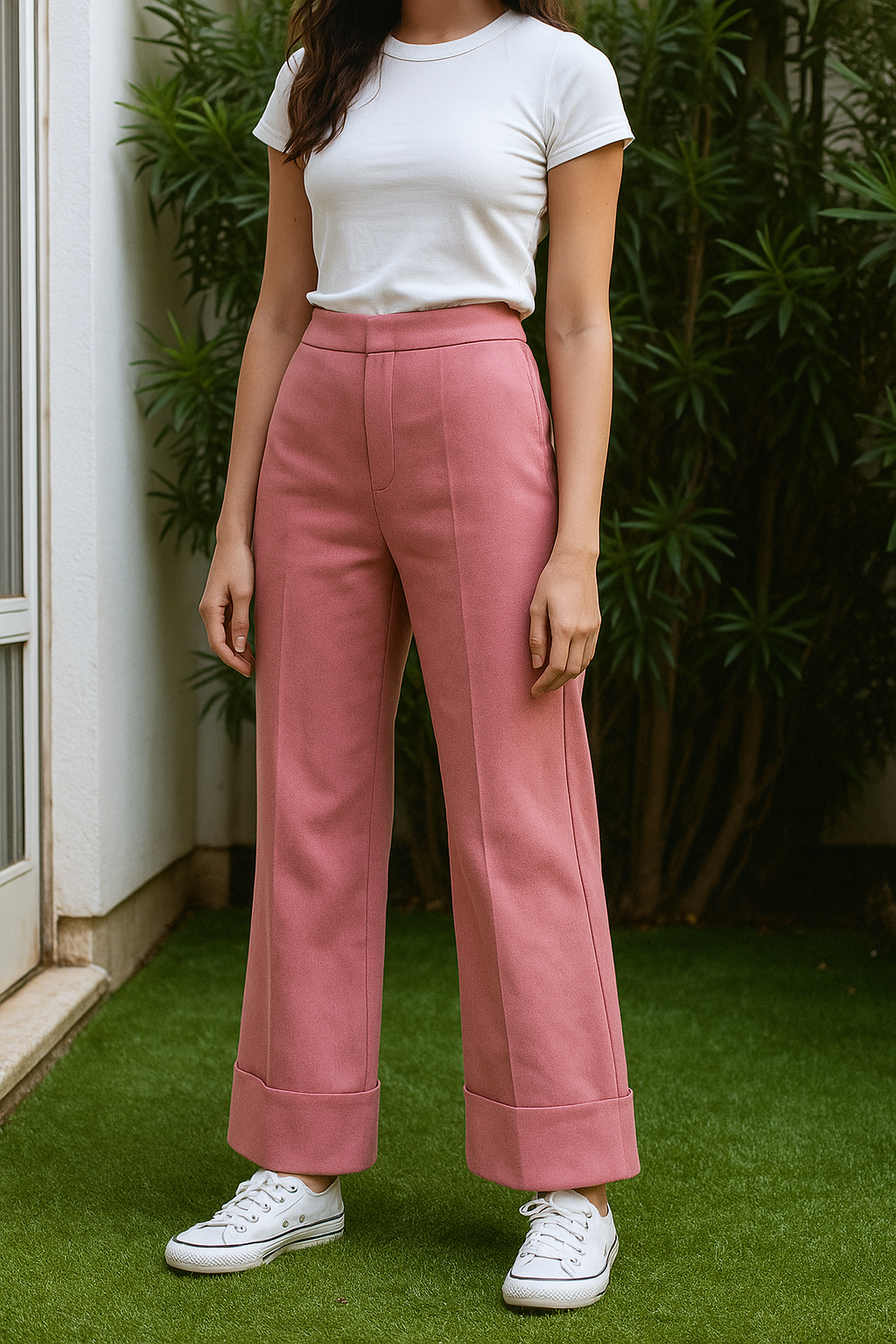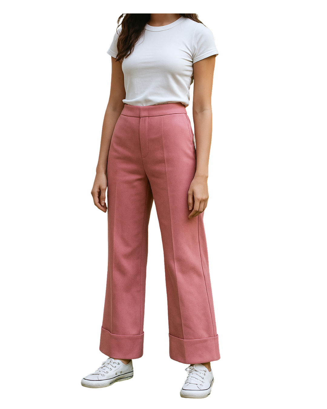🌷 Pantalón largo de tiro medio-alto en color rosa empolvado con acabado tipo ante suave al tacto. Corte recto con bajo vuelto para un estilo relajado y contemporáneo. Ideal para looks urbanos o de oficina con un toque sofisticado.