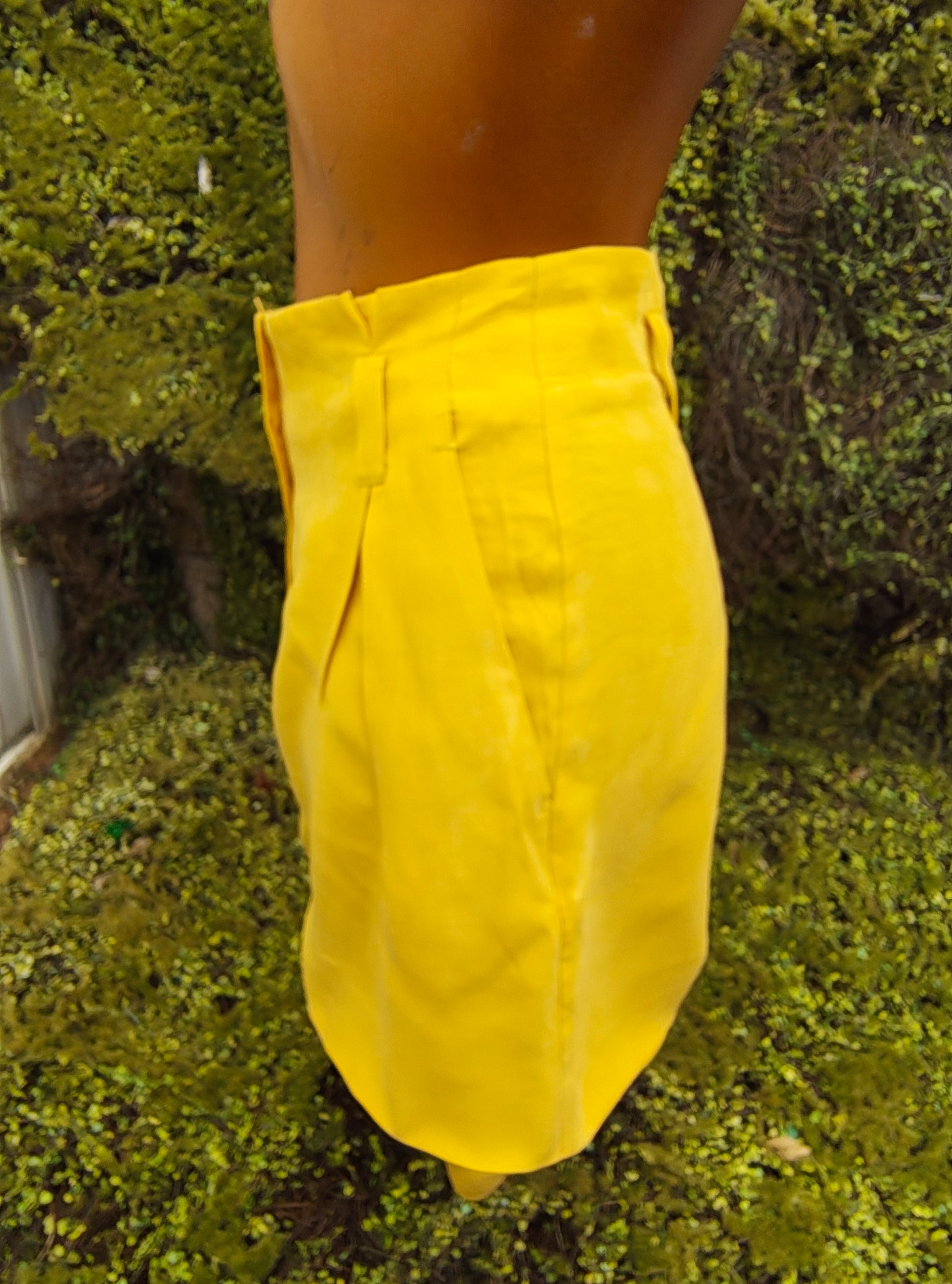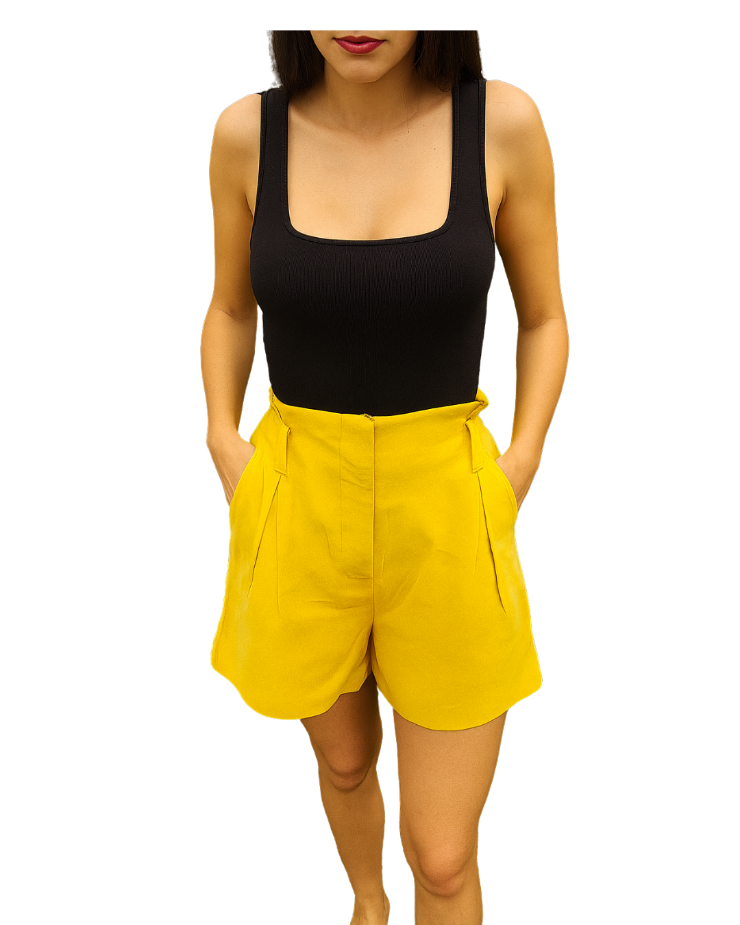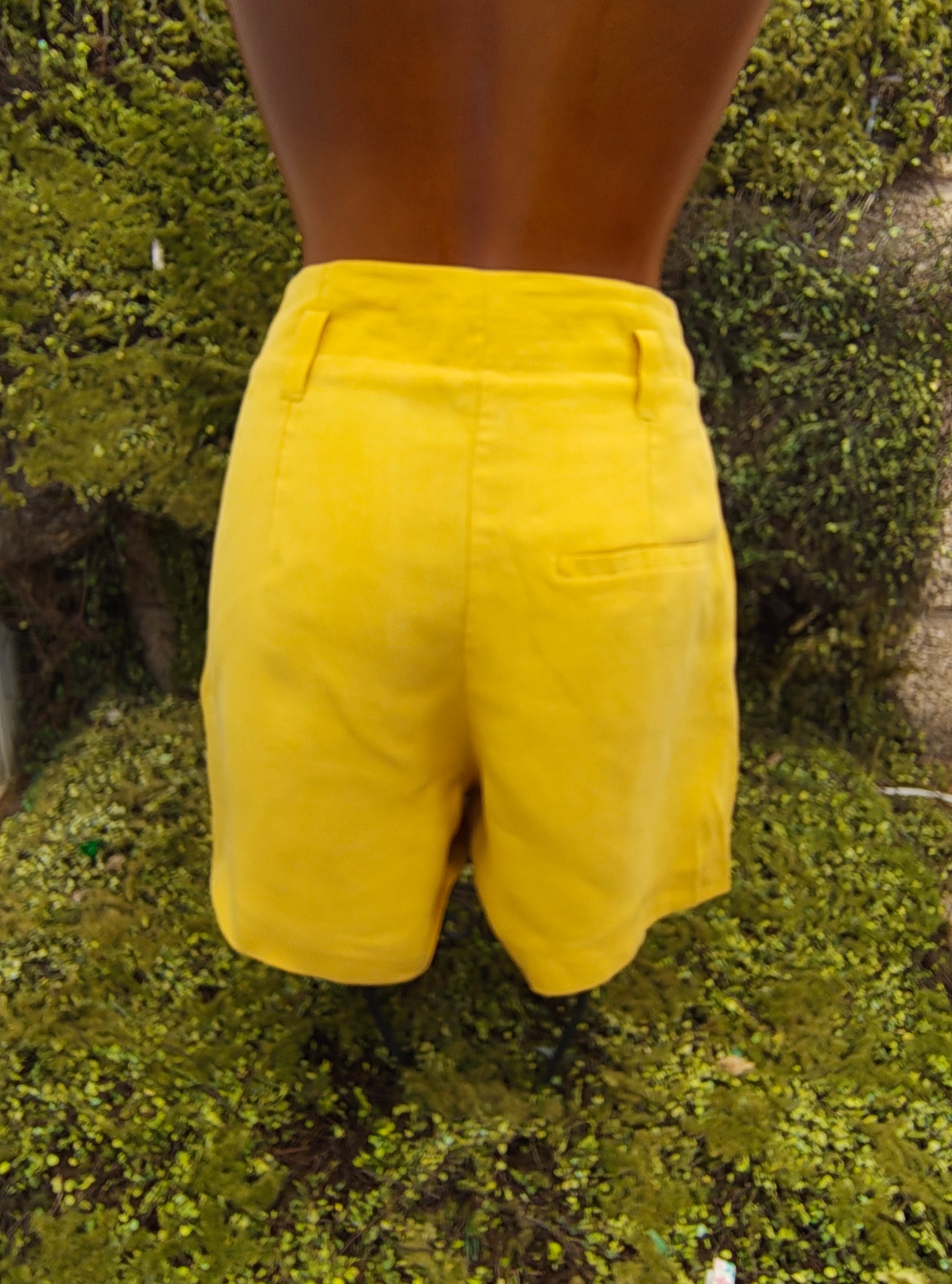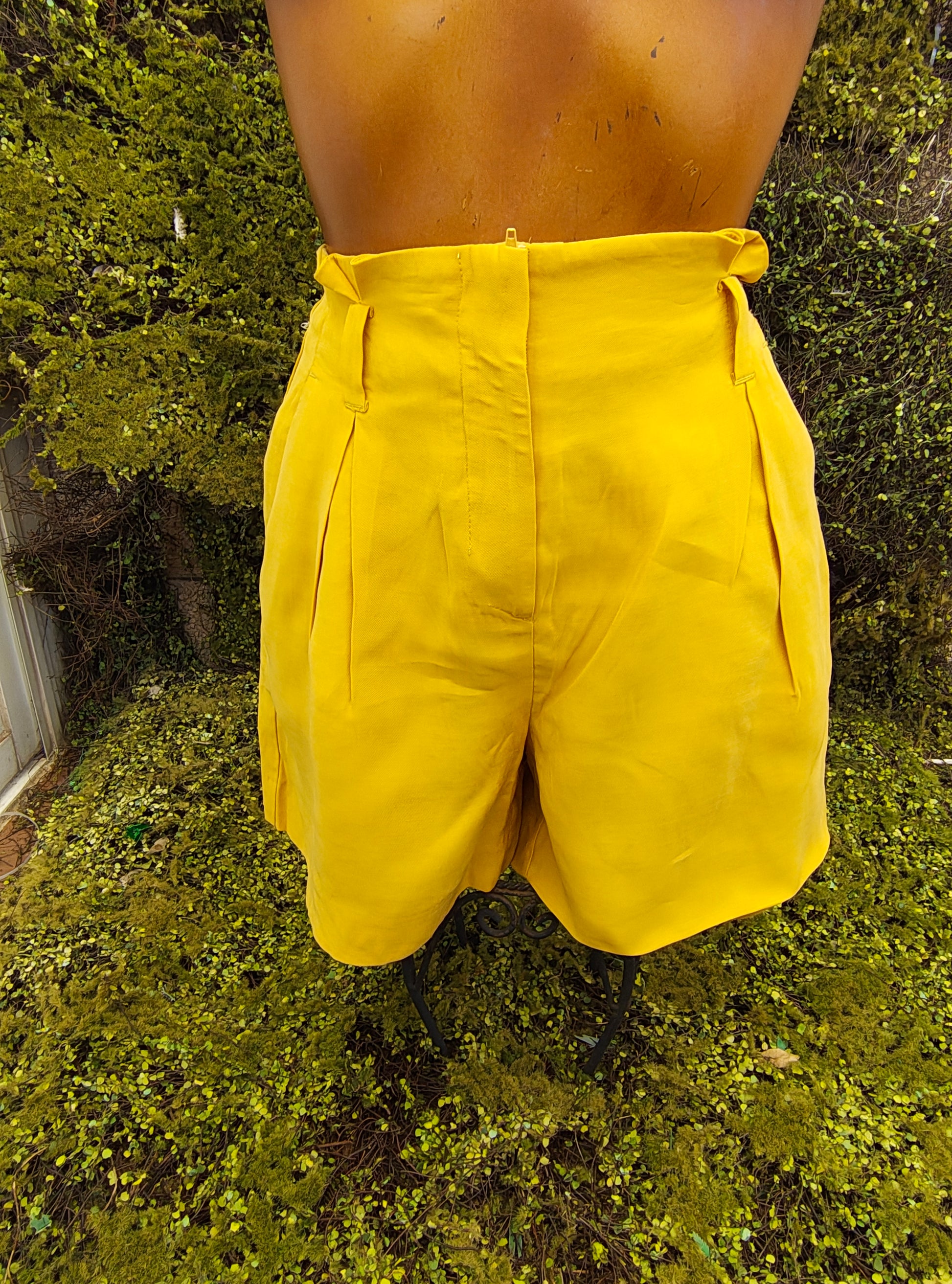 ✨ Short élégant d'une joyeuse couleur moutarde qui sublimera toutes vos tenues d'été. Taille haute avec pinces avant flatteuses, fermeture zippée dissimulée et ceinture structurée avec passants.