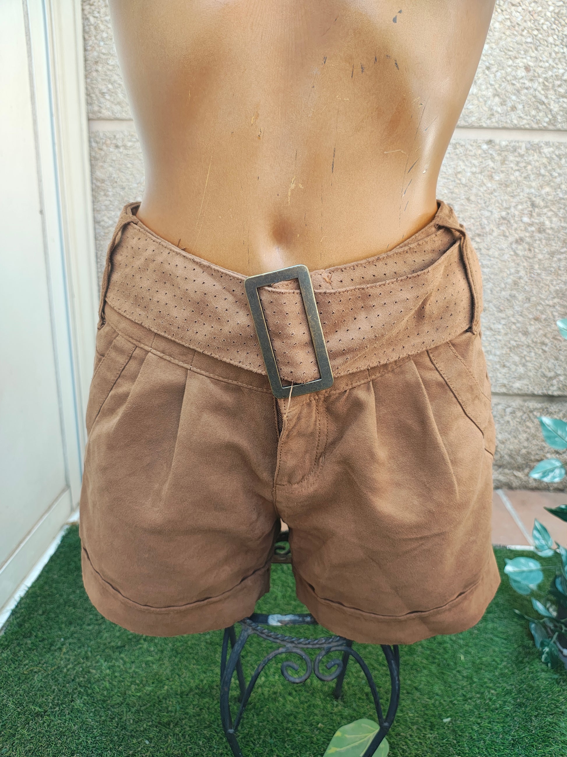 Short style safari marron terreux avec large ceinture effet daim découpée et boucle en métal. Il présente des plis sur le devant, des poches plaquées au dos et un ourlet à revers. Sa coupe droite flatte la silhouette et son tissu doux effet daim.