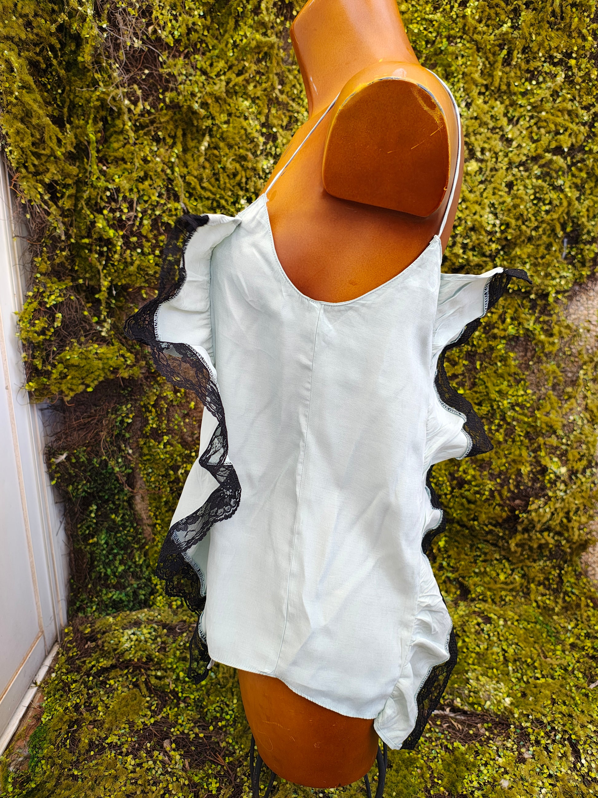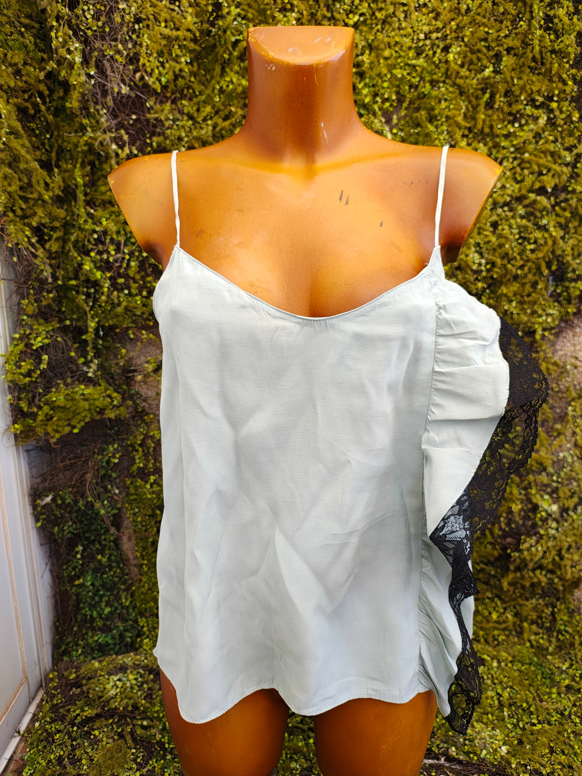 D'OCCASION - Haut asymétrique gris clair à volants en dentelle noire (Taille S)