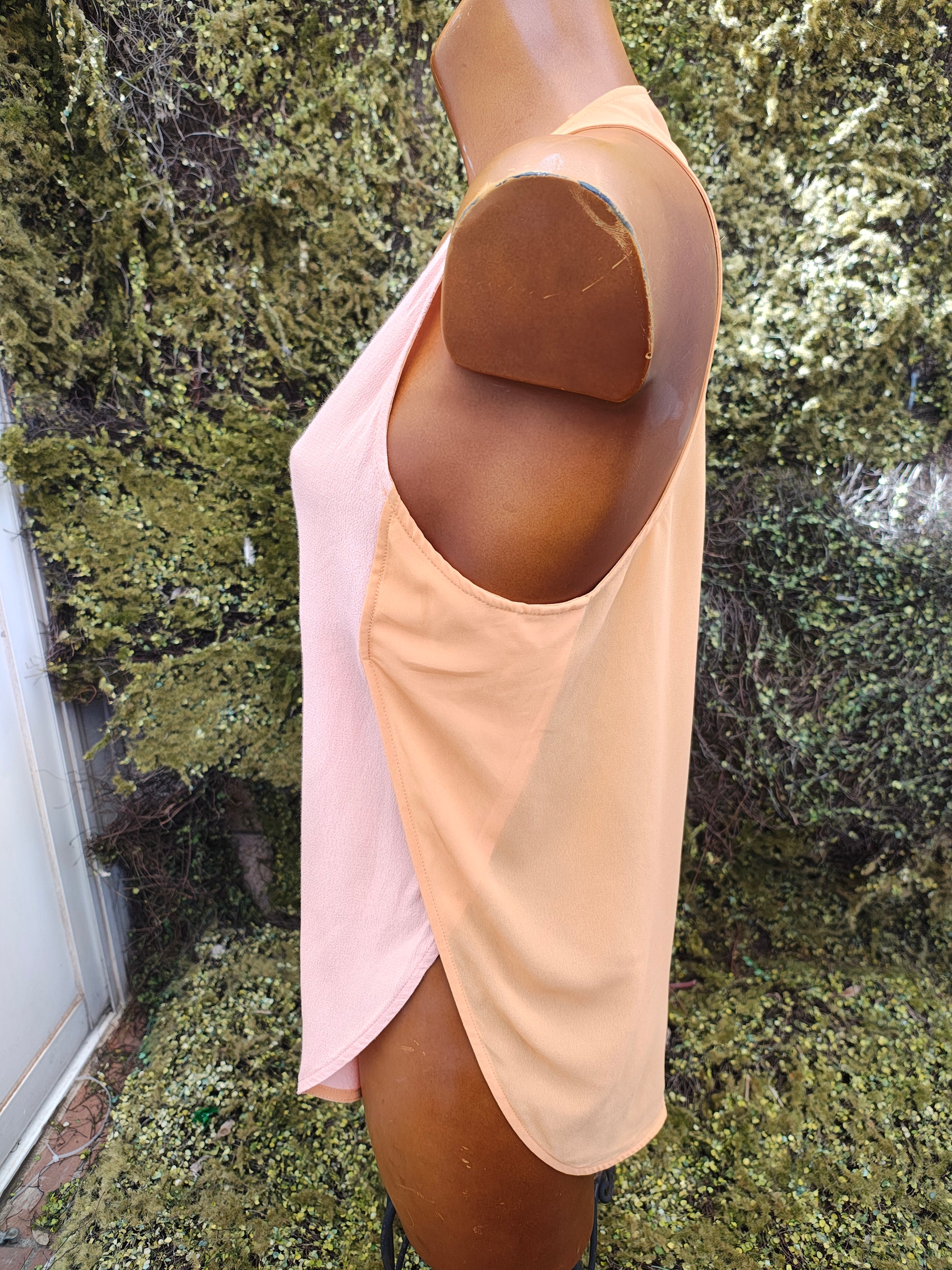 Haut décontracté, léger et tendance, de la collection W&B de ZARA. Il présente un dos nageur sans manches avec un joli contraste bicolore : un devant rose poudré et un dos orange vif. Idéal pour les journées d'été ou pour des looks décontractés avec un short en jean ou une jupe midi.