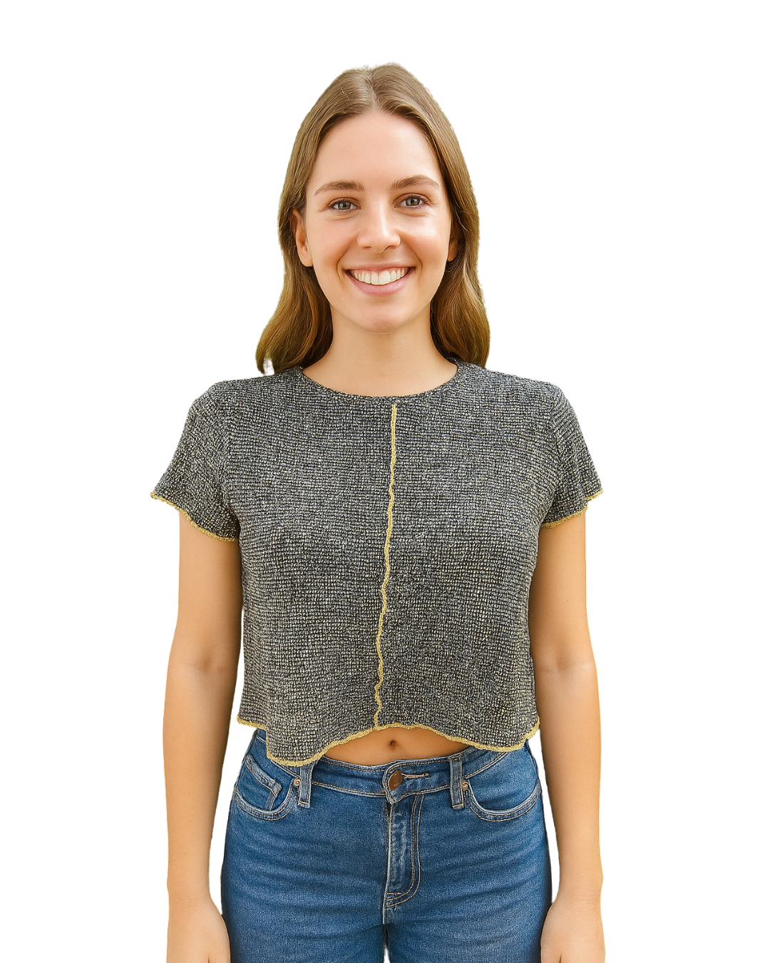 ✨ Modèle à manches courtes avec une couture avant ondulée jaune contrastante qui traverse verticalement le vêtement.