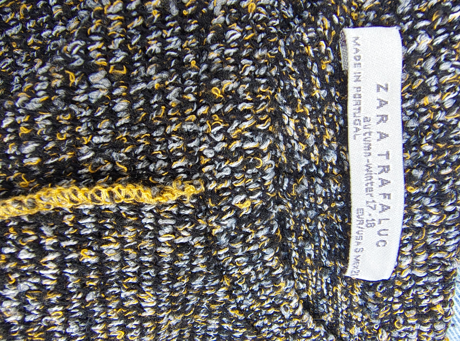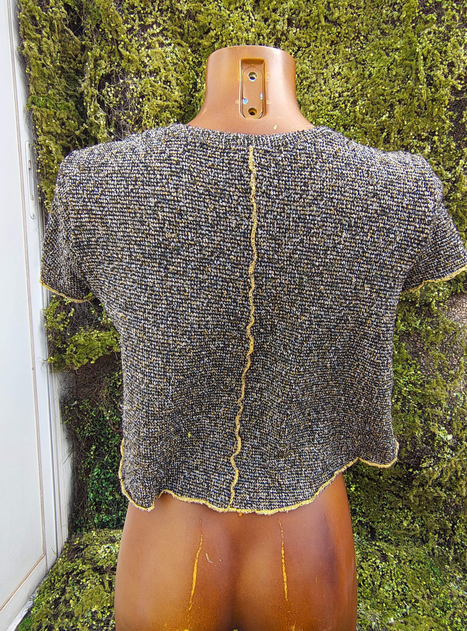 🧶 Haut en grosse maille avec un mélange de fils noirs, gris et moutarde, lui donnant une texture visuelle très particulière.