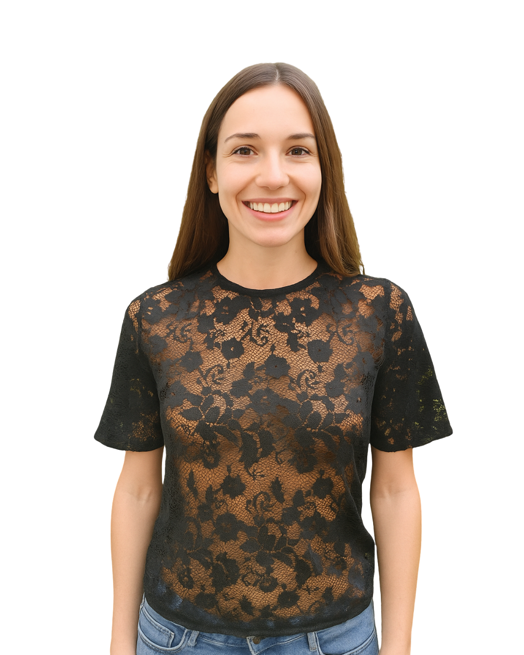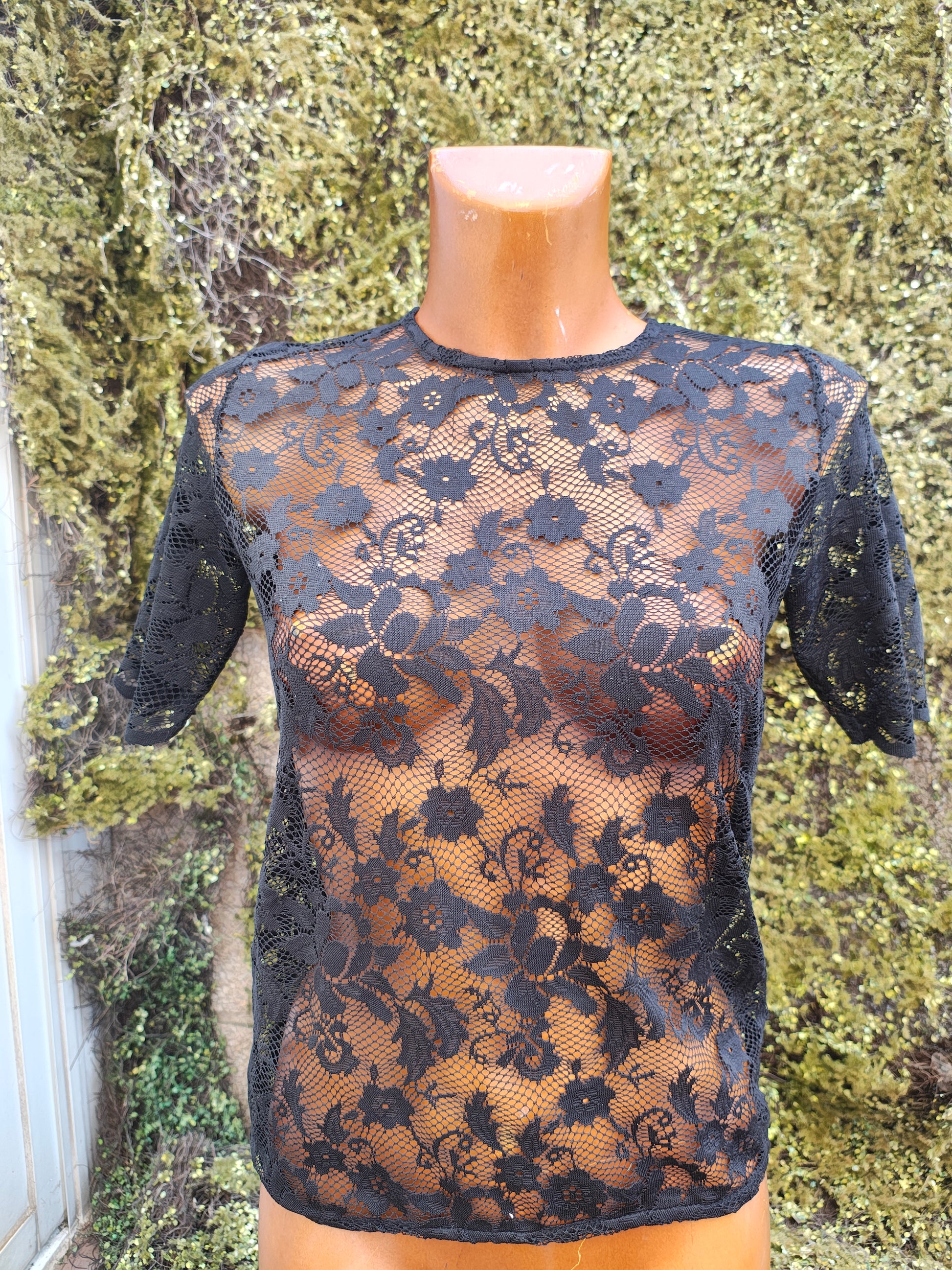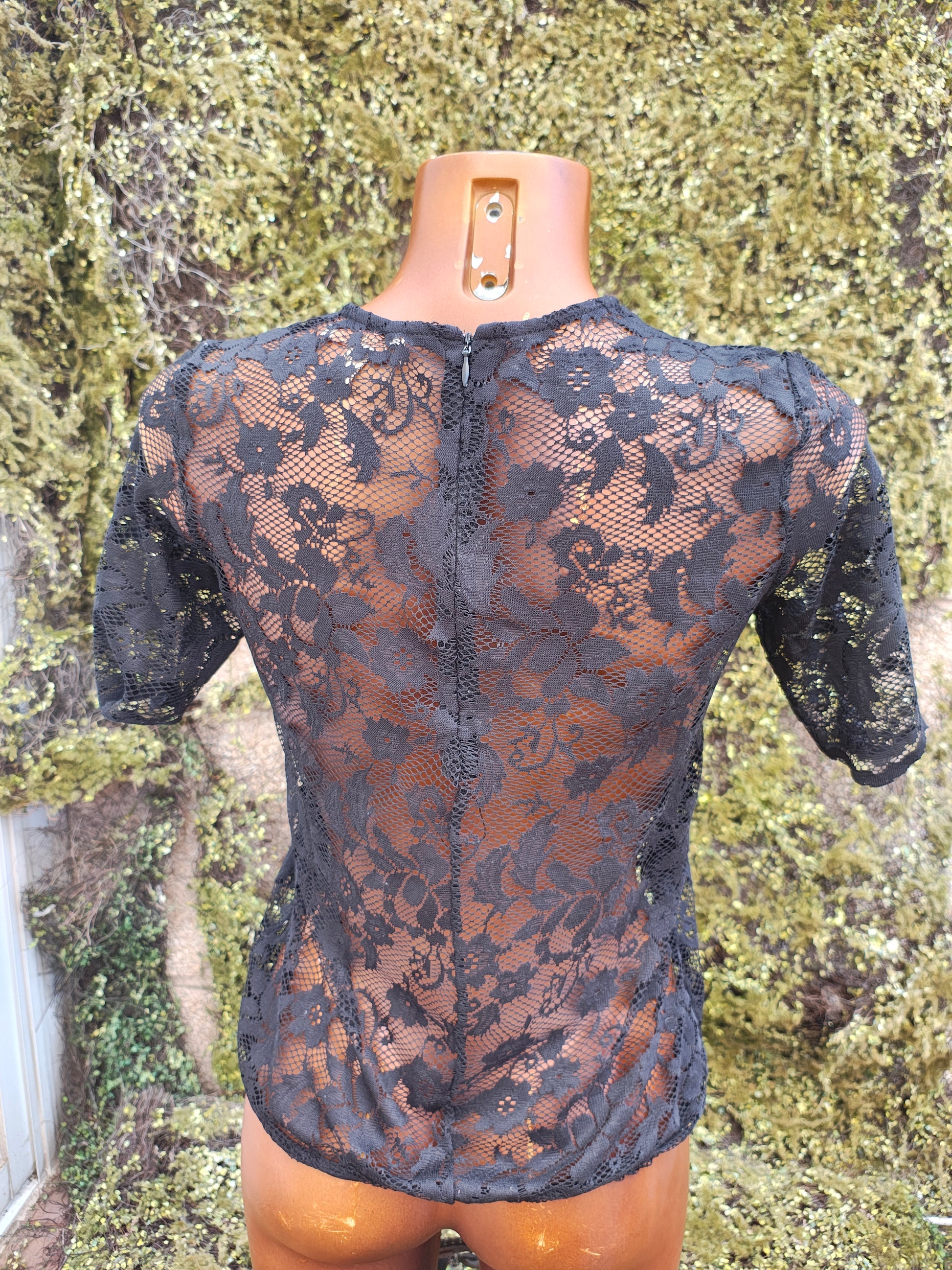 👚 Haut à manches courtes entièrement confectionné en dentelle florale semi-transparente. Coupe ajustée, encolure ronde et fermeture zippée invisible au dos. Élégant et sensuel, ce modèle est parfait pour les tenues de soirée ou associé à des basiques unis contrastants.
