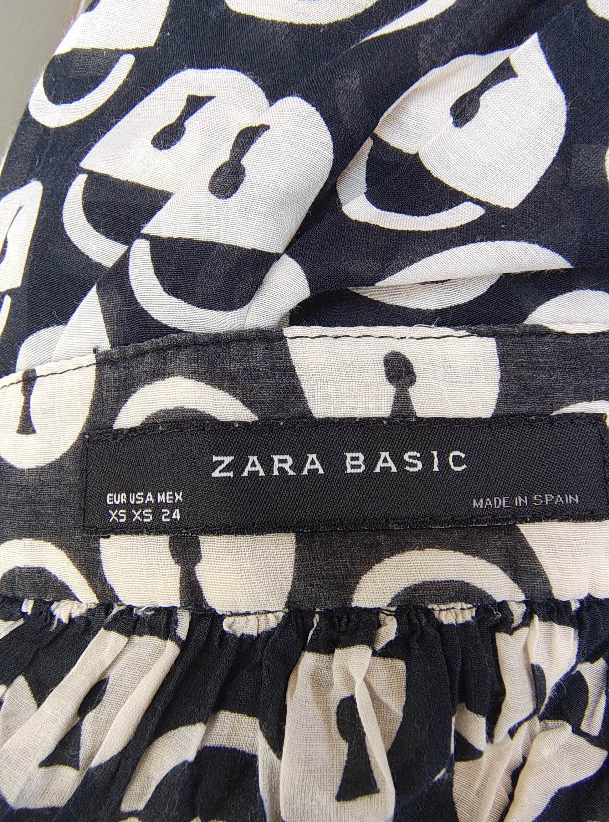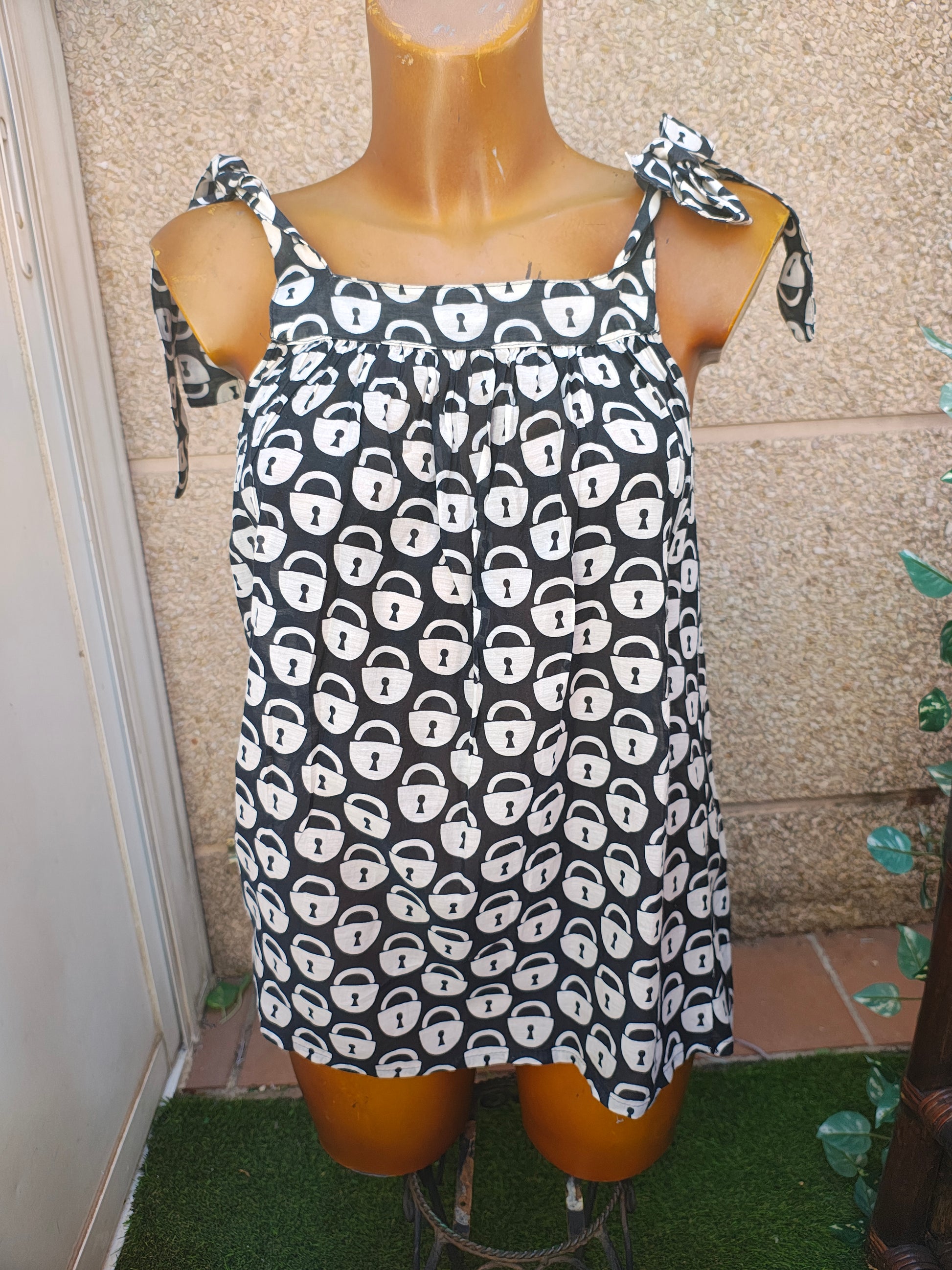🖤 Dale un toque original y urbano a tu look con este top negro de la línea Zara Basic, decorado con un divertido estampado blanco de candados. Presenta tirantes anchos con lazo ajustable sobre los hombros, escote cuadrado y caída suelta tipo blusón, ideal para los días de verano.