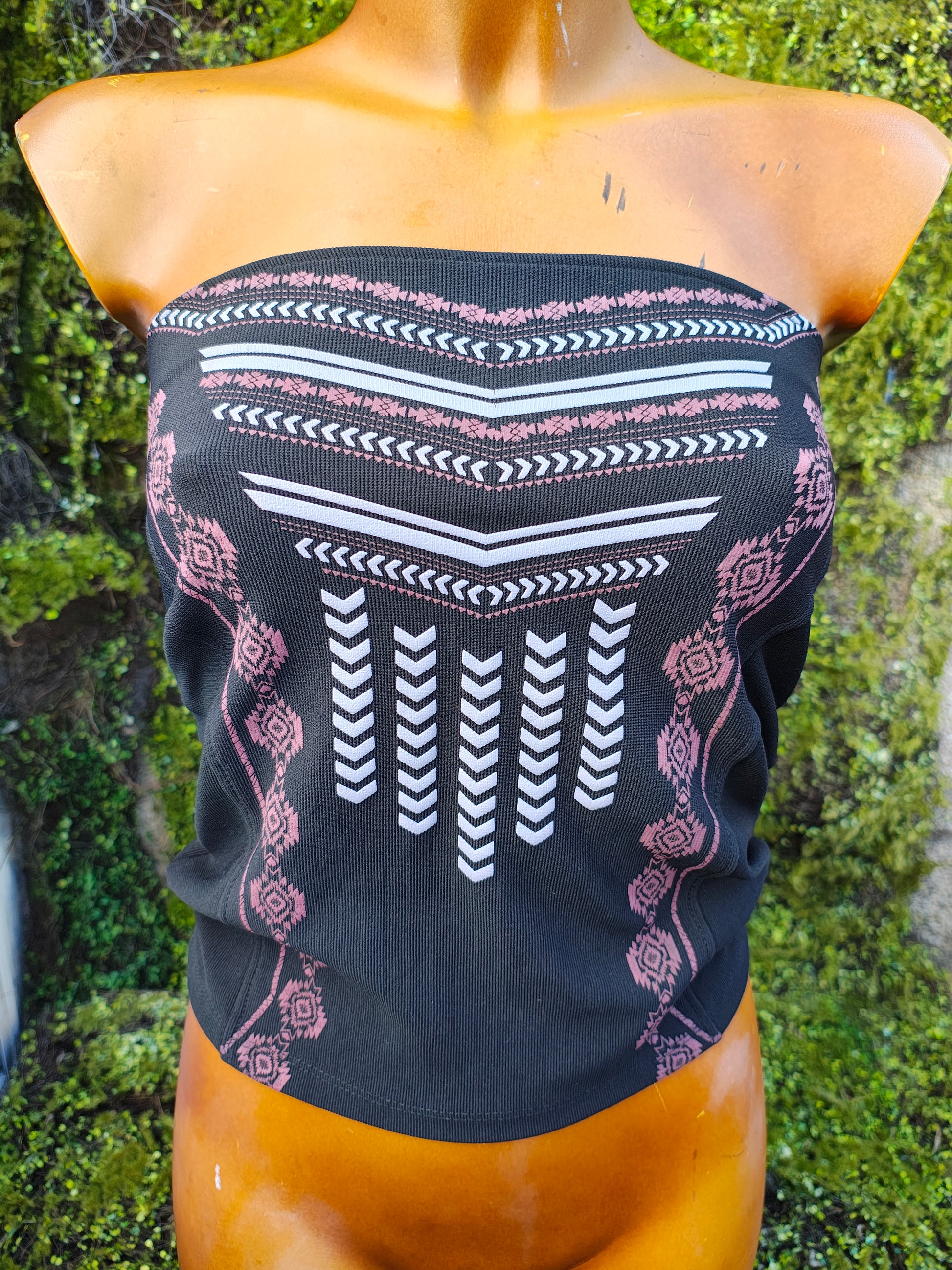 ⚡ Haut bustier avec un motif tribal blanc et rose sur fond noir.