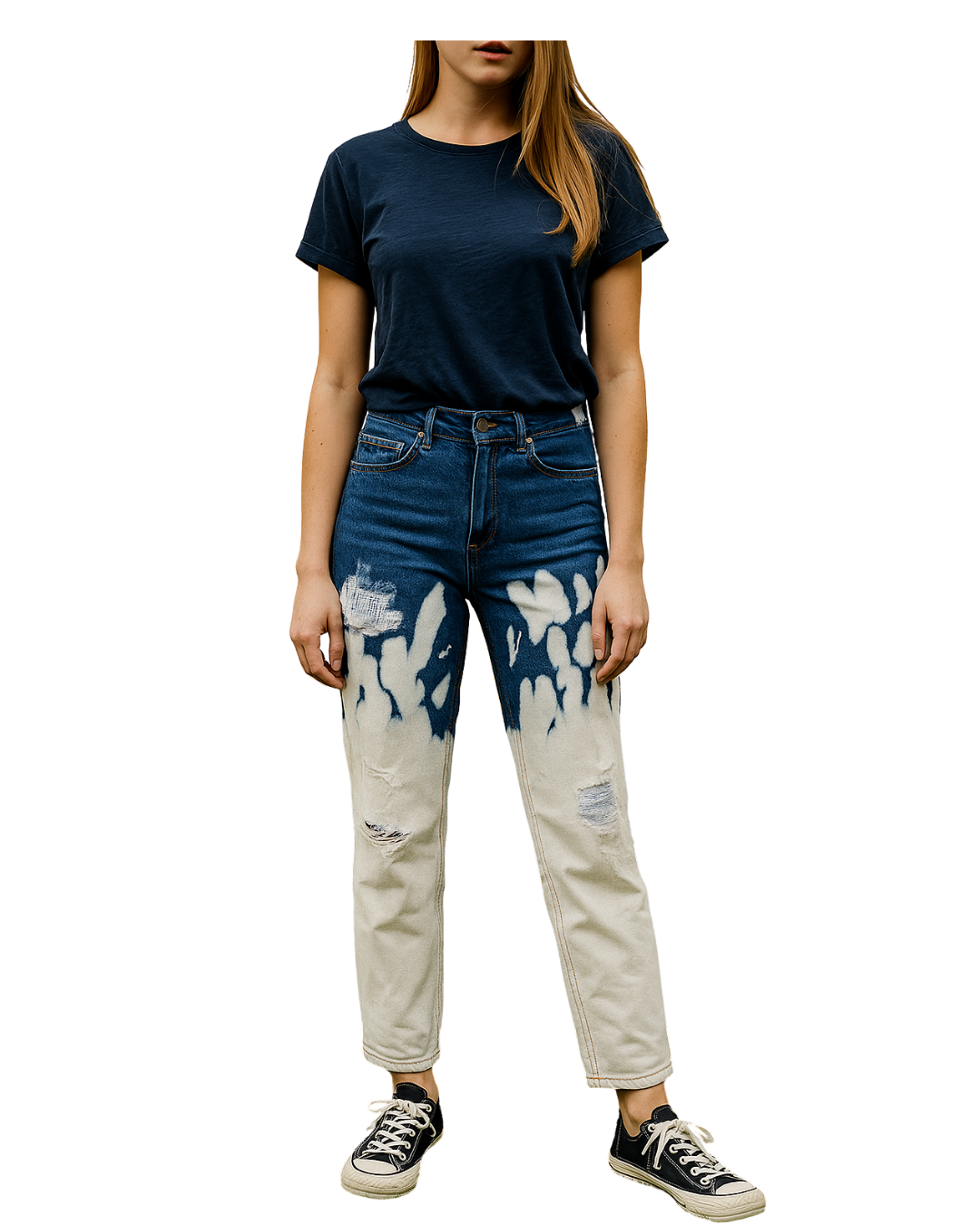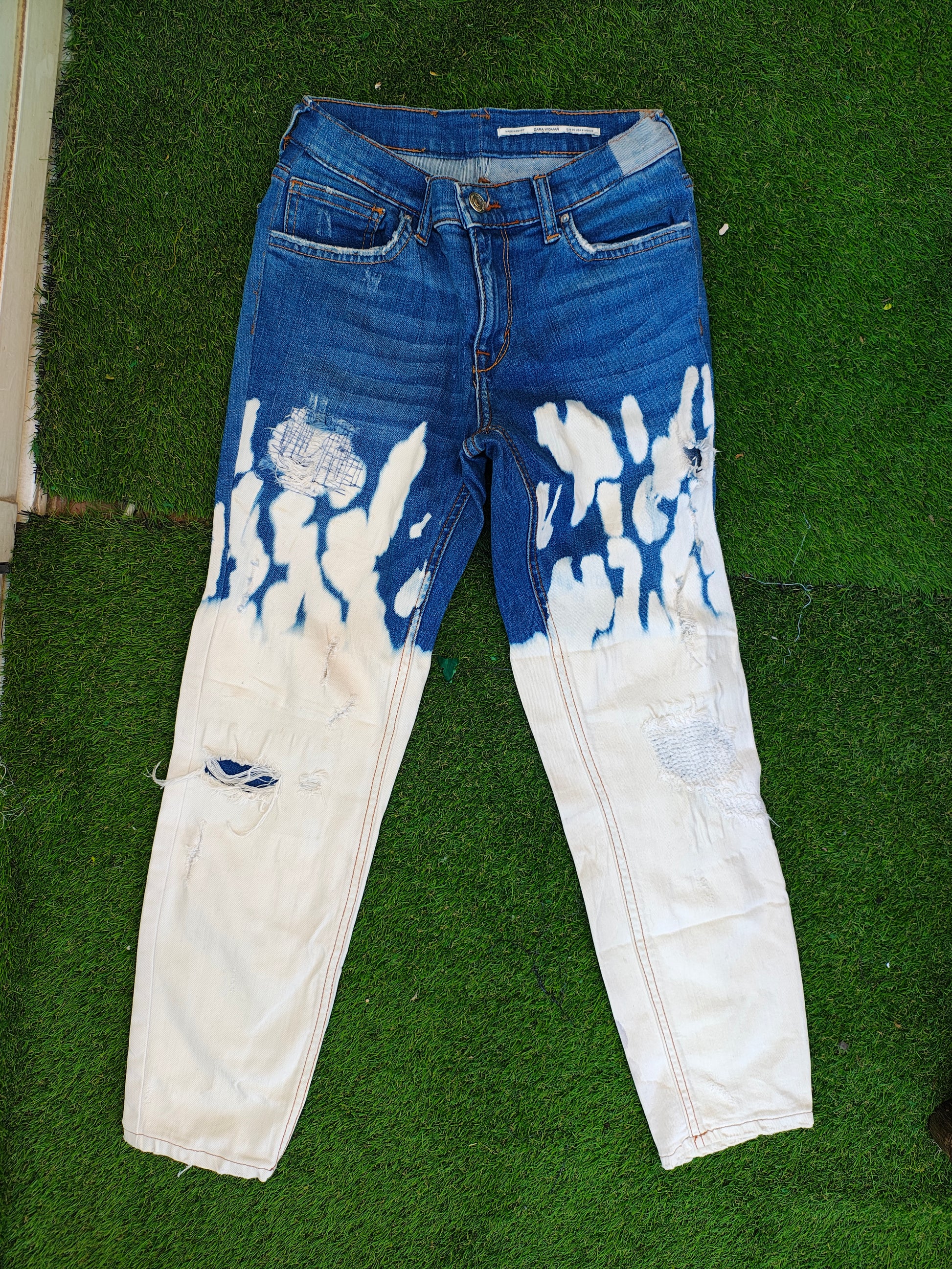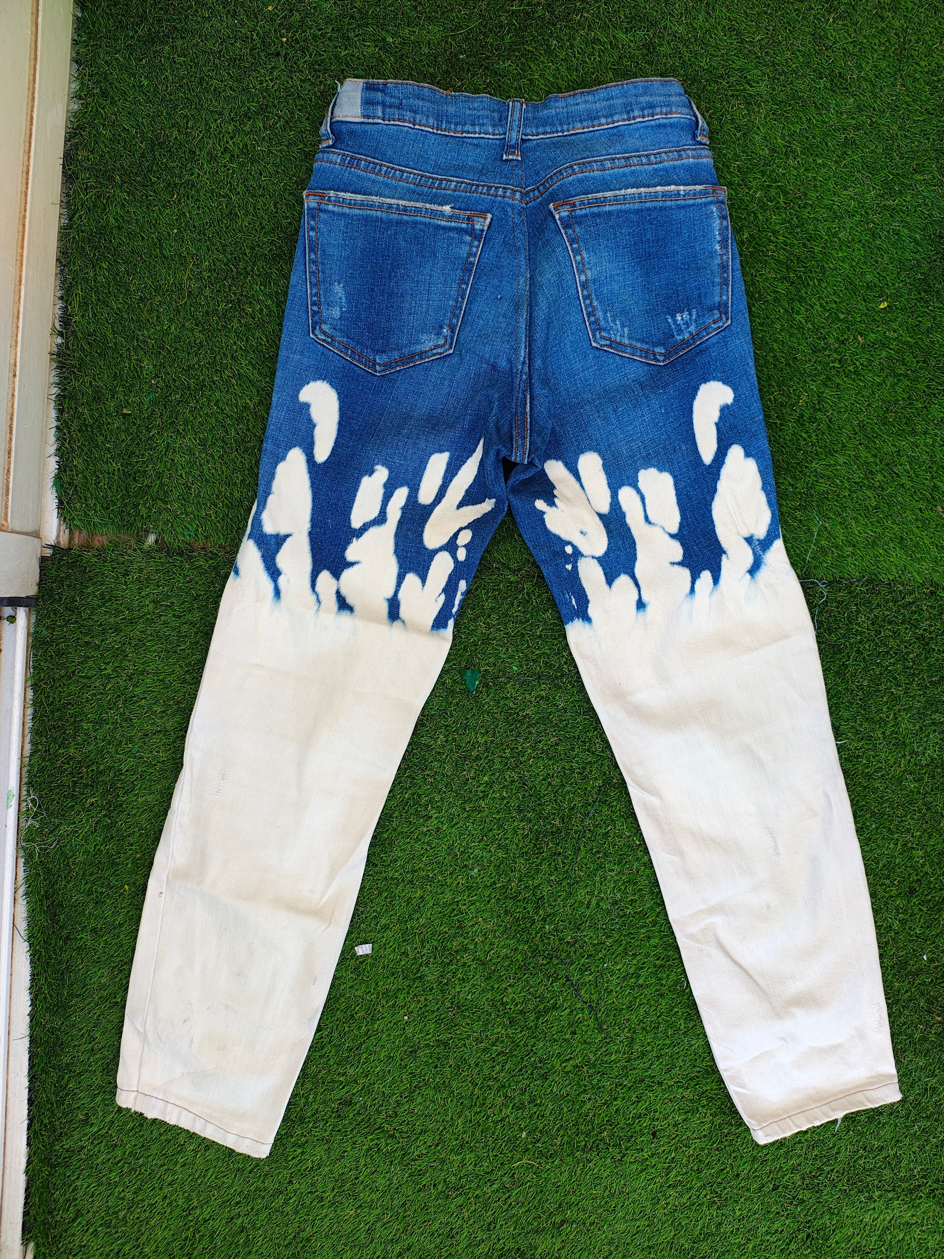Jean tie-dye au design unique, composé d'un haut en denim bleu et d'un bas blanc. Il présente des déchirures décoratives et des patchs cousus sur les deux jambes pour un look urbain et décontracté.