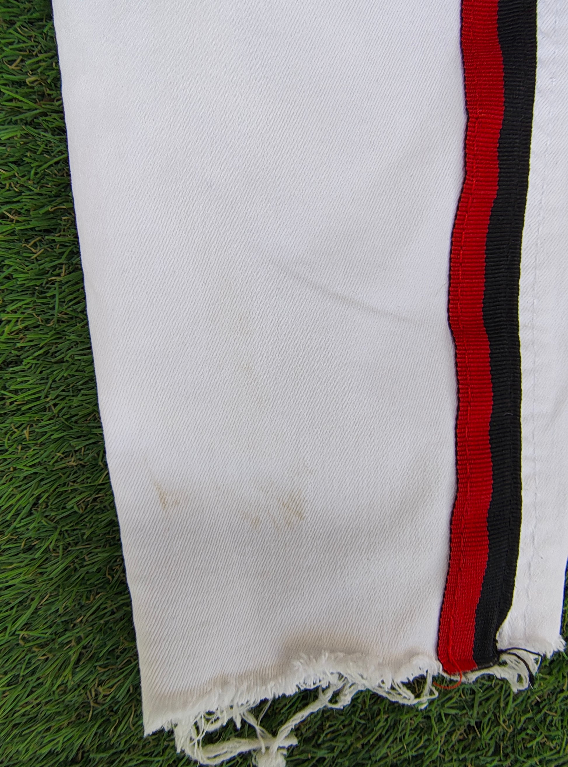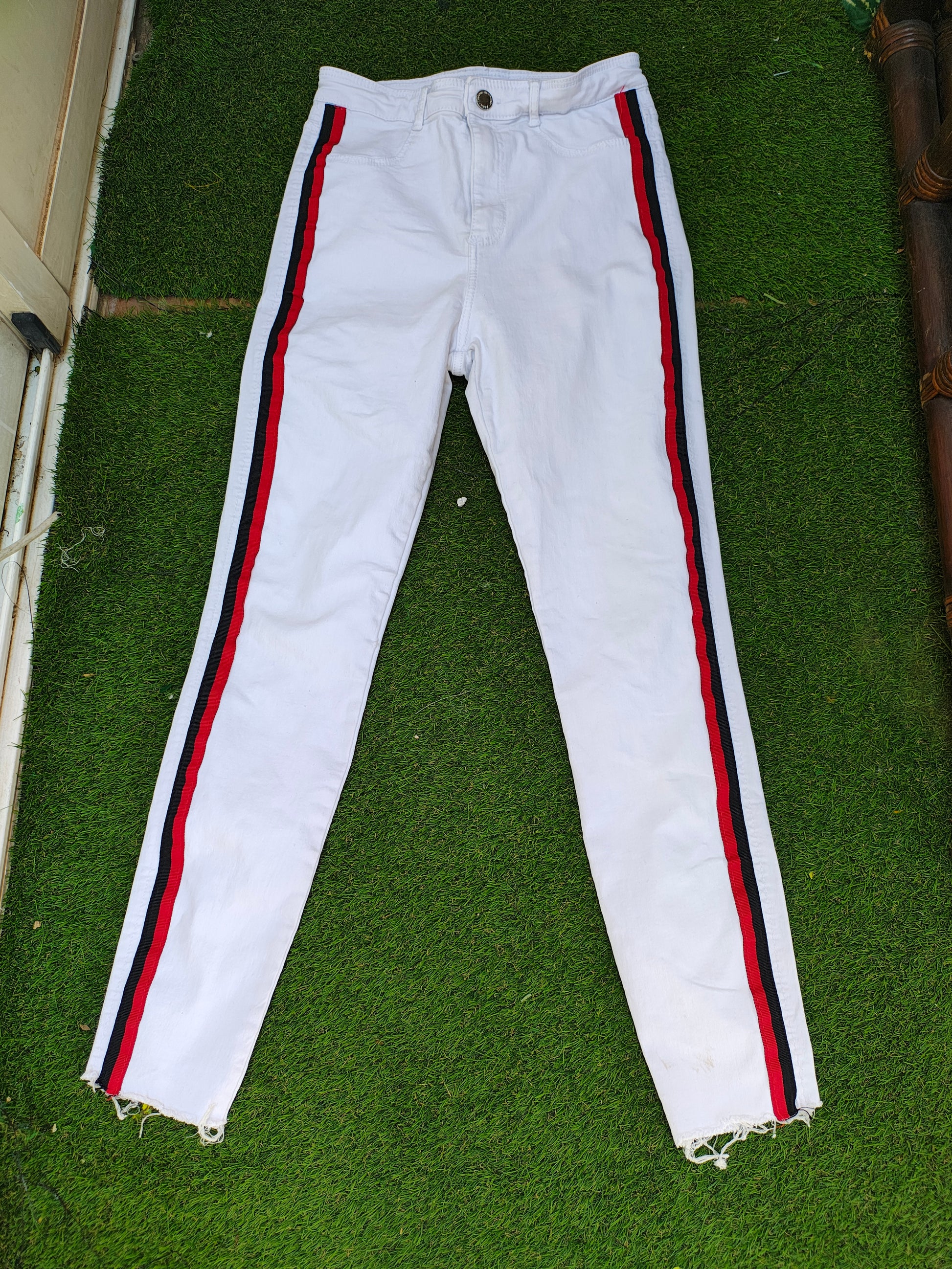 🤍 Pantalón vaquero pitillo en color blanco con franjas laterales en rojo y negro, que aportan un toque sporty y moderno. Bajo deshilachado para un acabado desenfadado y actual. Cierre de botón y cremallera, con bolsillos delanteros y traseros.