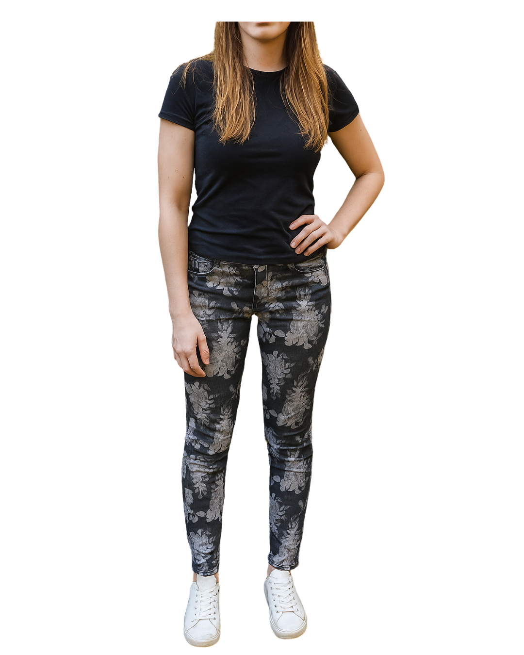 Jean skinny à imprimé floral gris et blanc sur fond noir. Sa coupe slim flatte la silhouette grâce à sa coupe classique à cinq poches et sa fermeture zippée et boutonnée en métal. Idéal pour créer des looks audacieux avec des vêtements unis ou des tenues urbaines de transition.