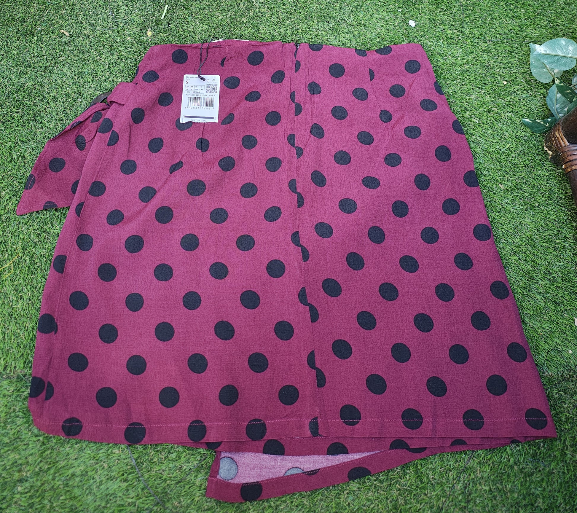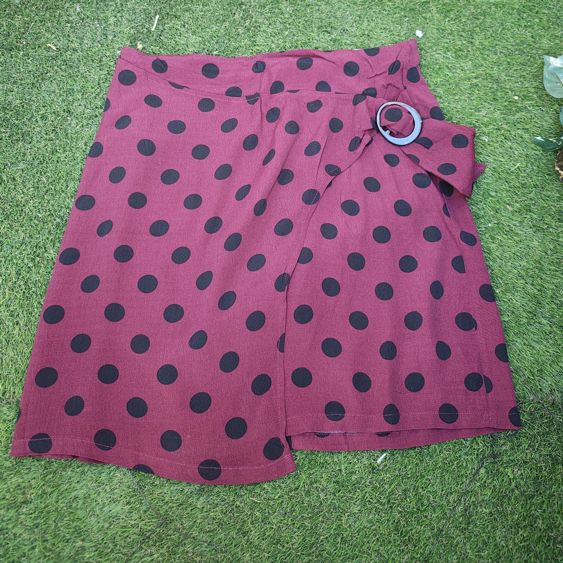 🔴 Falda corta en color granate con estampado de lunares negros, ideal para dar un toque retro y alegre a cualquier outfit. Diseño cruzado con cinturón incorporado y hebilla decorativa que estiliza la cintura.