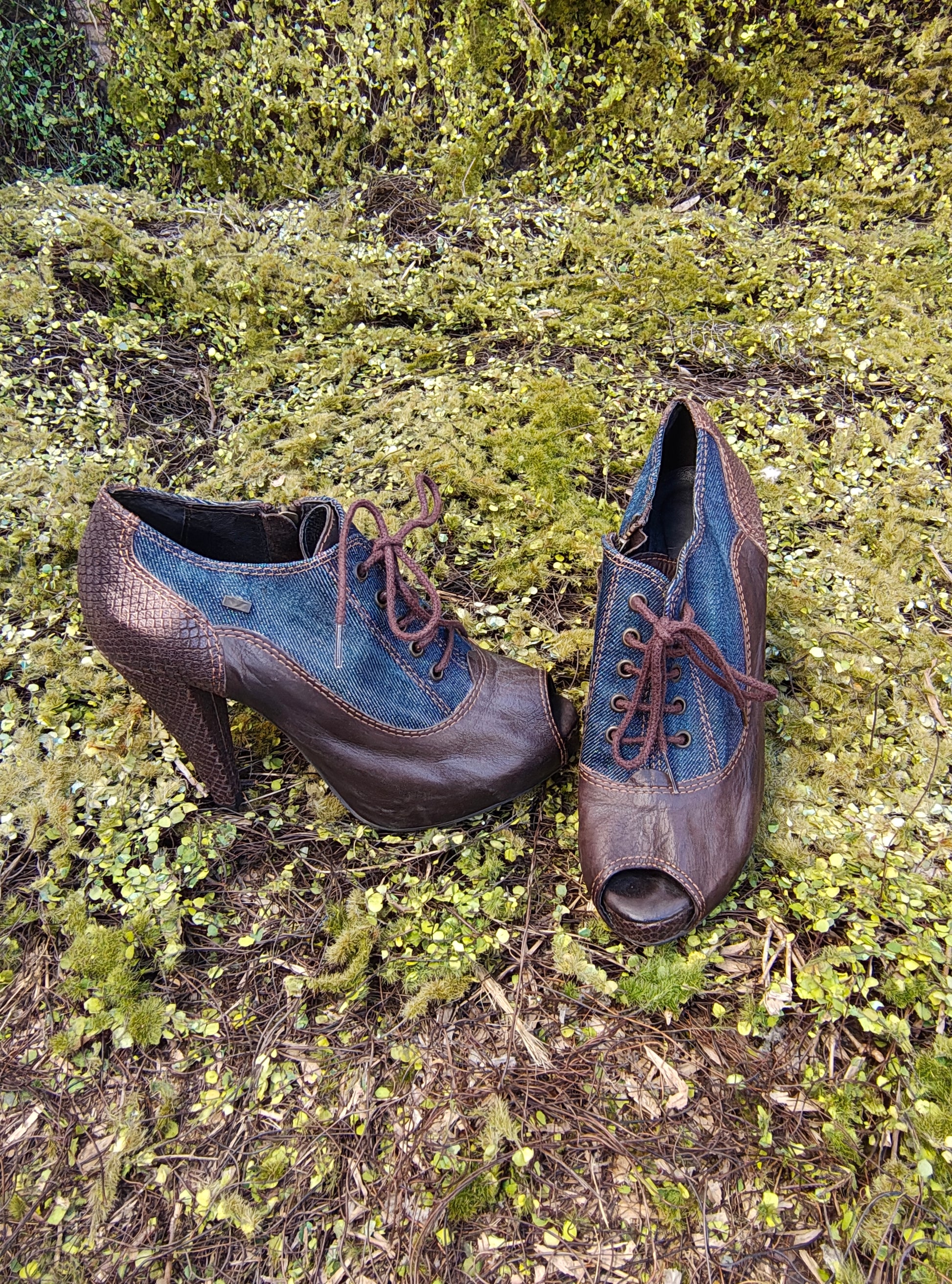 👢 Botines de tacón alto con mezcla de materiales: denim azul y polipiel marrón con textura.