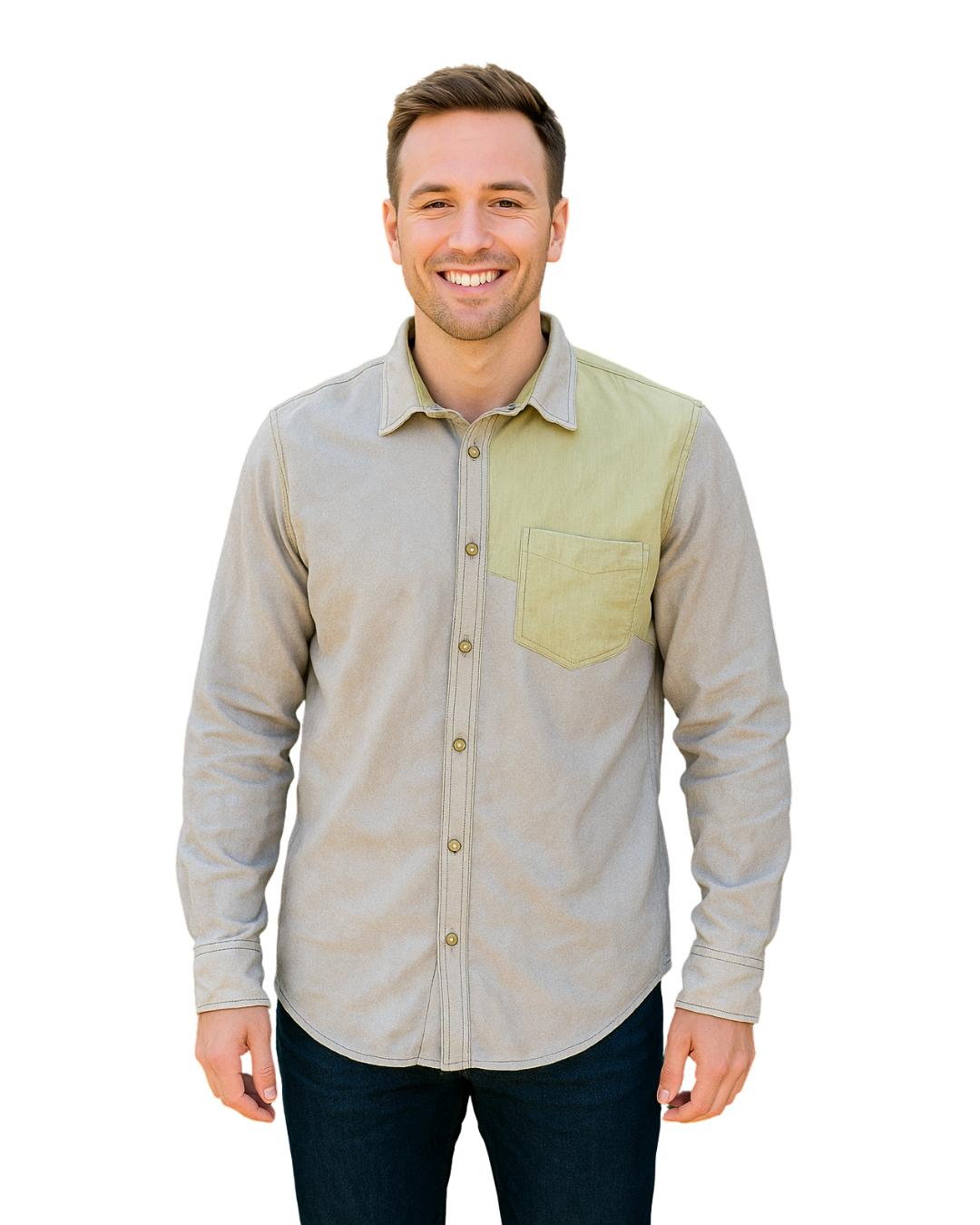 Camisa original de manga larga en tejido 100% algodón con diseño en color beige claro y bloque diagonal en verde lima en el pecho. Corte recto, cierre con botones metálicos y puños con doble botón. Estilo minimalista con un toque moderno y diferenciador, ideal para looks relajados de diario o para combinar con jeans y zapatillas blancas.