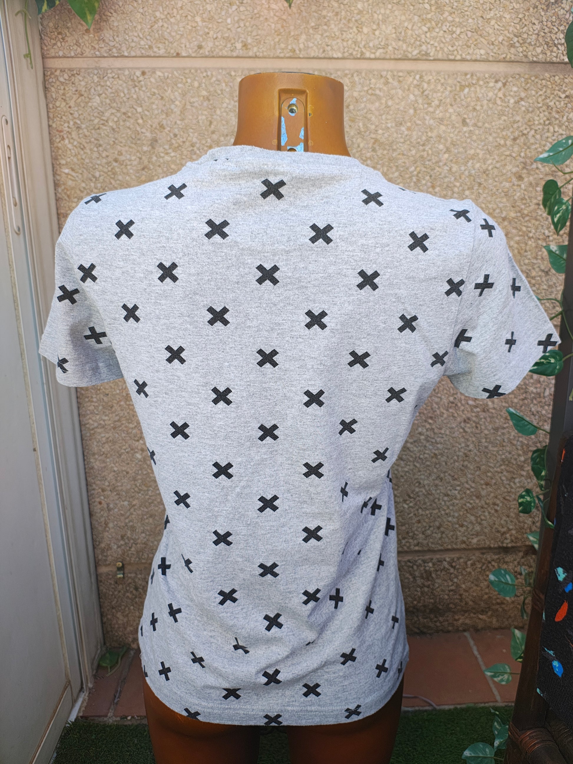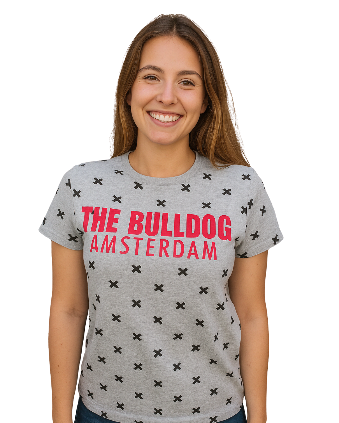 Camiseta gris jaspeada con estampado de cruces negras por toda la prenda y texto en rojo "THE BULLDOG AMSTERDAM" en la parte frontal. Ideal para looks urbanos y Camiseta gris jaspeada con estampado de cruces negras por toda la prenda y texto en rojo "THE BULLDOG AMSTERDAM" en la parte frontal. Ideal para looks urbanos y desenfadados con un toque gráfico.