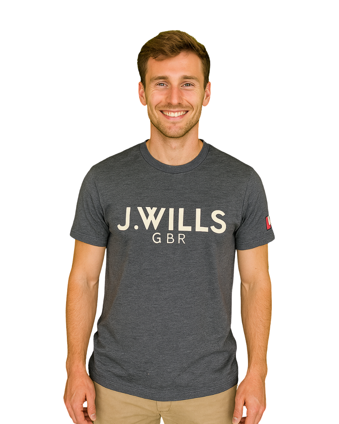 🇬🇧 Camiseta básica de estilo británico en gris oscuro jaspeado con estampado frontal blanco “J. WILLS GBR” y parche con la bandera Union Jack en la manga. Corte clásico (Classic Fit) y tacto suave, ideal para looks casuales o deportivos.