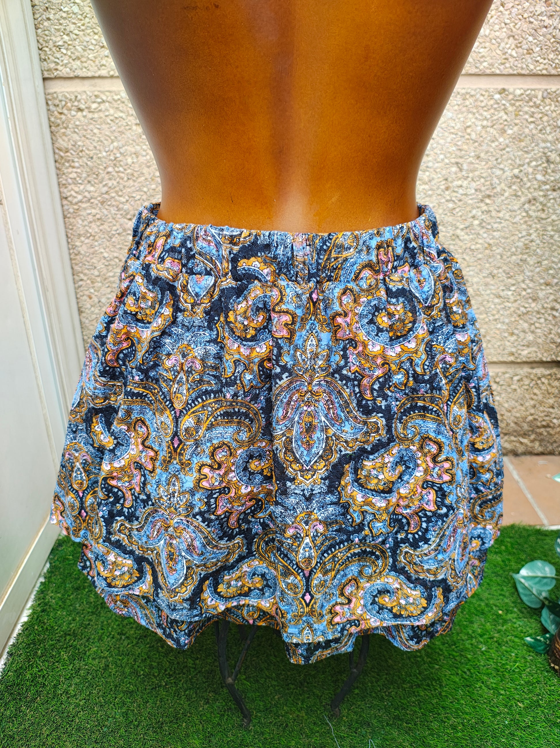 🎨 Falda corta con vuelo en tejido ligero y suave, estampado tipo paisley en tonos azul, naranja, rosa y negro. Aporta color y movimiento a cualquier outfit, ideal para primavera y verano.