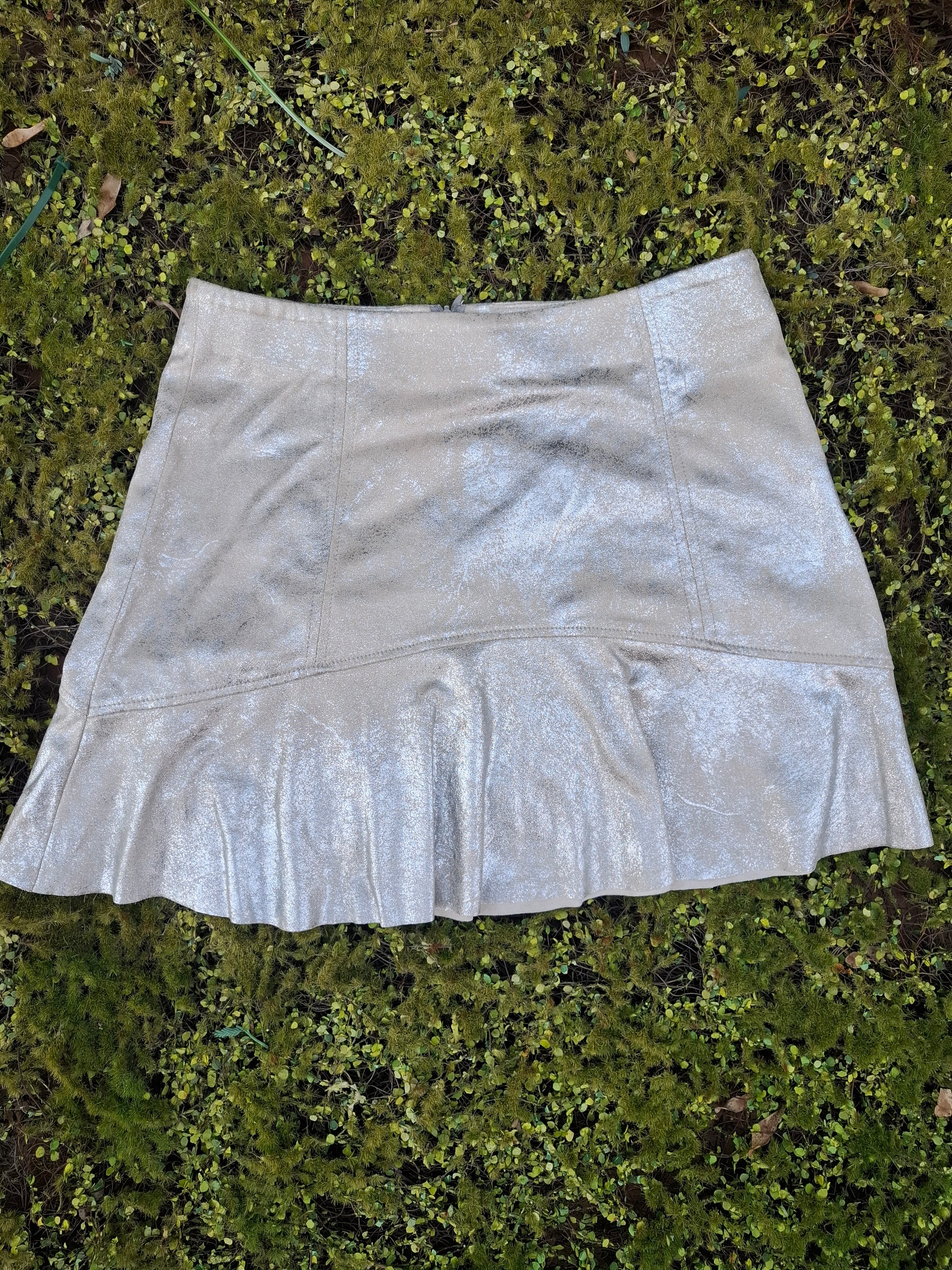 ✨ Falda corta en tono plateado metalizado, con acabado brillante que aporta un aire moderno y sofisticado. Incluye detalle de volante en el bajo que añade movimiento y feminidad al diseño. Ideal para looks de noche, fiestas o para combinar con básicos y elevar un outfit casual.