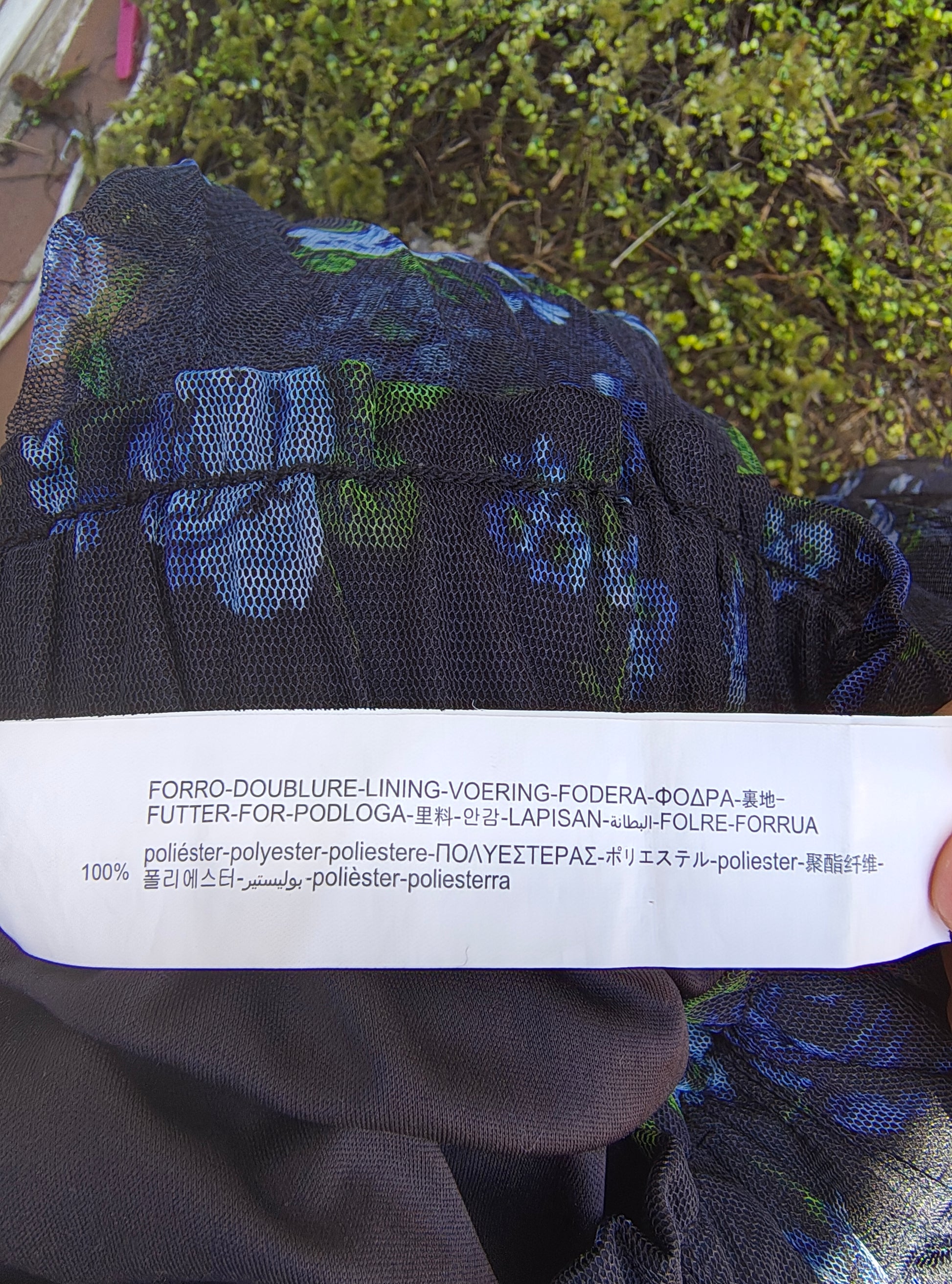 🍁 Falda de largo midi con vuelo y tablas finas en tejido de tul negro semitranslúcido, adornada con delicadas flores en tonos azules y verdes.