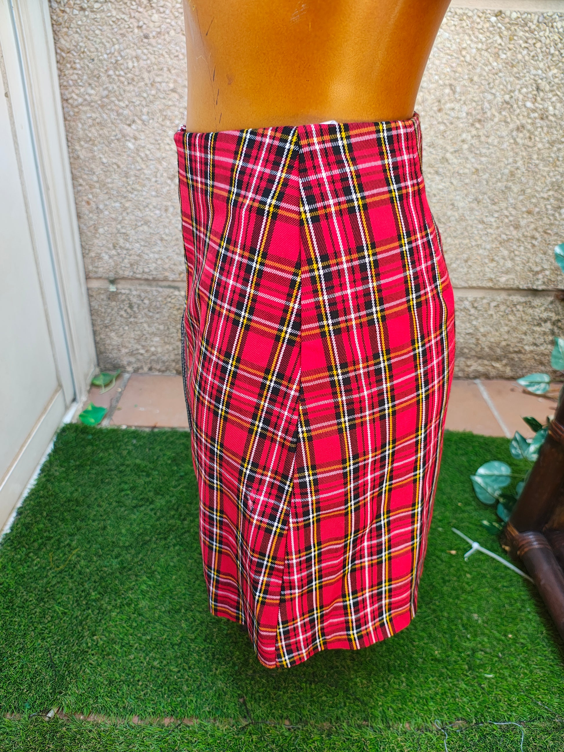 🔴 Falda corta de estilo británico con clásico estampado de cuadros en tonos rojo, negro, blanco y amarillo. Corte recto que se ajusta a la figura con un look moderno y atrevido.